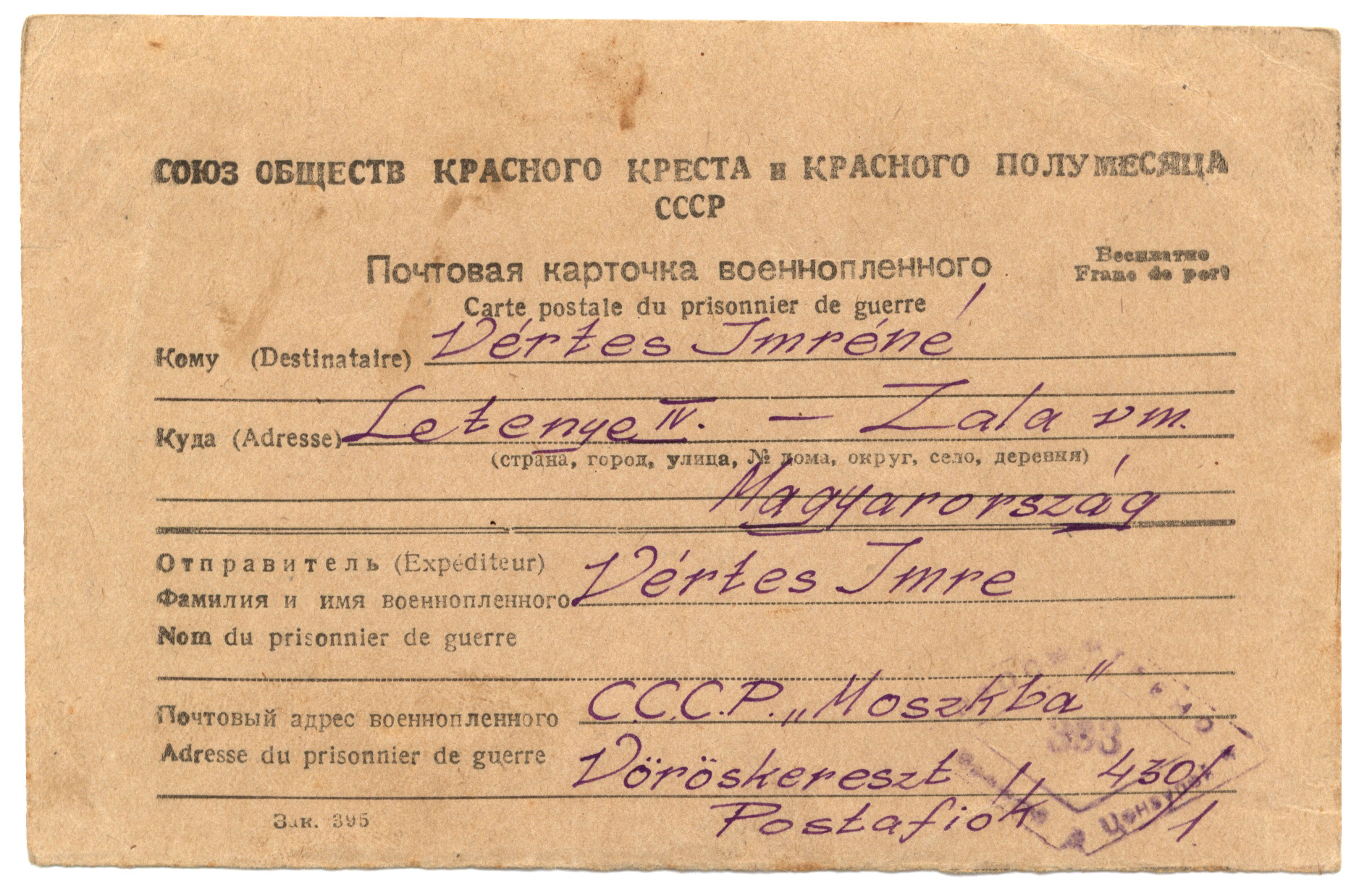 Nyilvános 1262 | 2167 | Vértes Imréné | Letenye IV. - Zala vm. Magyarország Vértes Imre hdgy. C.C.C.P. "Moszkva" Vöröskereszt, Postafiók 430/1. c. 10. IV. hó 1947. (Kaptam V. 12-én) Kedveseim! Húsvét volt, ünnep. Hogy gondoltam Rátok? Így! Volt nékem kis váram, mesekinccsel ékes, Szerelemmel, szívvel, széppel, jóval fényes. Aranyasszony ajka, gyermekkacaj hangja Csilingelt a szívben boldogság harangja. Mit éreztem? Amit Te szoktál érezni-, Sárikám - mikor a négy alvó kisgyerek fölött imát dalol a szíved. Nagy, tiszta, szép vágyat! A szép élet utáni vágyat. Apuka |