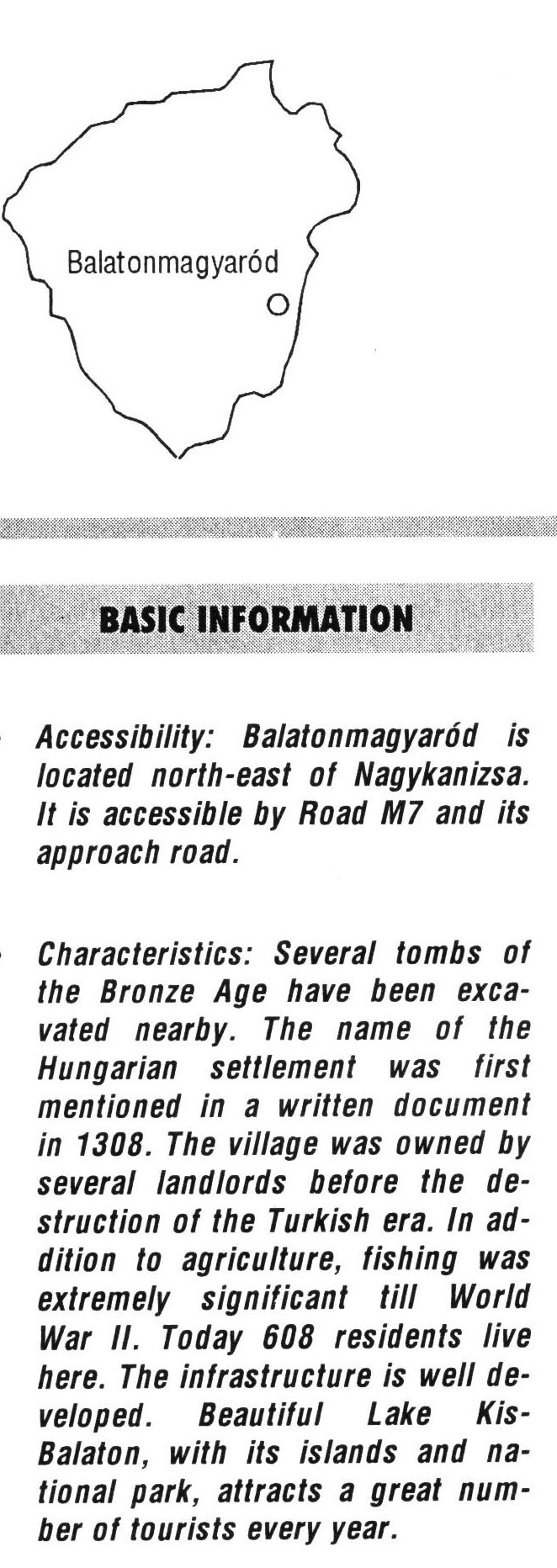 Nyilvános 2053 | 5806 | Balatonmagyaród | BASIC INFORMATION Accessibility: Balatonmagyaród is located north-east of Nagykanizsa. It is accessible by Road M7 and its approach road. Characteristics: Several tombs of the Bronze Age have been excavated nearby. The name of the Hungarian settlement was first mentioned in a written document in 1308. The village was owned by several landlords before the destruction of the Turkish era. In addition to agriculture, fishing was extremely significant till World War II. Today 608 residents live here. The infrastructure is well developed. Beautiful Lake Kis-Balaton, with its islands and national park, attracts a great number of tourists every year. This text came from the following book: Title: Handbook of Zala county (Zala megye kézikönyve) Series: County handbooks of Hungary (Magyarország megyei kézikönyvei) Chief editor: Hóbor József Publisher: (Hatvan), CEBA-Hungary Ltd, 1998 ETO: 908.439.121(035) ; 050.8(439.121) ISBN: 963-9089-18-2 Pages: 488-1040 p. Remark: Closed on: 1998. márc. 31. |