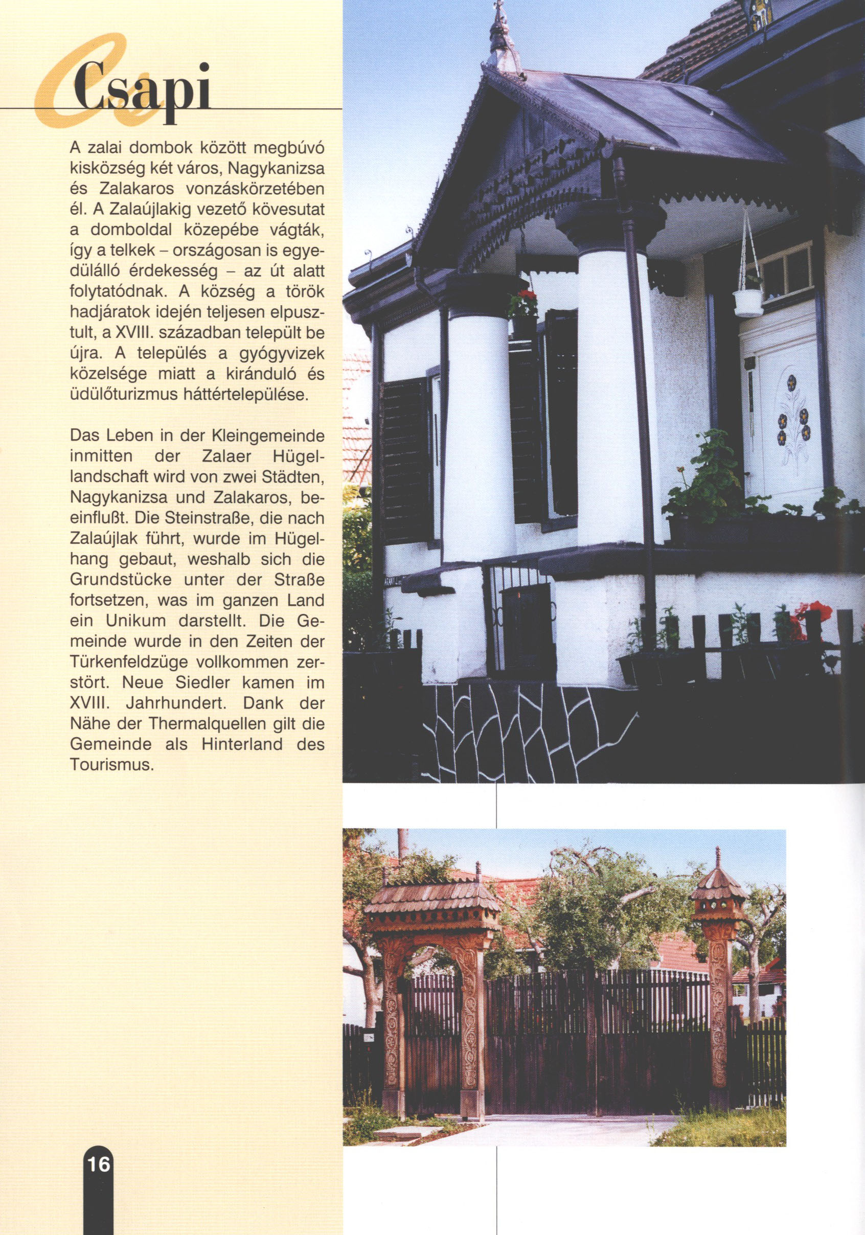 Nyilvános 2176 | 6331 | Rövid leírás | Teljes leírás (1.14 KB) | Csapi Das Leben in der Kleingemeinde inmitten der Zalaer Hügellandschaft wird von zwei Städten, Nagykanizsa und Zalakaros, beeinflußt. Die Steinstraße, die nach Zalaújlak führt, wurde im Hügelhang gebaut, weshalb sich die Grundstücke unter der Straße fortsetzen, was im ganzen Land ein Unikum darstellt. Die Gemeinde wurde in den Zeiten der Türkenfeldzüge vollkommen zerstört. Neue Siedler kamen im XVIII. Jahrhundert. Dank der Nähe der Thermalquellen gilt die Gemeinde als Hinterland des Tourismus. Dieses Text stammt von: Titel: Hívogató a Régiók Kapujában - Útikönyv Látnivalók Nagykanizsán és Térségében (Einladend in dem Tor des Gebiets - Reisebuch - Sehenswürdigkeiten in Nagykanizsa und Umgebung) Herausgegeben von: Nagykanizsa és a Környező Települések Területfejlesztési Társulása (Verein für Gebietsentwicklung in Nagykanizsa und in ihrer Umgebung) 8800 Nagykanizsa, Petőfi Sándor út 5. Tel.: 06 93/536-453 • 06 93/536-454 Tel ./Fax: 06 93/326-323 E-mail: terstars@axelero.hu www.kanizsaterseg.celodin.hu |