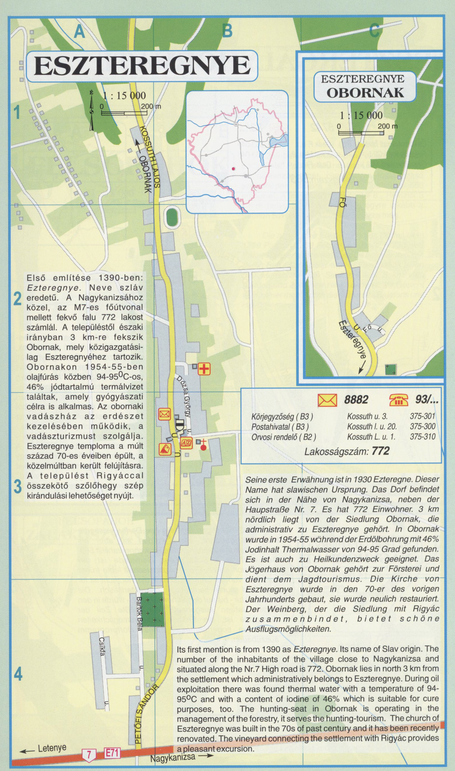 Nyilvános 2467 | 9704 | Eszteregnye | Első említése 1390-ben: Ezteregnye. Neve szláv eredetű. A Nagykanizsához közel, az M7-es főútvonal mellett fekvő falu 772 lakost számlál. A településtől északi irányban 3 km-re fekszik Obornak, mely közigazgatási-lag Eszteregnyéhez tartozik. Obornakon 1954-55-ben olajfúrás közben 94-95°C-os 46% jódtartalmú termálvizet találtak, amely gyógyászati célra is alkalmas. Az obornaki vadászház az erdészet kezelésében működik, a vadászturizmust szolgálja. Eszteregnye temploma a múlt század 70-es éveiben épült, a közelmúltban került felújításra. A települést Rigyáccal összekötő szőlőhegy szép kirándulási lehetőséget nyújt. Seine erste Erwähnung ist in 1930 Ezteregne. Dieser Name hat slawischen Ursprung. Das Dorf befindet sich in der Nähe von Nagykanizsa, neben der Haupstraße Nr. 7. Es hat 772 Einwohner. 3 km nördlich liegt von der Siedlung Obornak, die administrativ zu Eszteregnye gehört. In Obornak wurde in 1954-55 während der Erdölbohrung mit 46% Jodinhalt Thermalwasser von 94-95 Grad gefunden. Es ist auch zu Heilkundenzweck geeignet. Das Jägerhaus von Obornak gehört zur Försterei und dient dem Jagdtourismus. Die Kirche von-Eszteregnye wurde in den 70-er des vorigen Jahrhunderts gebaut, sie wurde neulich restauriert. Der Weinberg, der die Siedlung mit Rigyác zusammenbindet, bietet schöne Ausflugsmöglichkeiten. Its first mention is from 1390 as Ezteregnye. Its name of Slav origin. The number of the inhabitants of the village close to Nagykanizsa and situated along the Nr.7 High road is 772. Obornak lies in north 3 km from the settlement which administratively belongs to Eszteregnye. During oil exploitation there was found thermal water with a temperature of 94-95°C and with a content of iodine of 46% which is suitable for cure purposes, too. The hunting-seat in Obornak is operating in the management of the forestry, it serves the hunting-tourism. The church of. Eszteregnye was built in the 70s of past century and it has been recently\' renovated. The vineyard connecting the settlement with Rigyác provides a pleasant excursion. A részlet a következő kiadványból származik/Die Teile stammen vom volgenden Buch/This text came from the following book: Cím/Titel/Title: Zala megye településeinek atlasza - 257 település részletes térképe/Atlas der Komitat Zala - 257 Detailte Siedlungskarten/Zala county\'s Atlas - 257 settlement maps. Közreműködő/contributor: Lackner László (1943) (fotó) Kiadás/Ausgabe/Publisher: Gyula : HISZI-MAP, 1997 Sorozat/Serie/Series: Indulástól - megérkezésig... ETO: 912(439.121-2) ; 908.439.121 Cutter: Z 19 ISBN: 963-610-025-4 Oldalszám/Seiten/Pages: 323, 81 p. Megjegyzés/Note: Lezárva/Abgeschlossen am/Closed am: 1997. máj. 30. |