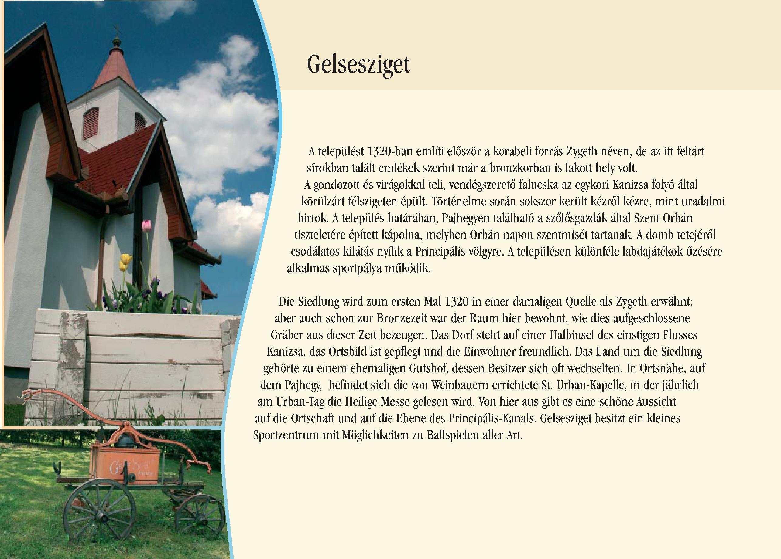Nyilvános 2156 | 7790 | Gelsesziget | Die Siedlung wird zum ersten Mal 1320 in einer damaligen Quelle als Zygeth erwähnt; aber auch schon zur Bronzezeit war der Raum hier bewohnt, wie dies aufgeschlossene Gräber aus dieser Zeit bezeugen. Das Dorf steht auf einer Halbinsel des einstigen Flusses Kanizsa, das Ortsbild ist gepflegt und die Einwohner freundlich. Das Land um die Siedlung gehörte zu einem ehemaligen Gutshof, dessen Besitzer sich oft wechselten. In Ortsnähe, auf dem Pajhegy, befindet sich die von Weinbauern errichtete St. Urban-Kapelle, in der jährlich am Urban-Tag die Heilige Messe gelesen wird. Von hier aus gibt es eine schöne Aussicht auf die Ortschaft und auf die Ebene des Principális-Kanals. Gelsesziget besitzt ein kleines Sportzentrum mit Möglichkeiten zu Ballspielen aller Art. Dieses Text stammt von: Pannonhát tájpark prospektus 2006. Web: http://www.pannonhat.hu/ (auch in Deutsch) |