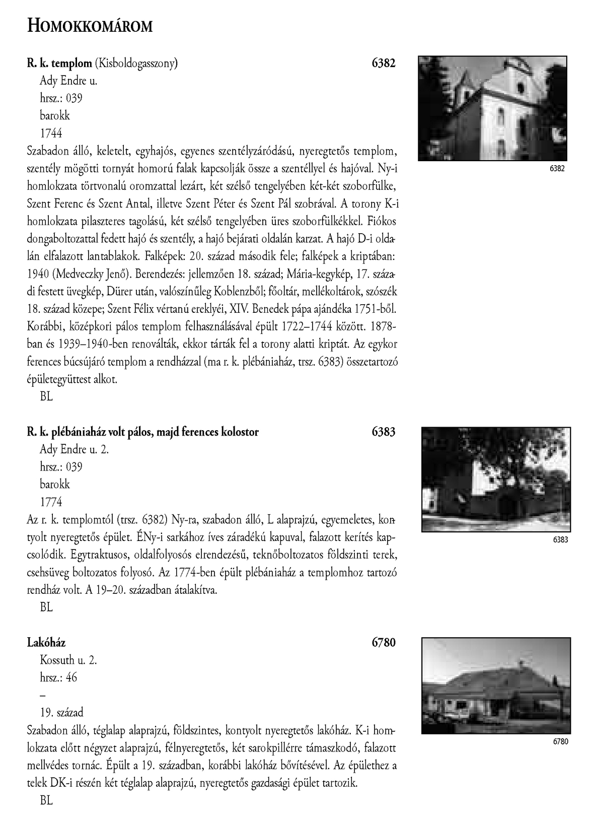 Nyilvános 2170 | 5938 | Homokkomárom - Magyarország műemlékjegyzéke - Zala megye 2006 034-035old | A részlet szövege: HOMOKKOMÁROM 6382 R. k. templom (Kisboldogasszony) 6382 Ady Endre u. hrsz.: 039 barokk 1744 Szabadon álló, keletelt, egyhajós, egyenes szentélyzáródású, nyeregtetős templom, szentély mögötti tornyát homorú falak kapcsolják össze a szentéllyel és hajóval. Ny-i homlokzata törtvonalú oromzattal lezárt, két szélső tengelyében két-két szoborfülke, Szent Ferenc és Szent Antal, illetve Szent Péter és Szent Pál szobrával. A torony K-i homlokzata pilaszteres tagolású, két szélső tengelyében üres szoborfülkékkel. Fiókos dongaboltozattal fedett hajó és szentély, a hajó bejárati oldalán karzat. A hajó D-i oldalán elfalazott lantablakok. Falképek: 20. század második fele; falképek a kriptában: 1940 (Medveczky Jenő). Berendezés: jellemzően 18. század; Mária-kegykép, 17. századi festett üvegkép, Dürer után, valószínűleg Koblenzből; főoltár, mellékoltárok, szószék 18. század közepe; Szent Félix vértanú ereklyéi, XIV. Benedek pápa ajándéka 1751-ből. Korábbi, középkori pálos templom felhasználásával épült 1722–1744 között. 1878ban és 1939–1940-ben renoválták, ekkor tárták fel a torony alatti kriptát. Az egykor ferences búcsújáró templom a rendházzal (ma r. k. plébániaház, trsz. 6383) összetartozó épületegyüttest alkot. BL R. k. plébániaház volt pálos, majd ferences kolostor 6383 Ady Endre u. 2. hrsz.: 039 barokk 1774 Az r. k. templomtól (trsz. 6382) Ny-ra, szabadon álló, L alaprajzú, egyemeletes, kontyolt nyeregtetős épület. ÉNy-i sarkához íves záradékú kapuval, falazott kerítés kapcsolódik. Egytraktusos, oldalfolyosós elrendezésű, teknőboltozatos földszinti terek, csehsüveg boltozatos folyosó. Az 1774-ben épült plébániaház a templomhoz tartozó rendház volt. A 19–20. században átalakítva. BL Lakóház 6780 Kossuth u. 2. hrsz.: 46 – 19. század Szabadon álló, téglalap alaprajzú, földszintes, kontyolt nyeregtetős lakóház. K-i homlokzata előtt négyzet alaprajzú, félnyeregtetős, két sarokpillérre támaszkodó, falazott 6780 mellvédes tornác. Épült a 19. században, korábbi lakóház bővítésével. Az épülethez a telek DK-i részén két téglalap alaprajzú, nyeregtetős gazdasági épület tartozik. BL A részlet a következő könyv online változatából származik: Cím: Magyarország műemlékjegyzéke Közreműködő: Haris Andrea. (szerk.) ; Kulturális Örökségvédelmi Hivatal (Budapest) (közread.) ; Somorjay Sélysette. (szerk.) ; Bardoly István (közrem.) Szerz. közl.: [sorozatszerk. Haris Andrea, Somorjay Sélysette] ; [mtárs Bardoly István] ; [közread. a] Kulturális Örökségvédelmi Hivatal. Kiadás: Budapest : KÖH, 2006 Kötetadat: Zala megye ISBN: 963-86510-7-5 ö ISBN: 963 7474 10 2 Nyelv: magyar A jegyzék a Kultúrális Örökségvédelmi Hivatal honlapján, a következő link alatt található: http://www.koh.hu/index.php?_mp=nyitolap&_amp=MUEML A fejléc adatairól 1. Objektum neve – törzsszám A fejléc első sora a műemlék eredeti rendeltetésének megfelelő nevet tartalmazza. Mögötte zárójelben templom esetében annak titulusa, más épületeknél indokolt esetben az eredeti rendeltetéstől eltérő, mai használatra utaló intézmény név (pl. városháza, múzeum, szálloda, oktatási intézmény hivatalos neve, stb.) olvasható. A törzsszám (trsz.) a műemlék egyetlen soha nem változó adata. A gyors azonosítás, illetve a törzsszám szerinti keresés lehetősége végett az objektummal egy sorban, a fejléc jobb szélén kiemelten jelenik meg. Összetartozó műemlék részek vagy történetileg egy együttest alkotó műemlékek sokszor külön törzsszámon lettek műemlékké nyilvánítva. Előfordulhat ezért, hogy egy fejléc alatt a leíró részben több, külön törzsszámmal rendelkező objektum szerepel. A törzsszámot ezekben az esetekben is az objektummal egy sorban tüntetjük fel. 2. Utca, házszám Egy utcán belül, amennyiben a számozás ezt lehetővé teszi, először a templomot adjuk meg, ezt követi a parókia, majd egyéb objektumok, pl. szobrok következnek. Házszám nélkül említünk egyes műemlékfajtákat (elsősorban templomokat), amennyiben a topográfiai azonosítás szempontjából a házszám közömbös vagy éppen zavaró. Előfordul, hogy a műemlék nem köthető nevesített közterülethez. Az ilyeneket a település végéhez soroltuk, és a leírásban kitértünk a településen belül elfoglalt helyükre. 3. Helyrajzi szám Ha egy helyrajzi számon és egy címen (pl. temetőben) több, külön törzsszámmal védett objektum van, akkor az együttesre utaló műemlék megnevezés alatt a közös adatokat egyszer adjuk meg. Ezt követően külön címszavanként következik a műemlékek leírása. Ilyen esetben az emlékeket mutatóztuk. Ezt az eljárást követtük, tekintet nélkül arra, hogy a teljes együttes védett-e vagy sem. (Védett együttes mellett mindig törzsszám szerepel.) Ha több helyrajzi szám is tartozik egy törzsszámhoz, akkor a fejlécben valamennyi számot feltüntettük. Amennyiben ilyen esetben több elemből álló műemlékről van szó, akkor a leíró részben minden külön említett elem után zárójelben megadjuk a vonatkozó helyrajzi számot. 4. Stílus A műemléket jelenleg meghatározó, domináns stílusjegy alapján került meghatározásra. Egyéb, érzékelhető stíluselemekre a leíró részben utalunk. 5. Datálás A műemléket jelenleg leginkább jellemző építési dátum. Korábbi építési periódusokra, illetve későbbi átépítésekre a történeti részben utalunk, fennmaradt részletek esetén lehetőség szerint azokra vonatkoztatva. A leírás A műemlékek leírása tartalmilag öt szakaszból áll, amely folyamatos szövegként jeleni