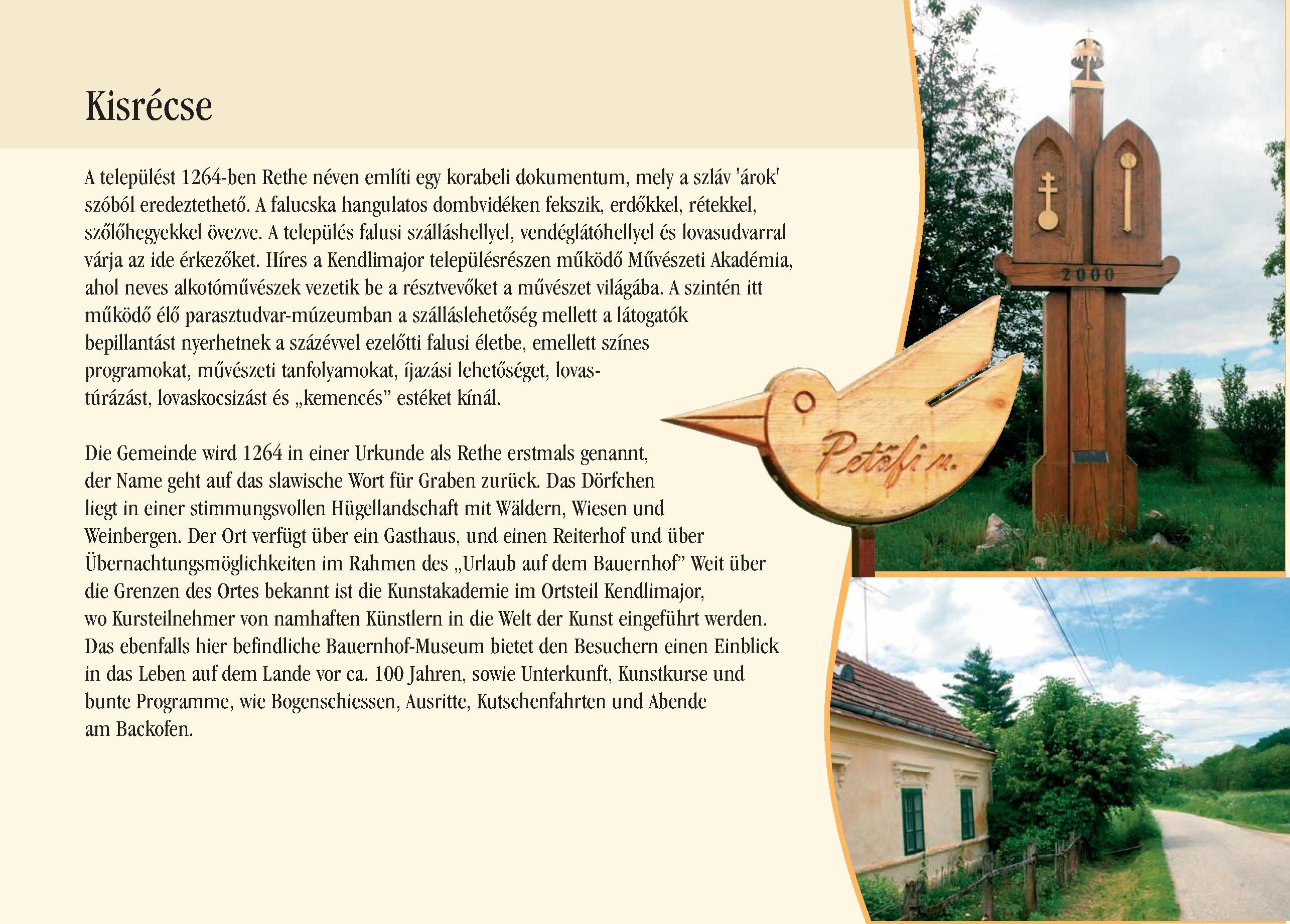 Nyilvános 2131 | 6214 | Kisrécse | Die Gemeinde wird 1264 in einer Urkunde als Rethe erstmals genannt, der Name geht auf das slawische Wort für Graben zurück. Das Dörfchen liegt in einer stimmungsvollen Hügellandschaft mit Wäldern, Wiesen und Weinbergen. Der Ort verfügt über ein Gasthaus, und einen Reiterhof und über Übernachtungsmöglichkeiten im Rahmen des ,,Urlaub auf dem Bauernhof" Weit über die Grenzen des Ortes bekannt ist die Kunstakademie im Ortsteil Kendlimajor, wo Kursteilnehmer von namhaften Künstlern in die Welt der Kunst eingeführt werden. Das ebenfalls hier befindliche Bauernhof-Museum bietet den Besuchern einen Einblick in das Leben auf dem Lande vor ca. 100 Jahren, sowie Unterkunft, Kunstkurse und bunte Programme, wie Bogenschiessen, Ausritte, Kutschenfahrten und Abende am Backofen. Dieses Text stammt von: Pannonhát tájpark prospektus 2006. Web: http://www.pannonhat.hu/ (auch in Deutsch) |