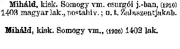 Nyilvános 2189 | 5502 | Miháld | kisk. Somogy vm. csurgói j. -ban, (1910) 1403 magyar lak., postahiv.; u. t. Zalaszentjakab. Miháld kisk. Somogy vm., (1920) 1402 lak. Cím: Révai nagy lexikona Alcím: az ismeretek enciklopédiája Kiadás: Budapest : Révai testvérek, [1911]- Kötetei: 1. köt., A - Arany 2. köt., Arány - Beke 3. köt., Béke - Brutto 4. köt., Bratus - Csát 5. köt., Csata - Duc 6. köt., Duc - Etele 7. köt., Stelka - Földöv 8. köt., Földpálya - Gres 9. köt., Gréc - Herold 10. köt., Hérold - Jób 11. köt., Jób - Nontur 12. köt., Kontúr - Lovas 13. köt., Lovas - Mons 14. köt., Mens - Ottó 15. köt., Ottó - Racine 16. köt., Racine - Sodoma 17. köt., Sodoma - Tarján 18. köt., 19. köt., Vár - Zsüri | Kiegészítés Aachen - Beöthy 20. köt., Kiegészítés: Bér - Zsolt ETO jelzet: 03=945.11 Szakjelzet: 030 Cutter: R 62 Nyelv: magyar |