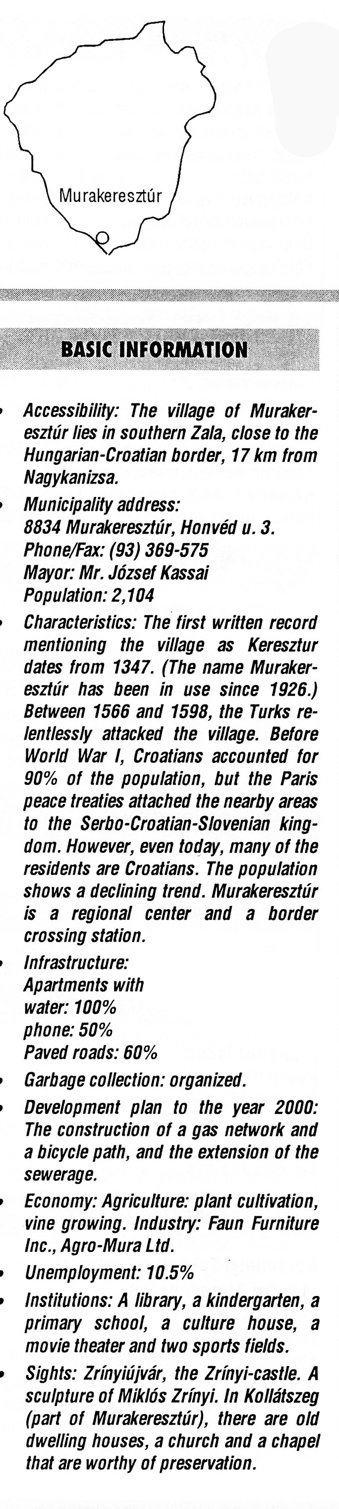 Nyilvános 1823 | 5451 | Murakeresztúr | BASIC INFORMATION Accessibility: The village of Murakeresztúr lies in southern Zala, close to the Hungarian-Croatian border, 17 km from Nagykanizsa. Municipality address: 8834 Murakeresztúr, Honvéd u. 3. Phone/Fax: (93) 369-575 Mayor: Mr. József Kassai Population: 2,104 Characteristics: The first written record mentioning the village as Keresztur dates from 1347. (The name Murakeresztúr has been in use since 1926.) Between 1566 and 1598, the Turks relentlessly attacked the village. Before World War I, Croatians accounted for 90% of the population, but the Paris peace treaties attached the nearby areas to the Serbo-Croatian-Slovenian kingdom. However, even today, many of the residents are Croatians. The population shows a declining trend. Murakeresztúr is a regional center and a border crossing station. Infrastructure: Apartments with water: 100% phone: 50% Paved roads: 60% Garbage collection: organized. Development plan to the year 2000: The construction of a gas network and a bicycle path, and the extension of the sewerage. Economy: Agriculture: plant cultivation, vine growing. Industry: Faun Furniture Inc., Agro-Mura Ltd. Unemployment: 10.5% Institutions: A library, a kindergarten, a primary school, a culture house, a movie theater and two sports fields. Sights: Zrínyiújvár, the Zrínyi-castle. A sculpture of Miklós Zrínyi. In Kollátszeg (part of Murakeresztúr), there are old dwelling houses, a church and a chapel that are worthy of preservation. This text came from the following book: Title: Handbook of Zala county (Zala megye kézikönyve) Series: County handbooks of Hungary (Magyarország megyei kézikönyvei) Chief editor: Hóbor József Publisher: (Hatvan), CEBA-Hungary Ltd, 1998 ETO: 908.439.121(035) ; 050.8(439.121) ISBN: 963-9089-18-2 Pages: 488-1040 p. Remark: Closed on: 1998. márc. 31. |