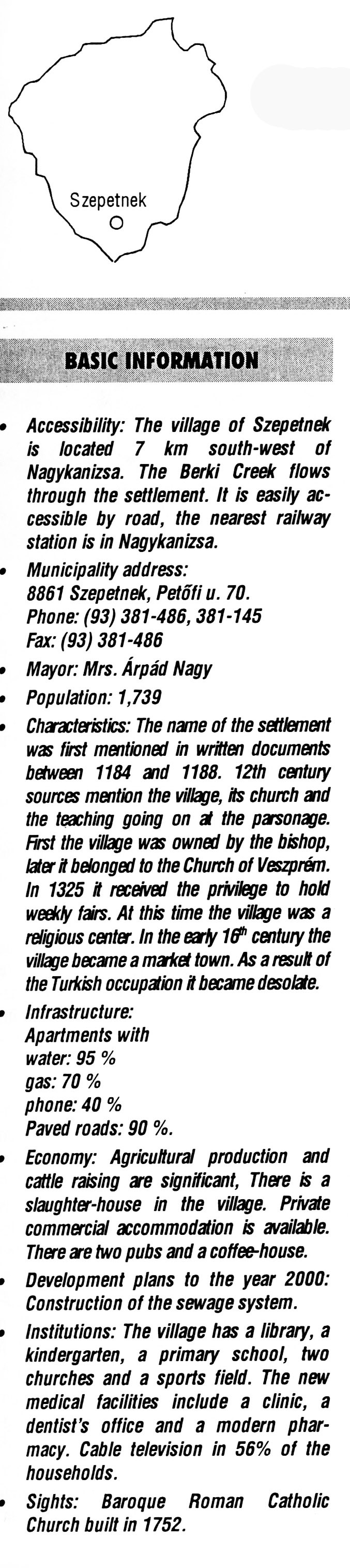 Nyilvános 1996 | 5488 | Szepetnek | BASIC INFORMATION Accessibility: The village of Szepetnek is located 7 km south-west of Nagykanizsa. The Berki Creek flows through the settlement. It is easily accessible by road, the nearest railway station is in Nagykanizsa. Municipality address: 8861 Szepetnek, Petőfi u. 70. Phone: (93) 381-486, 381-145 Fax: (93) 381-486 Mayor: Mrs. Árpád Nagy Population: 1,739 Characteristics: The name of the settlement was first mentioned in written documents between 1184 and 1188. 12th century sources mention the village, its church and the teaching going on at the parsonage. First the village was owned by the bishop, later it belonged to the Church of Veszprém. In 1325 it received the privilege to hold weekly fairs. At this time the village was a religious center. In the early 16th century the village became a market town. As a result of the Turkish occupation it became desolate. Infrastructure: Apartments with water: 95 % gas: 70 % phone: 40 % Paved roads: 90 %. Economy: Agricultural production and cattle raising are significant, There is a slaughter-house in the village. Private commercial accommodation is available. There are two pubs and a coffee-house. Development plans to the year 2000: Construction of the sewage system. Institutions: The village has a library, a kindergarten, a primary school, two churches and a sports field. The new medical facilities include a clinic, a dentist\'s office and a modern pharmacy. Cable television in 56% of the households. Sights: Baroque Roman Catholic Church built in 1752. This text came from the following book: Title: Handbook of Zala county (Zala megye kézikönyve) Series: County handbooks of Hungary (Magyarország megyei kézikönyvei) Chief editor: Hóbor József Publisher: (Hatvan), CEBA-Hungary Ltd, 1998 ETO: 908.439.121(035) ; 050.8(439.121) ISBN: 963-9089-18-2 Pages: 488-1040 p. Remark: Closed on: 1998. márc. 31. |