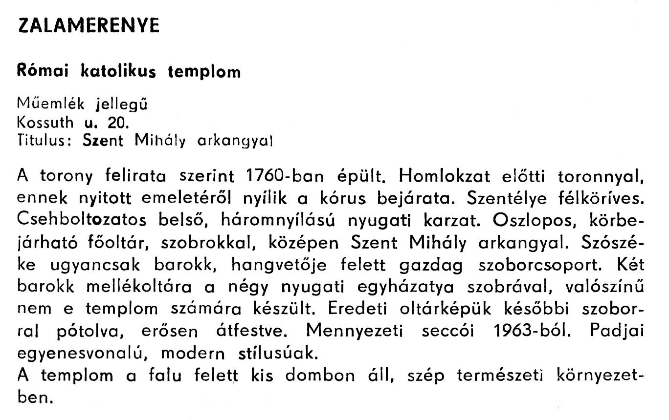 Nyilvános 1476 | 4108 | Rövid leírás | Teljes leírás (1.52 KB) | Zalamerenye - Zala megye műemlékei 1979 119old A részlet szövege: ZALAMERENYE Római katolikus templom Műemlék jellegű Kossuth u. 20. Titulus: Szent Mihály arkangyal A torony felirata szerint 1760-ban épült. Homlokzat előtti toronnyal, ennek nyitott emeletéről nyílik a kórus bejárata. Szentélye félköríves. Csehboltozatos belső, háromnyílású nyugati karzat. Oszlopos, körbejárható főoltár, szobrokkal, középen Szent Mihály arkangyal. Szószéke ugyancsak barokk, hangvetője felett gazdag szoborcsoport. Két barokk mellékoltára a négy nyugati egyházatya szobrával, valószínű nem e templom számára készült. Eredeti oltárképük későbbi szoborral pótolva, erősen átfestve. Mennyezeti seccói 1963-ból. Padjai egyenesvonalú, modern stílusúak. A templom a falu felett kis dombon áll, szép természeti környezetben. A részlet a következő könyvből származik: Cím: Zala megye műemlékei Szerző: Németh József (1928) Közreműködő: Vándor László (szerk.) ; Szabóky Zsolt (1941) (fotó) Szerz. közl.: Németh József ; [szerk. Vándor László] ; [fotók... Szabóky Zsolt] Kiadás jelzés: 2. bőv. kiad. Kiadás: Zalaegerszeg : Zalai Ny., 1979 ETO jelzet: 72(439.121) ; 7.025.3/.4(439.121) ; 908.439.121 Tárgyszó: Zala Szakjelzet: 908 Cutter: N 53 Nyelv: magyar Oldalszám: 134 p. |