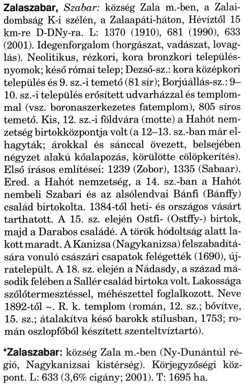 Nyilvános 2210 | 5749 | A szócikkek felismertetett szövege: | (A csillag után a kiegészítő kötetből származó szöveg következik) Zalaszabar, Szabar: község Zala m.-ben, a Zalai-dombság K-i szélén, a Zalaapáti-háton, Hévíztől 15 km-re D-DNy-ra. L: 1370 (1910), 681 (1990), 633 (2001). Idegenforgalom (horgászat, vadászat, lovaglás). Neolitikus, rézkori, kora bronzkori településnyomok; késő római telep; Dezső-sz.: kora középkori település és 9. sz.-i temető (81 sír); Borjúállás-sz.: 9— 10. sz.-i település erősített udvarházzal és templommal (vsz. boronaszerkezetes fatemplom), 805 síros temető. Kis, 12. sz.-i földvára (motte) a Hahót nemzetség birtokközpontja volt (a 12—13. sz.-ban már elhagyták; árokkal és sánccal övezett, belsejében négyzet alakú kőalapozás, körülötte cölöpkerítés). Első írásos említései: 1239 (Zobor), 1335 (Sabaar). Ered. a Hahót nemzetség, a 14. sz.-ban a Hahót nembeli Szabari és az alsólendvai Bánfi (Bánffy) család birtokolta. 1384-től heti- és országos vásárt tarthatott. A 15. sz. elején Ostfi- (Ostffy-) birtok, majd a Darabos családé. A török hódoltság alatt lakott maradt. A Kanizsa (Nagykanizsa) felszabadítására vonuló császári csapatok felégették (1690), újratelepült. A 18. sz. elején a Nádasdy, a század második felében a Sallér család birtoka volt. Lakossága szőlőtermesztéssel, méhészettel foglalkozott. Neve 1892-től ~. R. k. templom (román, 12. sz.; bővítve, 15. sz.; átalakítva késő barokk stílusban, 1753; román oszlopfőből készített szenteltvíztartó). *Zalaszabar: község Zala m.-ben (Ny-Dunántúl régió, Nagykanizsai kistérség). Körjegyzőségi központ. L: 633 (3,6% cigány; 2001). T: 1695 ha. A szócikkek a következő lexikonból származnak: Cím: Magyar nagylexikon Közreműködő: Élesztős László (1949) (szerk.) ; Barabás Éva (1943) (szerk.) ; Berényi Gábor (1946) (szerk.) ; Bárány Lászlóné (szerk.) ; Adelmann-né Kertész Judit (1945) (közrem.) ; Froemel Károlyné Jáky Éva (1936) (közrem.) ; Akadémiai Kiadó és Nyomda Vállala Szerz. közl.: [... Élesztős László főszerk.] ; [szerk. Barabás Éva et al.] ; [bibliogr. Adelmanné Kertész Judit] ; [kész. az Akadémiai Kiadó Magyar Nagylexikon Szerkesztőségében] Kiadás: Budapest : Akad. K., 1993- Kötetei: 1. köt., A - Anc 2. köt., And - Bag 3. köt., Bah - Bij 4. köt., Bik - Bz 5. köt., C - Csem 6. köt., Csen - Ec 7. köt., Ed - Fe 8. köt., Ff - Gyep 9. köt., Gyer - Iq 10. köt., Ir - Kip 11. köt., Kir - Lem 12. köt., Len - Mep 13. köt., Mer - Nyk 14. köt., Nyl - Pom 15. köt., Pon - Sek 16. köt., Sel - Szö 17. köt., Szp - Ung 18. köt., Unh - Z 19. köt., Kiegészítő kötet, A - Z ETO jelzet: 030=945.11 Szakjelzet: 030 Cutter: M 14 ISBN: 963-05-6611-7 [!ISBN 963-05-6615-X] Nyelv: magyar Megjegyzés: Az 5. kötettől kiad. a Magyar Nagylexikon Kiadó ; A 6. kötettől főszerk. Berényi Gábor ; A 6. kötettől szakszerk. Bárány Lászlóné et al. ; A 6. kötettől bibliogr. Froemel Károlyné ; Bibliogr. a szócikkek végén |