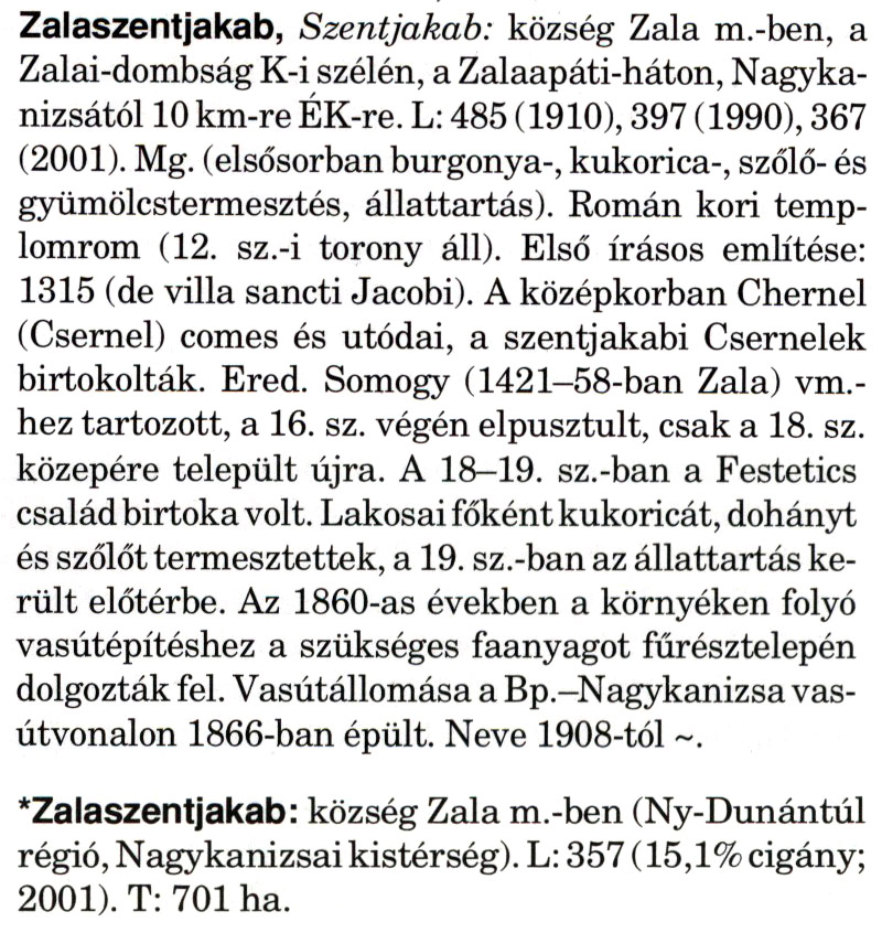 Nyilvános 1888 | 5365 | A szócikkek felismertetett szövege: | (A csillag után a kiegészítő kötetből származó szöveg következik) Zalaszentjakab, Szentjakab: község Zala m.-ben, a Zalai-dombság K-i szélén, a Zalaapáti-háton, Nagykanizsától 10 km-re ÉK-re. L: 485 (1910), 397 (1990), 367 (2001). Mg. (elsősorban burgonya-, kukorica-, szőlő- és gyümölcstermesztés, állattartás). Román kori templomrom (12. sz.-i torony áll). Első írásos említése: 1315 (de villa sancti Jacobi). A középkorban Chernel (Csernel) comes és utódai, a szentjakabi Csernelek birtokolták. Ered. Somogy (1421-58-ban Zala) vm.-hez tartozott, a 16. sz. végén elpusztult, csak a 18. sz. közepére települt újra. A 18—19. sz.-ban a Festetics család birtoka volt. Lakosai főként kukoricát, dohányt és szőlőt termesztettek, a 19. sz.-ban az állattartás került előtérbe. Az 1860-as években a környéken folyó vasútépítéshez a szükséges faanyagot fűrésztelepén dolgozták fel. Vasútállomása a Bp.-Nagykanizsa vasútvonalon 1866-ban épült. Neve 1908-tól ~. *Zalaszentjakab: község Zala m.-ben (Ny-Dunántúl régió, Nagykanizsai kistérség). L: 357 (15,1% cigány; 2001). T: 701 ha. A szócikkek a következő lexikonból származnak: Cím: Magyar nagylexikon Közreműködő: Élesztős László (1949) (szerk.) ; Barabás Éva (1943) (szerk.) ; Berényi Gábor (1946) (szerk.) ; Bárány Lászlóné (szerk.) ; Adelmann-né Kertész Judit (1945) (közrem.) ; Froemel Károlyné Jáky Éva (1936) (közrem.) ; Akadémiai Kiadó és Nyomda Vállala Szerz. közl.: [... Élesztős László főszerk.] ; [szerk. Barabás Éva et al.] ; [bibliogr. Adelmanné Kertész Judit] ; [kész. az Akadémiai Kiadó Magyar Nagylexikon Szerkesztőségében] Kiadás: Budapest : Akad. K., 1993- Kötetei: 1. köt., A - Anc 2. köt., And - Bag 3. köt., Bah - Bij 4. köt., Bik - Bz 5. köt., C - Csem 6. köt., Csen - Ec 7. köt., Ed - Fe 8. köt., Ff - Gyep 9. köt., Gyer - Iq 10. köt., Ir - Kip 11. köt., Kir - Lem 12. köt., Len - Mep 13. köt., Mer - Nyk 14. köt., Nyl - Pom 15. köt., Pon - Sek 16. köt., Sel - Szö 17. köt., Szp - Ung 18. köt., Unh - Z 19. köt., Kiegészítő kötet, A - Z ETO jelzet: 030=945.11 Szakjelzet: 030 Cutter: M 14 ISBN: 963-05-6611-7 [!ISBN 963-05-6615-X] Nyelv: magyar Megjegyzés: Az 5. kötettől kiad. a Magyar Nagylexikon Kiadó ; A 6. kötettől főszerk. Berényi Gábor ; A 6. kötettől szakszerk. Bárány Lászlóné et al. ; A 6. kötettől bibliogr. Froemel Károlyné ; Bibliogr. a szócikkek végén |