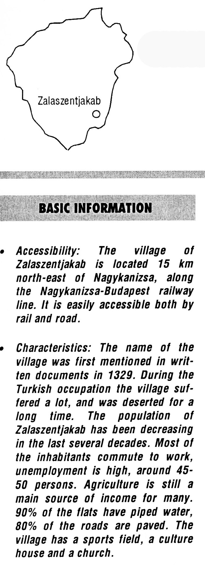 Nyilvános 1899 | 5455 | Rövid leírás | Teljes leírás (1.2 KB) | Zalaszentjakab BASIC INFORMATION Accessibility: The village of Zalaszentjakab is located 15 km north-east of Nagykanizsa, along the Nagykanizsa-Budapest railway line. It is easily accessible both by rail and road. Characteristics: The name of the village was first mentioned in written documents in 1329. During the Turkish occupation the village suffered a lot, and was deserted for a long time. The population of Zalaszentjakab has been decreasing in the last several decades. Most of the inhabitants commute to work, unemployment is high, around 45-50 persons. Agriculture is still a main source of income for many. 90% of the flats have piped water, 80% of the roads are paved. The village has a sports field, a culture house and a church. This text came from the following book: Title: Handbook of Zala county (Zala megye kézikönyve) Series: County handbooks of Hungary (Magyarország megyei kézikönyvei) Chief editor: Hóbor József Publisher: (Hatvan), CEBA-Hungary Ltd, 1998 ETO: 908.439.121(035) ; 050.8(439.121) ISBN: 963-9089-18-2 Pages: 488-1040 p. Remark: Closed on: 1998. márc. 31. |