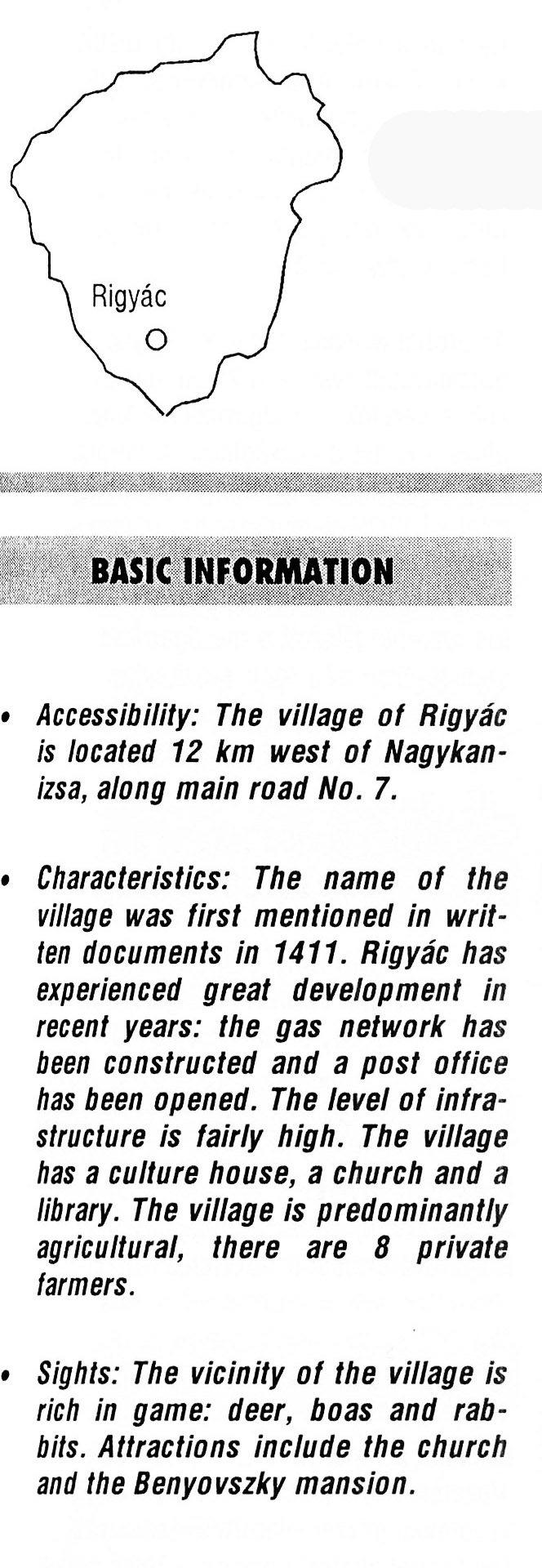 Nyilvános 2190 | 5789 | Rövid leírás | Teljes leírás (1.11 KB) | Rigyác BASIC INFORMATION Accessibility. The village of Rigyác is located 12 km west of Nagykanizsa, along main road No. 7. Characteristics: The name of the village was first mentioned in written documents in 1411. Rigyác has experienced great development in recent years: the gas network has been constructed and a post office has been opened. The level of infrastructure is fairly high. The village has a culture house, a church and a library. The village is predominantly agricultural, there are 8 private farmers. Sights: The vicinity of the village is rich in game: deer, boas and rabbits. Attractions include the church and the Benyovszky mansion. This text came from the following book: Title: Handbook of Zala county (Zala megye kézikönyve) Series: County handbooks of Hungary (Magyarország megyei kézikönyvei) Chief editor: Hóbor József Publisher: (Hatvan), CEBA-Hungary Ltd, 1998 ETO: 908.439.121(035) ; 050.8(439.121) ISBN: 963-9089-18-2 Pages: 488-1040 p. Remark: Closed on: 1998. márc. 31. |