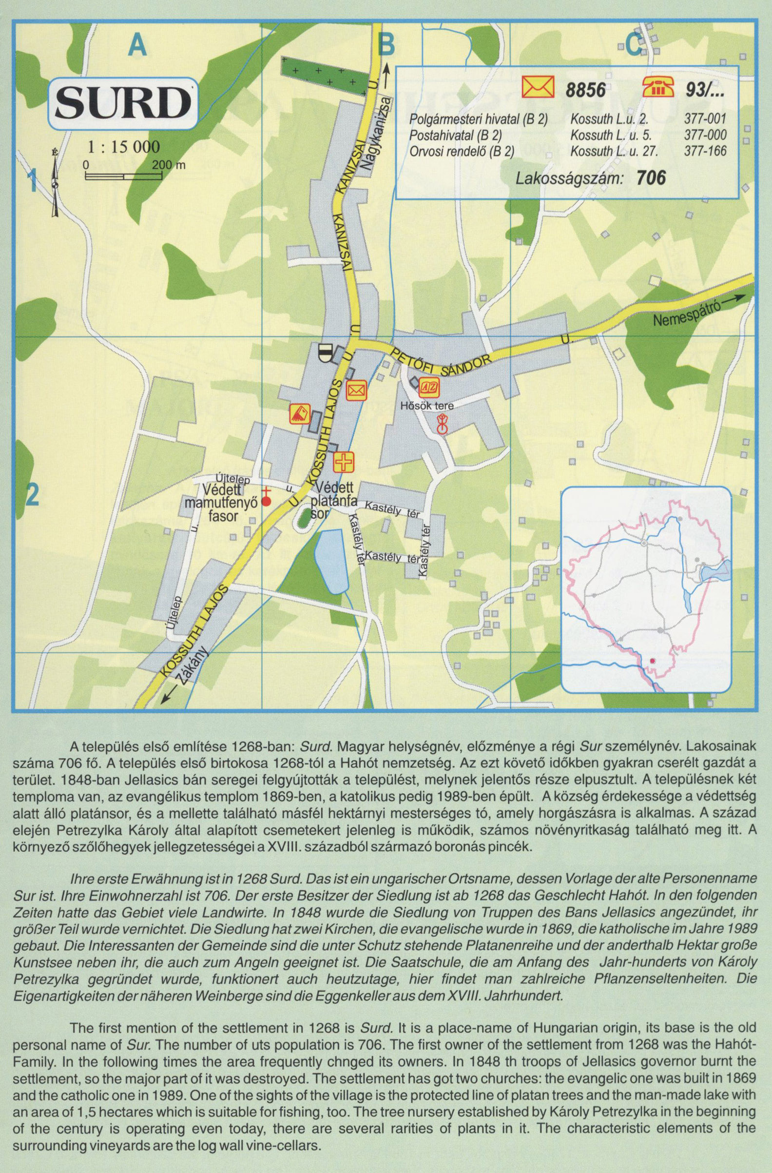 Nyilvános 2495 | 9680 | SURD | A település első említése 1268-ban: Surd. Magyar helységnév, előzménye a régi Sur személynév. Lakosainak száma 706 fő. A település első birtokosa 1268-tól a Hahót nemzetség. Az ezt követő időkben gyakran cserélt gazdát a terület. 1848-ban Jellasics bán seregei felgyújtották a települést, melynek jelentős része elpusztult. A településnek két temploma van, az evangélikus templom 1869-ben, a katolikus pedig 1989-ben épült. A község érdekessége a védettség alatt álló platánsor, és a mellette található másfél hektárnyi mesterséges tó, amely horgászásra is alkalmas. A század elején Petrezylka Károly által alapított csemetekert jelenleg is működik, számos növényritkaság található meg itt. A környező szőlőhegyek jellegzetességei a XVIII. századból származó boronás pincék. Ihre erste Erwähnung ist in 1268 Surd. Das ist ein ungarischer Ortsname, dessen Vorlage der alte Personenname Sur ist. Ihre Einwohnerzahl ist 706. Der erste Besitzer der Siedlung ist ab 1268 das Geschlecht Hahót. In den folgenden Zeiten hatte das Gebiet viele Landwirte. In 1848 wurde die Siedlung von Truppen des Bans Jellasics angezündet, ihr größer Teil wurde vernichtet. Die Siedlung hat zwei Kirchen, die evangelische wurde in 1869, die katholische im Jahre 1989 gebaut. Die Interessanten der Gemeinde sind die unter Schutz stehende Platanenreihe und der anderthalb Hektar große Kunstsee neben ihr, die auch zum Angeln geeignet ist. Die Saatschule, die am Anfang des Jahr-hunderts von Károly Petrezylka gegründet wurde, funktionert auch heutzutage, hier findet man zahlreiche Pflanzenseltenheiten. Die Eigenartigkeiten der näheren Weinberge sind die Eggenkeller aus dem XVIII. Jahrhundert. The first mention of the settlement in 1268 is Surd. It is a place-name of Hungarian origin, its base is the old personal name of Sur. The number of uts population is 706. The first owner of the settlement from 1268 was the Hahót-Family. In the following times the area frequently chnged its owners. In 1848 th troops of Jellasics governor burnt the settlement, so the major part of it was destroyed. The settlement has got two churches: the evangelic one was built in 1869 and the catholic one in 1989. One of the sights of the village is the protected line of platan trees and the man-made lake with an area of 1,5 hectares which is suitable forfishing, too. The tree nursery established by Károly Petrezylka in the beginning of the century is operating even today, there are several rarities of plants in it. The characteristic elements of the surrounding vineyards are the log wall vine-cellars. A részlet a következő kiadványból származik/Die Teile stammen vom volgenden Buch/This text came from the following book: Cím/Titel/Title: Zala megye településeinek atlasza - 257 település részletes térképe/Atlas der Komitat Zala - 257 Detailte Siedlungskarten/Zala county\'s Atlas - 257 settlement maps. Közreműködő/contributor: Lackner László (1943) (fotó) Kiadás/Ausgabe/Publisher: Gyula : HISZI-MAP, 1997 Sorozat/Serie/Series: Indulástól - megérkezésig... ETO: 912(439.121-2) ; 908.439.121 Cutter: Z 19 ISBN: 963-610-025-4 Oldalszám/Seiten/Pages: 323, 81 p. Megjegyzés/Note: Lezárva/Abgeschlossen am/Closed am: 1997. máj. 30. |
