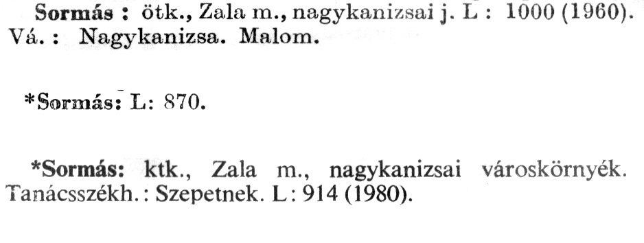 Nyilvános 2052 | 5714 | A szócikkek felismertetett szövege: | (Az első csillag után az 1972-es, a második csillag után az 1981-es kiadású kiegészítő kötetből származó szöveg következik) Sormás: ötk., Zala m., nagykanizsai j. L: 1000 (1960). Vá.: Nagykanizsa. Malom. *Sormás: L: 870. *Sormás: ktk., Zala m., nagykanizsai városkörnyék. Tanácsszékh.: Szepetnek. L: 914 (1980). A szócikkek a következő lexikonból származnak: Cím: Új magyar lexikon Közreműködő: Berei Andor (1900-1979) (szerk.) Szerz. közl.: [szerk. Berei Andor et al.] Kiadás jelzés: 2. lny. Kiadás: Budapest : Akad. K., 1961-1962 Kötetei: 1., A - C 2., D - F 3., G - J 4., K - Me 5., Mf - R 6., S - Z 7. köt., A-Z Kiegészítő kötet (1972) Kiegészítő kötet, 1962÷1980 (1981) ETO jelzet: 03=945.11 Szakjelzet: 030 Cutter: U 28 Nyelv: magyar Megjegyzés: Bibliogr. a címszavak egy részének végén |