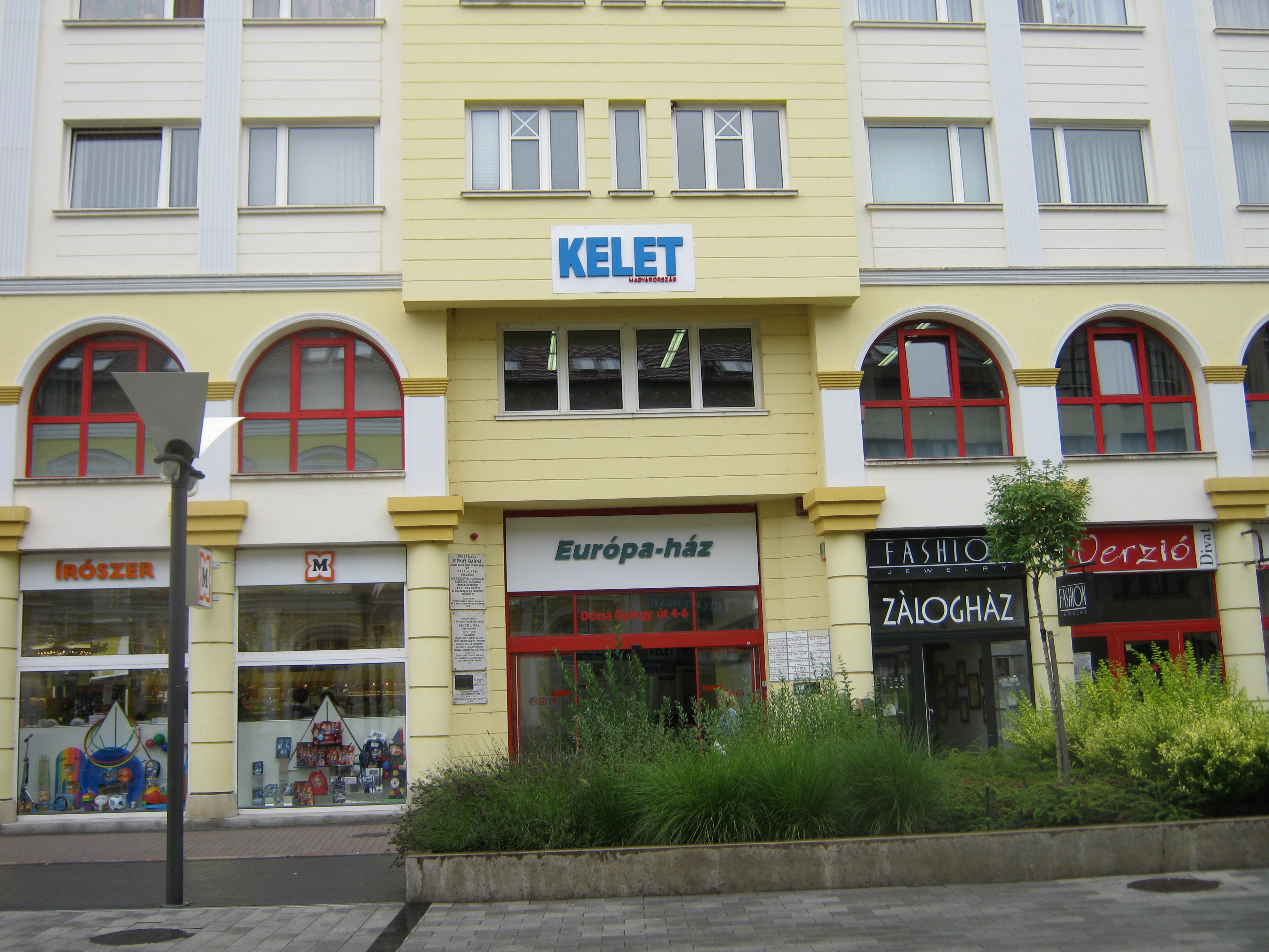 Nyilvános 1007 | 1488 | Nyíregyháza, Dózsa György utca 4-6. Európa-ház | Ezen a helyen z 1880-as évektől a város harmadik legjelentősebb szállodája működött. Itt is muzsikált Nyíregyháza jeles prímása, Benczi Gyula. Krúdy szerint itt zajlottak a leghevesebb kártyacsaták. A szálló a tiszaeszlári per idején a védő, Eötvös Károly munkatársainak főhadiszállása volt. Az első világháború idején zárt be, mert nem bírta a versenyt a Koronával (lásd: Nyíregyháza, Dózsa Gy. u. 1.). Működött benne újságszerkesztőség, majd öregek otthona. A ma helyén álló épületen egy emléktábla az egykori szálló képét is idézi. Felh. irod.: Látnivalók Szabolcs-Szatmár-Bereg megyében. Miskolc, Well-PRess, 1999 Margócsy József: Utcák, terek, emléktáblák [1.] Nyíregyháza, Városi Tanács – Bp., Közgazd. és Jogi Kiadó, 1984 A fénykép 2010 augusztus elején készült. |