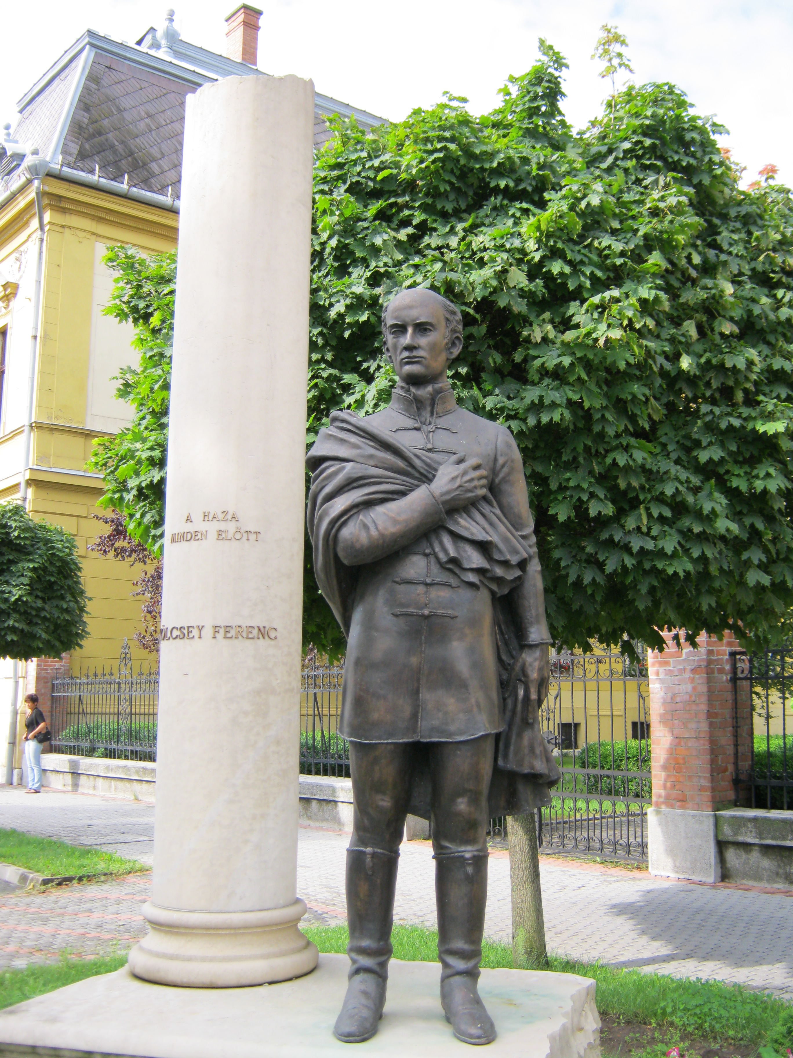 Nyilvános 1020 | 1454 | Nyíregyháza, Hősök tere 5. Megyeháza | Az eklektikus stílusú megyeháza 1891-1892-ben, Alpár Ignác tervei szerint épült. Homlokzatát Szabolcs vezér és az államalapító István király szobrai díszítik. Az épületplasztikák és díszítmények Verán József munkái. Nyíregyháza 1876-ban lett megyeszékhely, korábban Nagykálló töltötte be ezt a szerepet. Az épület előtt 2008-ban állították fel Bíró Lajos Kölcsey Ferencet megjelenítő szoborkompozícióját. A költőt szívre tett kézzel ábrázoló köztéri alkotást a Himnusz születésének 185. és Kölcsey halálának 170. évfordulójára emlékezve emelték. Az oszlop felirata: A haza minden előtt. Kölcsey Szatmár vármegye főjegyzője és országgyűlési követe volt. Szabadelvű politikusként a nemzeti függetlenségért, a polgári és emberi jogokért, a jobbágyfelszabadításért, a nemzeti egységért, a vallási egyenjogúságért és türelemért, a magyar nyelv hivatalossá tételéért dolgozott. Tiltakozásul a vármegye felszólítására, hogy az örökváltság ellen szavazzon, képes volt lemondani politikai karrierjéről. Felh. irod.: Látnivalók Szabolcs-Szatmár-Bereg megyében. Miskolc, Well-PRess, 1999 www.szoborlap.hu A fénykép 2010 augusztus elején készült. |