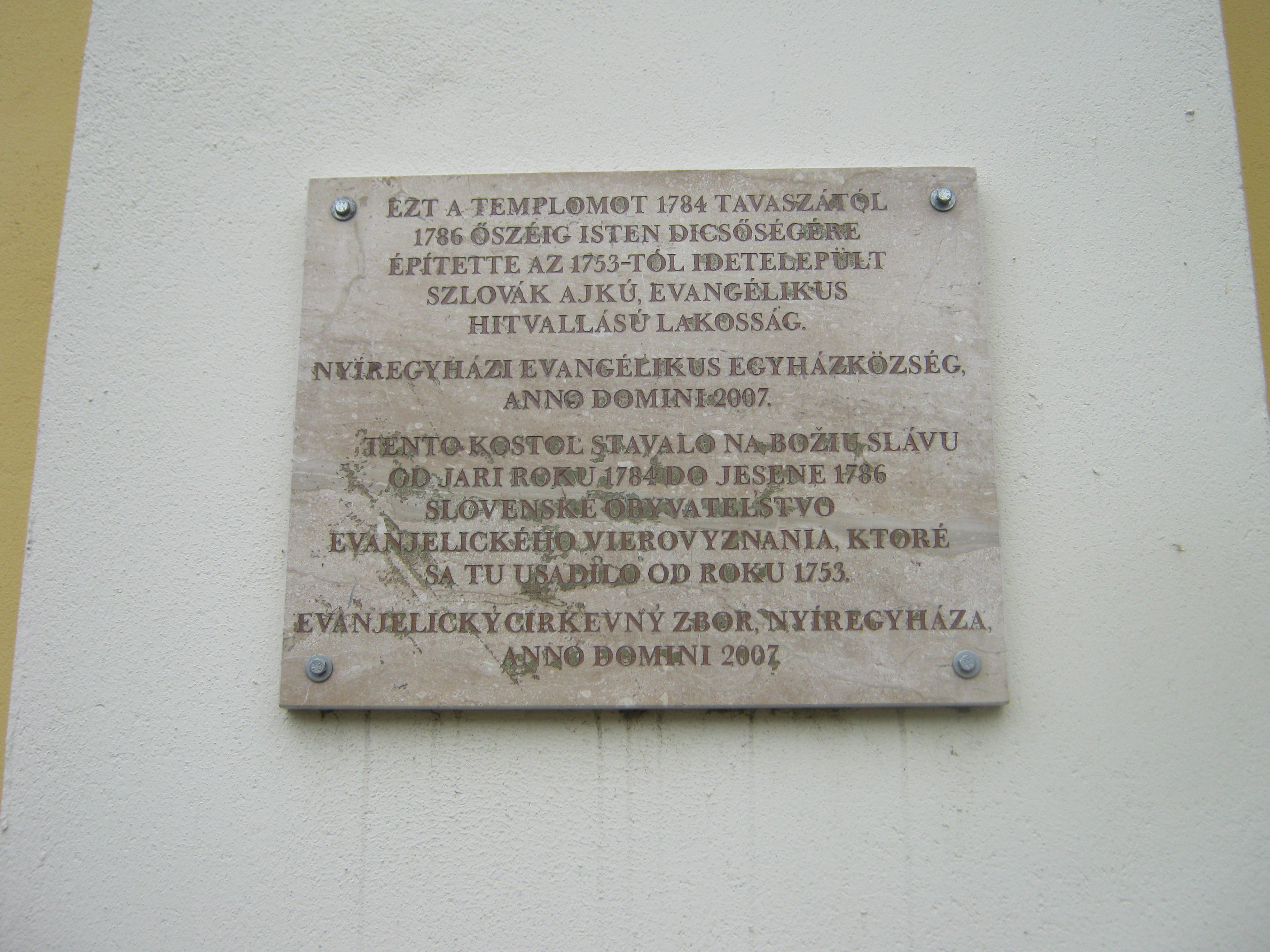 Nyilvános 959 | 1294 | Nyíregyháza, Luther tér 1. Evangélikus templom | A késő barokk épület tervezője Giuseppe Aprilis volt, alapkövét 1784-ben rakták le, s két év múlva fel is szentelhették. Építtetője az 1750-es évek közepétől Nyíregyházára települt szlovák ajkú, evangélikus hitvallású lakosság volt. Belső díszítőfestése a nyíregyházi Benczúr Gyula tervei alapján készült. 1910-ből származó orgonája Rieger Ottó műve. Az 1928-ban készült harangjáték a Luther Márton által írt "Jövel Szentlélek Úristen" kezdetű ének első két sorát játssza. A fénykép 2010 augusztus elején készült. Felh. irod.: Látnivalók Szabolcs-Szatmár-Bereg megyében. Miskolc, Well-PRess, 1999 |