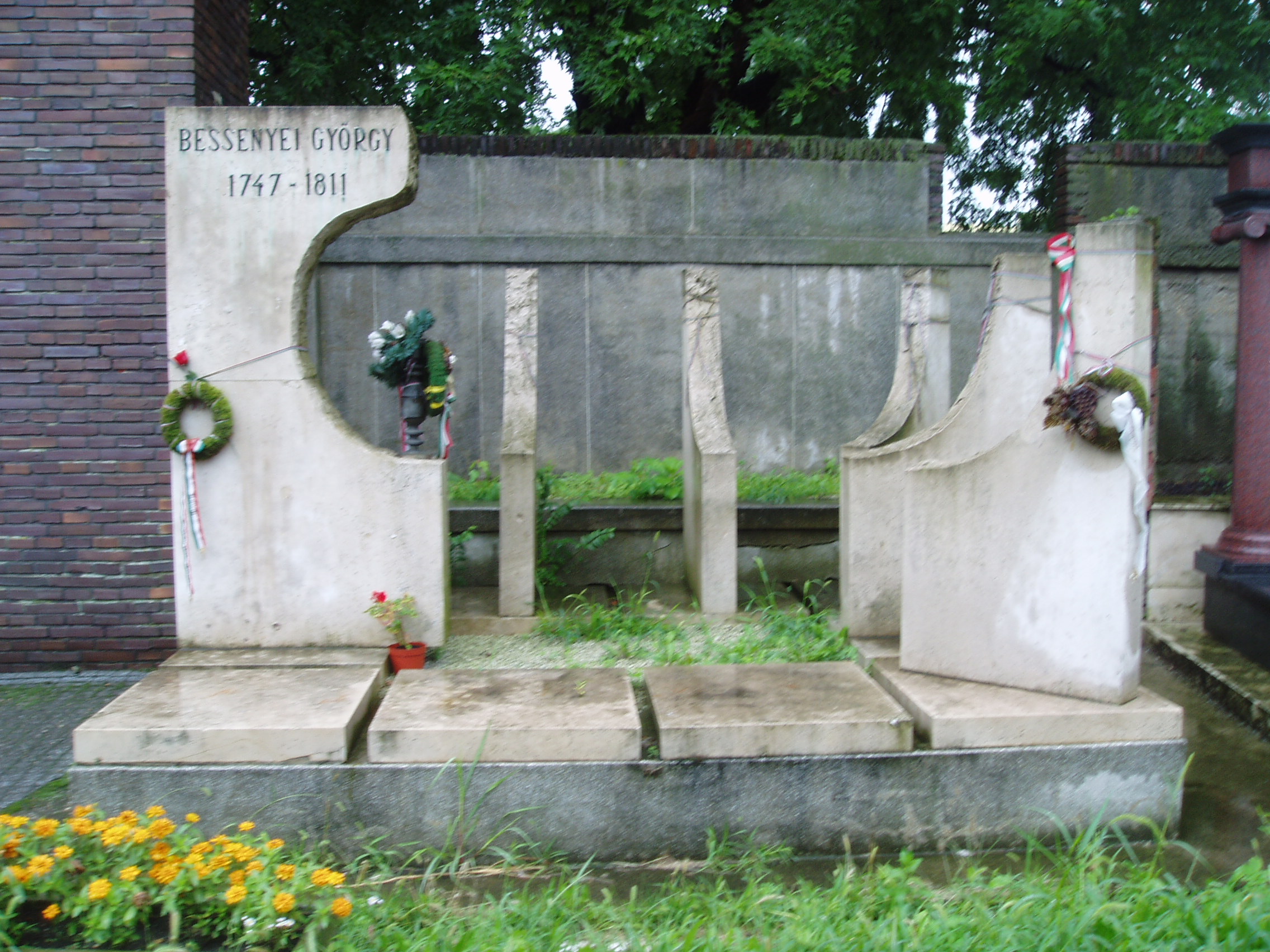 Nyilvános 811 | 1568 | Nyíregyháza, Pazonyi tér, Északi temető: Bessenyei György sírja | A Dózsa György út vezet Nyíregyháza Északi temetőjébe. A főbejárat közvetlen közelében nyugszik a magyar irodalomtörténet egyik nagy alakja, Bessenyei György (1746/7-1811). Birtokán, Pusztakovácsiban hunyt el, kúriájának kertjében temették el. Hamvait 1940-ben szállították Nyíregyházára. Síremlékét süttői márványból 1982-ben készítette Ráthonyi József. Felh. irod.: Fazekas Árpád - Szekrényes András: Nyíregyháza temetői. Nyíregyháza, 1990 A fénykép 2010 augusztus elején készült |