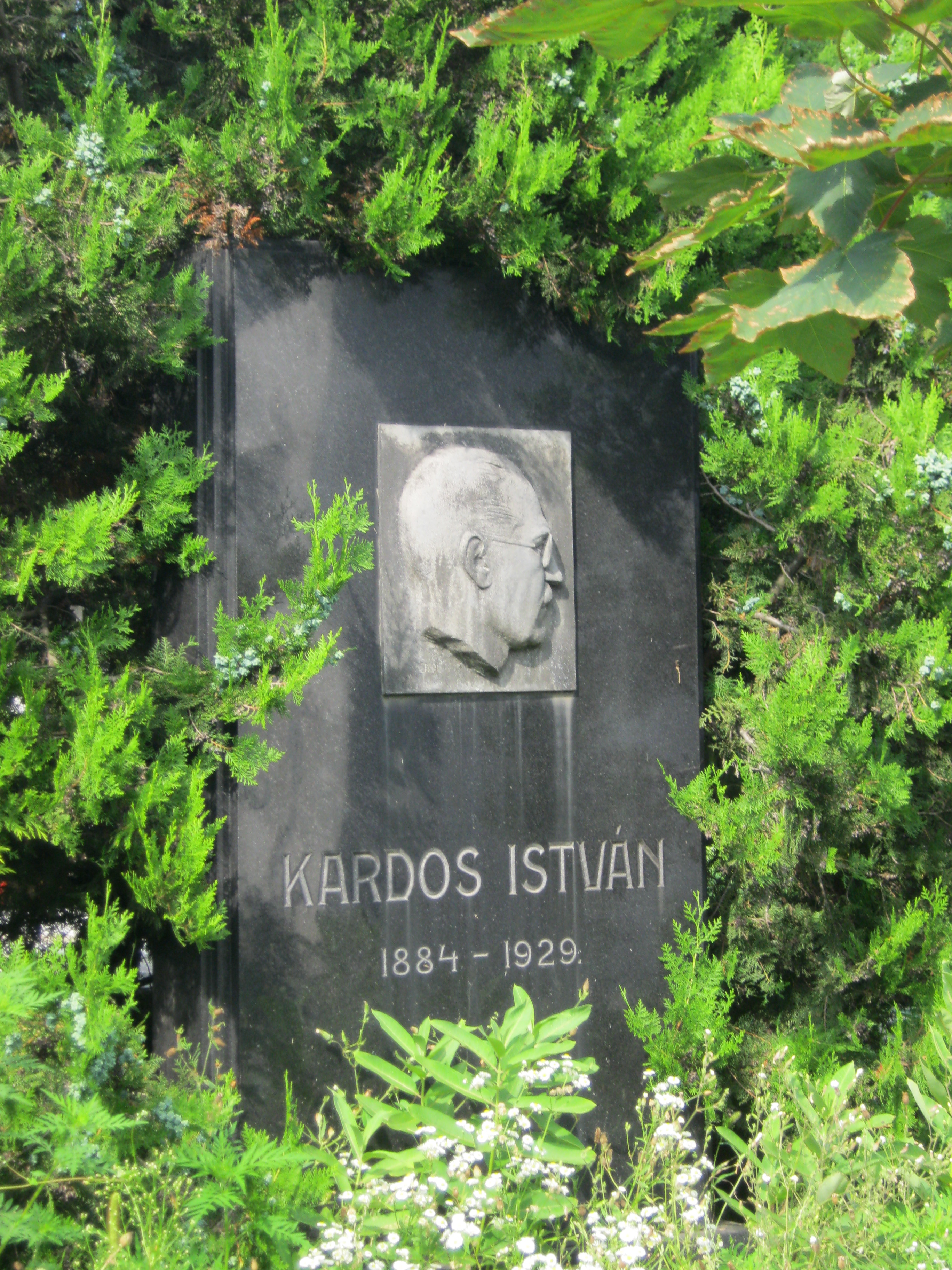 Nyilvános 1030 | 1623 | Nyíregyháza, Pazonyi tér, Északi temető: Kardos István | A Dózsa György út vezet Nyíregyháza Északi temetőjébe. Itt nyugszik Kardos István (1884-1929), Nyíregyháza kulturális életének egyik fontos alakja: kultúrtanácsnok és a Bessenyei Kör főtitkára. Arcvonásait bronz dombormű őrzi síremlékén, amelyet 1940-ben a Bessenyei Kör állíttatott fel. Felh. irod.: Fazekas Árpád - Szekrényes András: Nyíregyháza temetői. Nyíregyháza, 1990 A fénykép 2010 augusztus elején készült |