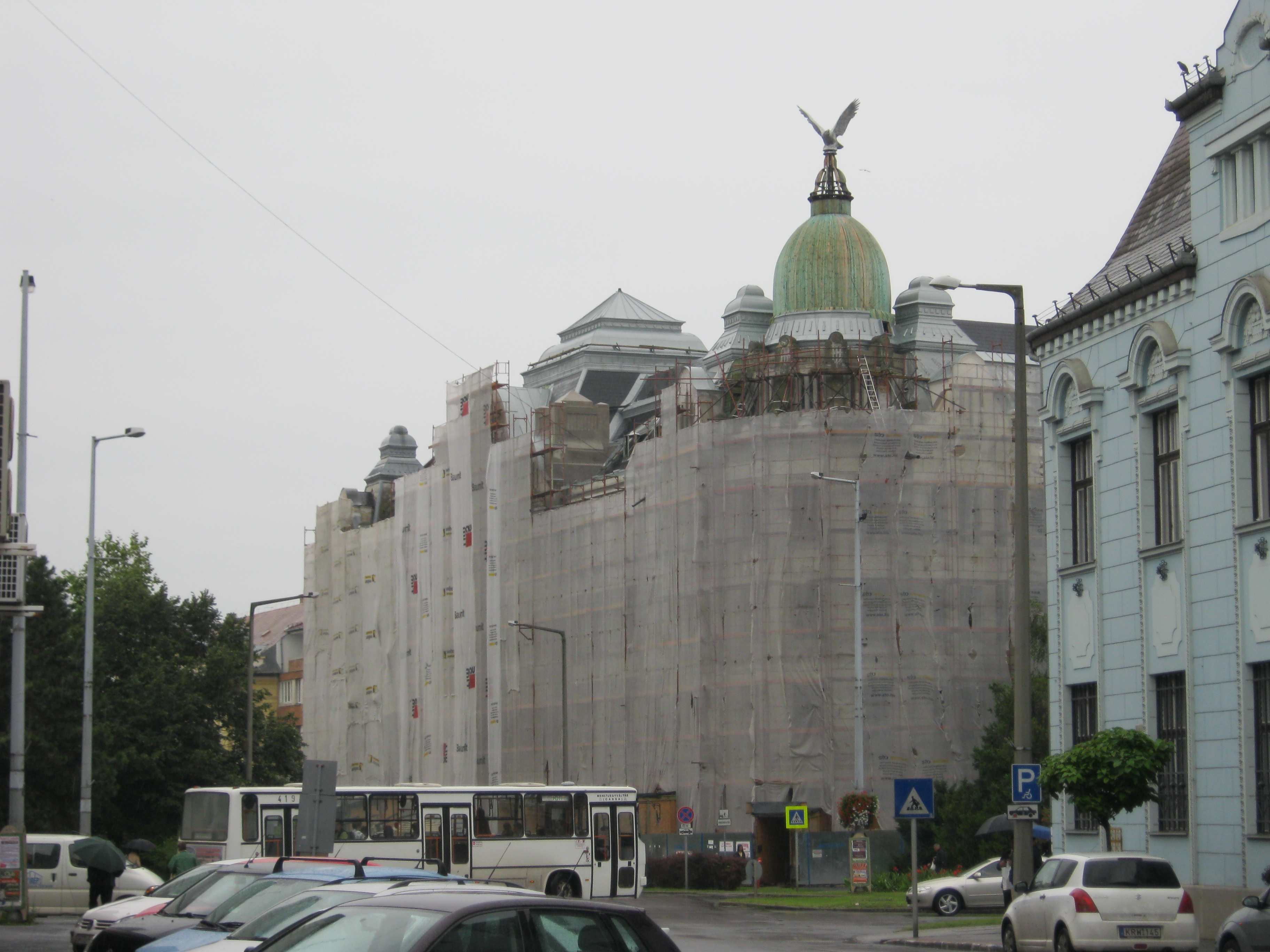 Nyilvános 981 | 1461 | Nyíregyháza, Széchenyi utca 1. Nyírvíz-palota | Az Országzászló tér nyugati oldalán indul a város egykori főútvonala, a Széchenyi utca. Itt van a bejárata a hatalmas tömböt elfoglaló Nyírvíz-palotának, amely 1913-ban épült a Nyírvíz-szabályozó Társulat székházának Papp Gyula és Szabolcs Ferenc tervei alapján. A városban mind építészetileg, mind városképileg meghatározó épület szecessziós és eklektikus jegyeket visel magán. A lépcsőház díszes ablakai (87 négyzetméter), a lift és a függőfolyosó lengő ajtajainak maratott üvegei (43 négyzetméter), valamint a homlokzat gyönyörű díszei Róth Miksa műhelyében (lásd: Budapest, 07. Nefelejcs u. 26.) készültek. Eredetileg a földszinten üzletek, szolgálati lakások, az emeleteken bérlakások, hivatal helyiségek nyertek elhelyzést. Személy- és teherfelvonóval, házi vízvezetékrendszerrel és központi fűtéssel rendelkezett. Két kapubejárata lett a Széchenyi utca és az Országzászló tér felől nyílik, amelyek ikerlépcsőházban találkoznak. Kupoláján rétisas látható, amely az eltűnt eredeti másolata. (Ottjártamkor felállványozva találtam, de mivel fontos épület, ebben az állapotában is lefényképeztem. KK.) Felh. irod.: www.nyirviz.hu A fénykép 2010 augusztus elején készült |