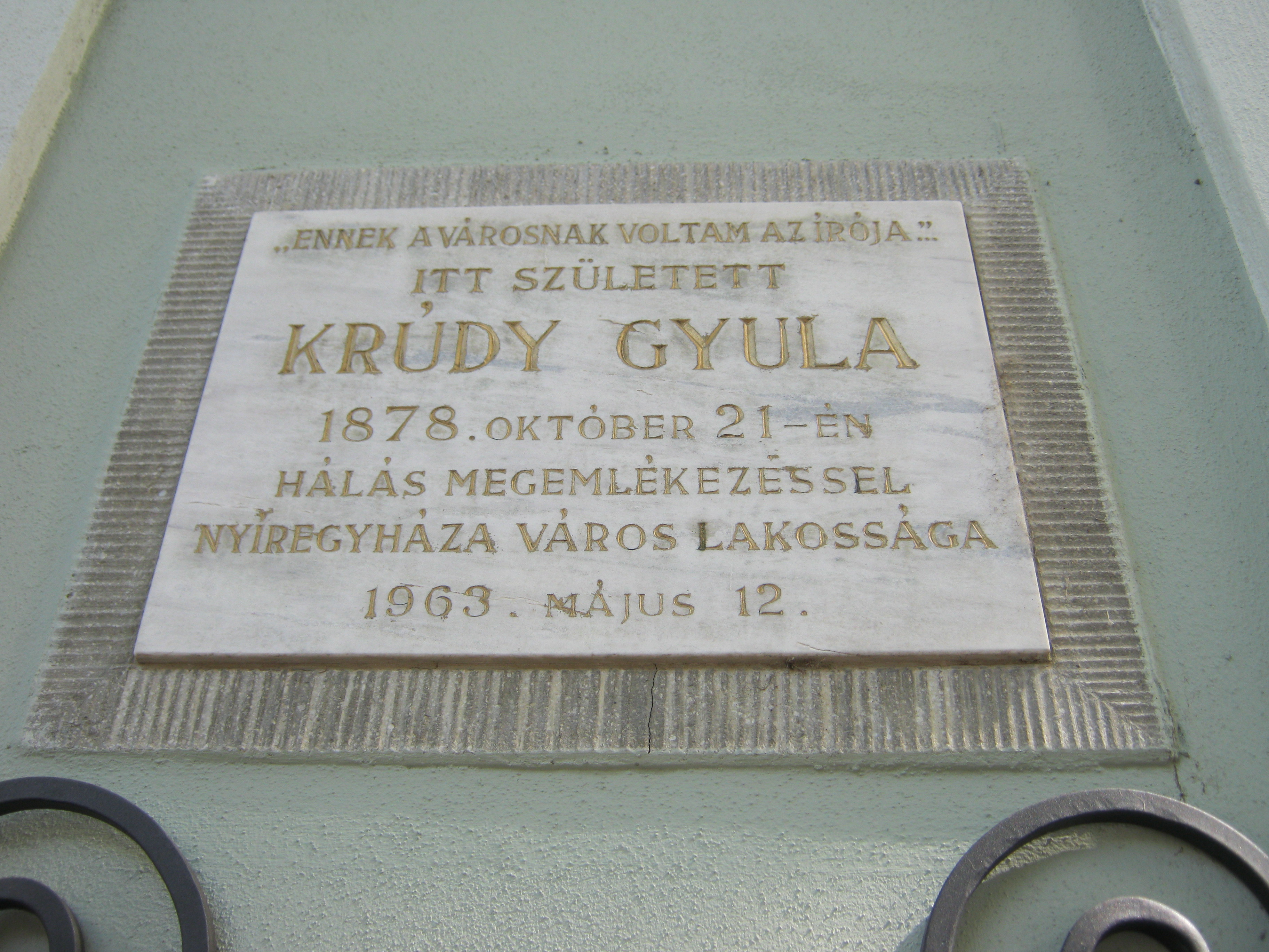 Nyilvános 987 | 1326 | Nyíregyháza, Szent István utca 8. | 1963-as keltezésű emléktáblája szerint ebben a házban született 1878. október 21-én Krúdy Gyula. A róla szóló irodalomból viszont az böngészhető ki, hogy ez már nem az eredeti épület. Apja, id. Krúdy Gyula ügyvéd volt. Az író törvénytelen gyermekként született: az ügyvéd beleszeretett cselédlányukba, Csákányi Juliannába, és csak a tizedik gyerek születése után házasodtak össze. Krúdy elemi iskolai tanulmányait Nyíregyházán kezdte, majd 1887 őszén a ma Romániában található Szatmárnémetibe került, ott lett kisgimnazista. Gimnáziumi tanulmányait Podolinban folytatta. Hazatérve, 1891-’95 között az evangélikus gimnáziumban tanult. A Kossuth Gimnázium falán emléktábla örökíti meg, hogy ott érettségizett (lásd: Nyíregyháza, Szent István utca 19.). A közelmúltban még létezett emlékszobája a Jósa András Múzeumban (lásd: Nyíregyháza, Benczúr tér 21.), 2010-ben Nyíregyházán járva azonban már nem találtam. Van viszont egy szép emlékműve a városban (lásd: Nyíregyháza, Bessenyei tér). Felh. irod.: Látnivalók Szabolcs-Szatmár-Bereg megyében. Miskolc, Well-PRess, 1990 Szabó Ede: Krúdy Gyula. Bp. Szépirodalmi Kiadó, 1970 Fráter Zoltán: Krúdy Gyula. Bp., Elektra Kiadóház, 2003 A fénykép 2010 augusztus elején készült |