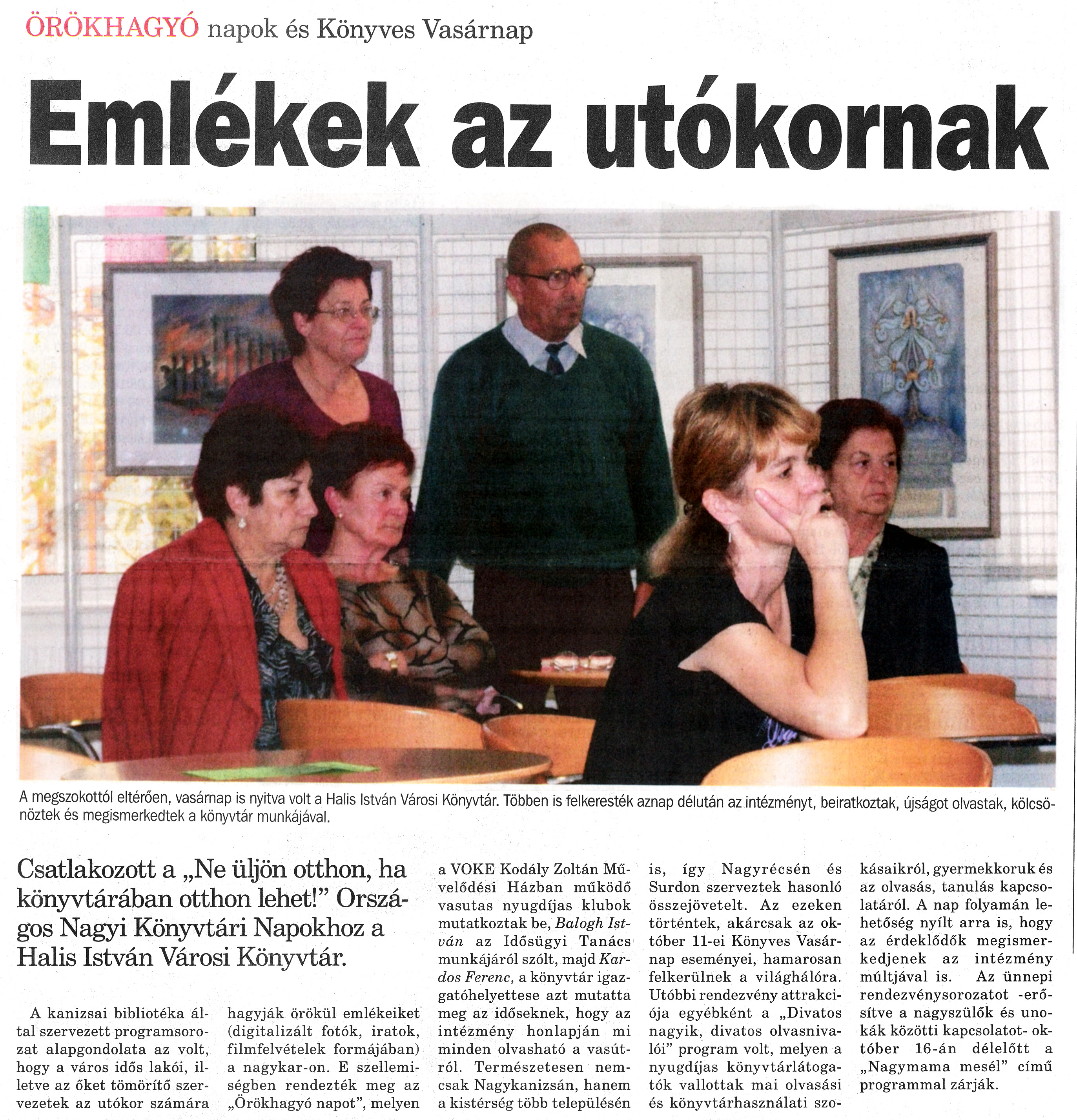 Nyilvános 1188 | 1634 | Nagykanizsai Maraton 2009.10.16. 041. szám 1. oldal - Emlékek az utókornak | A cikk szövege: ÖRÖKHAGYÓ napok és Könyves Vasárnap Emlékek az utókornak A megszokottól eltérően, vasárnap is nyitva volt a Halis István Városi Könyvtár. Többen is felkeresték aznap délután az intézményt, beiratkoztak, újságot olvastak kölcsönöztek és megismerkedtek a könyvtár munkájával. Csatlakozott a „Ne üljön otthon, ha könyvtárában otthon lehet!” Országos Nagyi Könyvtári Napokhoz a Halis István Városi Könyvtár. A kanizsai bibliotéka által szervezett programsorozat alapgondolata az volt, hogy a város idős lakói, illetve az őket tömörítő szervezetek az utókor számára hagyják örökül emlékeiket (digitalizált fotók, iratok, filmfelvételek formájában) a nagykar-on. E szellemiségben rendezték meg az „Örökhagyó napot”, melyen a VOKE Kodály Zoltán Művelődési Házban működő vasutas nyugdíjas klubok mutatkoztak be, Balogh István az Idősügyi Tanács munkájáról szólt, majd Kardos Ferenc, a könyvtár igazgatóhelyettese azt mutatta meg az időseknek, hogy az intézmény honlapján mi minden olvasható a vasútról. Természetesen nemcsak Nagykanizsán, hanem a kistérség több településén is, így Nagyrécsén és Surdon szerveztek hasonló összejövetelt. Az ezeken történtek, akárcsak az október 11-ei Könyves Vasárnap eseményei, hamarosan felkerülnek a világhálóra. Utóbbi rendezvény attrakciója egyébként a „Divatos nagyik, divatos olvasnivalói” program volt, melyen a nyugdíjas könyvtárlátogatók vallottak mai olvasási és könyvtárhasználati szokásaikról, gyermekkoruk és az olvasás, tanulás kapcsolatáról. A nap folyamán lehetőség nyílt arra is, hogy az érdeklődők megismerkedjenek az intézmény múltjával is. Az ünnepi rendezvénysorozatot -erősítve a nagyszülők és unokák közötti kapcsolatot- október 16-án délelőtt a „Nagymama mesél” című programmal zárják. |