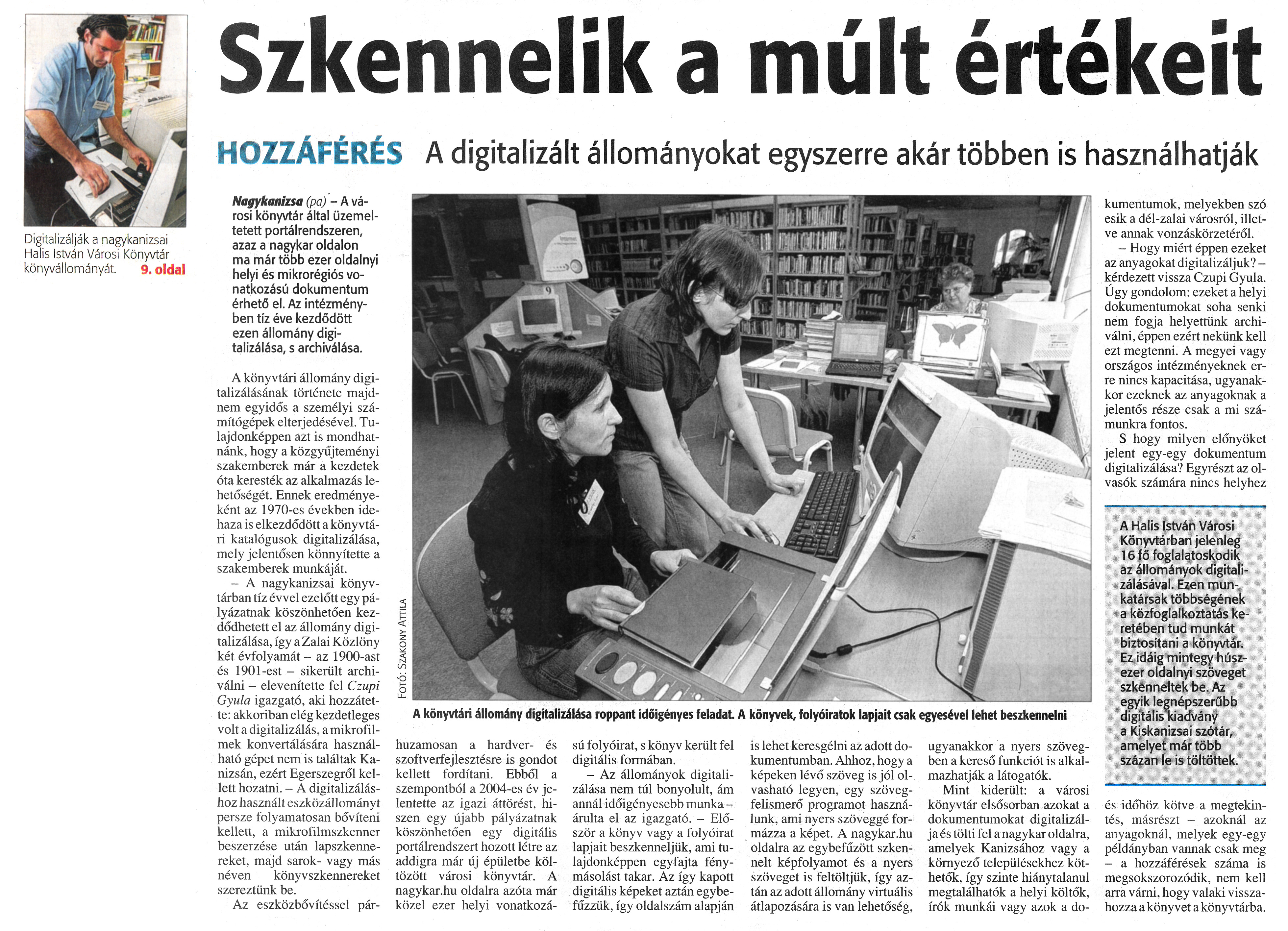 Nyilvános 929 | 1323 | Zalai Hírlap 2009.10.08. 236. szám 9. oldal - Szkennelik a múlt értékeit | A cikk szövege: Digitalizálják a nagykanizsai Halis István Városi Könyvtár könyvállományát. 9. oldal Szkennelik a múlt értékeit A könyvtári állomány digitalizálása roppant időigényes feladat. A könyvek, folyóiratok lapjait csak egyesével lehet beszkennelni HOZZÁFÉRÉS A digitalizált állományokat egyszerre akar többen is használhatják Nagykanizsa (pa) - A városi könyvtár által üzemeltetett portálrendszeren, azaz a nagykar oldalon ma már több ezer oldalnyi helyi és mikrorégiós vonatkozású dokumentum érhető el. Az intézményben tíz éve kezdődött ezen állomány digitalizálása, s archiválása. A könyvtári állomány digitalizálásának története majdnem egyidős a személyi számítógépek elterjedésével. Tulajdonképpen azt is mondhatnánk, hogy a közgyűjteményi szakemberek már a kezdetek óta keresték az alkalmazás lehetőségét. Ennek eredményeként az 1970-es években idehaza is elkezdődött a könyvtári katalógusok digitalizálása, mely jelentősen könnyítette a szakemberek munkáját. - A nagykanizsai könyvtárban tíz évvel ezelőtt egy pályázatnak köszönhetően kezdődhetett el az állomány digitalizálása, így a Zalai Közlöny két évfolyamát - az 1900-ast és 190l-est - sikerült archiválni - elevenítette fel Czupi Gyula igazgató, aki hozzátette: akkoriban elég kezdetleges volt a digitalizálás, a mikrofilmek konvertálására használható gépet nem is találtak Kanizsán, ezért Egerszegről kellett hozatni. - A digitalizáláshoz használt eszközállományt persze folyamatosan bővíteni kellett, a mikrofilmszkenner beszerzése után lapszkennereket, majd sarok- vagy más néven könyvszkennereket szereztünk be. Az eszközbővítéssel párhuzamosan a hardver- és szoftverfejlesztésre is gondot kellett fordítani. Ebből a szempontból a 2004-es év jelentette az igazi áttörést, hiszen egy újabb pályázatnak köszönhetően egy digitális portálrendszert hozott létre az addigra már új épületbe költözött városi könyvtár. A nagykar.hu oldalra azóta már közel ezer helyi vonatkozású folyóirat, s könyv került fel digitális formában. - Az állományok digitalizálása nem túl bonyolult, ám annál időigényesebb munka -árulta el az igazgató. - Először a könyv vagy a folyóirat lapjait beszkenneljük, ami tulajdonképpen egyfajta fénymásolást takar. Az így kapott digitális képeket aztán egybefűzzük, így oldalszám alapján is lehet keresgélni az adott dokumentumban. Ahhoz, hogy a képeken lévő szöveg is jól olvasható legyen, egy szövegfelismerő programot használunk, ami nyers szöveggé formázza a képet. A nagykar.hu oldalra az egybefűzött szkennert képfolyamot és a nyers szöveget is feltöltjük, így aztán az adott állomány virtuális átlapozására is van lehetőség, ugyanakkor a nyers szövegben a kereső funkciót is alkalmazhatják a látogatók. Mint kiderült: a városi könyvtár elsősorban azokat a dokumentumokat digitalizálja és tölti fel a nagykar oldalra, amelyek Kanizsához vagy a környező településekhez köthetők, így szinte hiánytalanul megtalálhatók a helyi költők, írók munkái vagy azok a dokumentumok, melyekben szó esik a dél-zalai városról, illetve annak vonzáskörzetéről. - Hogy miért éppen ezeket az anyagokat digitalizáljuk? -kérdezett vissza Czupi Gyula. Úgy gondolom: ezeket a helyi dokumentumokat soha senki nem fogja helyettünk archiválni, éppen ezért nekünk kell ezt megtenni. A megyei vagy országos intézményeknek erre nincs kapacitása, ugyanakkor ezeknek az anyagoknak a jelentős része csak a mi számunkra fontos. S hogy milyen előnyöket jelent egy-egy dokumentum digitalizálása? Egyrészt az olvasók számára nincs helyhez A Halis István Városi Könyvtárban jelenleg 16 fő foglalatoskodik az állományok digitalizálásával. Ezen munkatársak többségének a közfoglalkoztatás keretében tud munkát biztosítani a könyvtár. Ez idáig mintegy húszezer oldalnyi szöveget szkenneltek be. Az egyik legnépszerűbb digitális kiadvány a Kiskanizsai szótár, amelyet már több százan le is töltöttek. és időhöz kötve a megtekintés, másrészt - azoknál az anyagoknál, melyek egy-egy példányban vannak csak meg - a hozzáférések száma is megsokszorozódik, nem kell arra várni, hogy valaki visszahozza a könyvet a könyvtárba. |