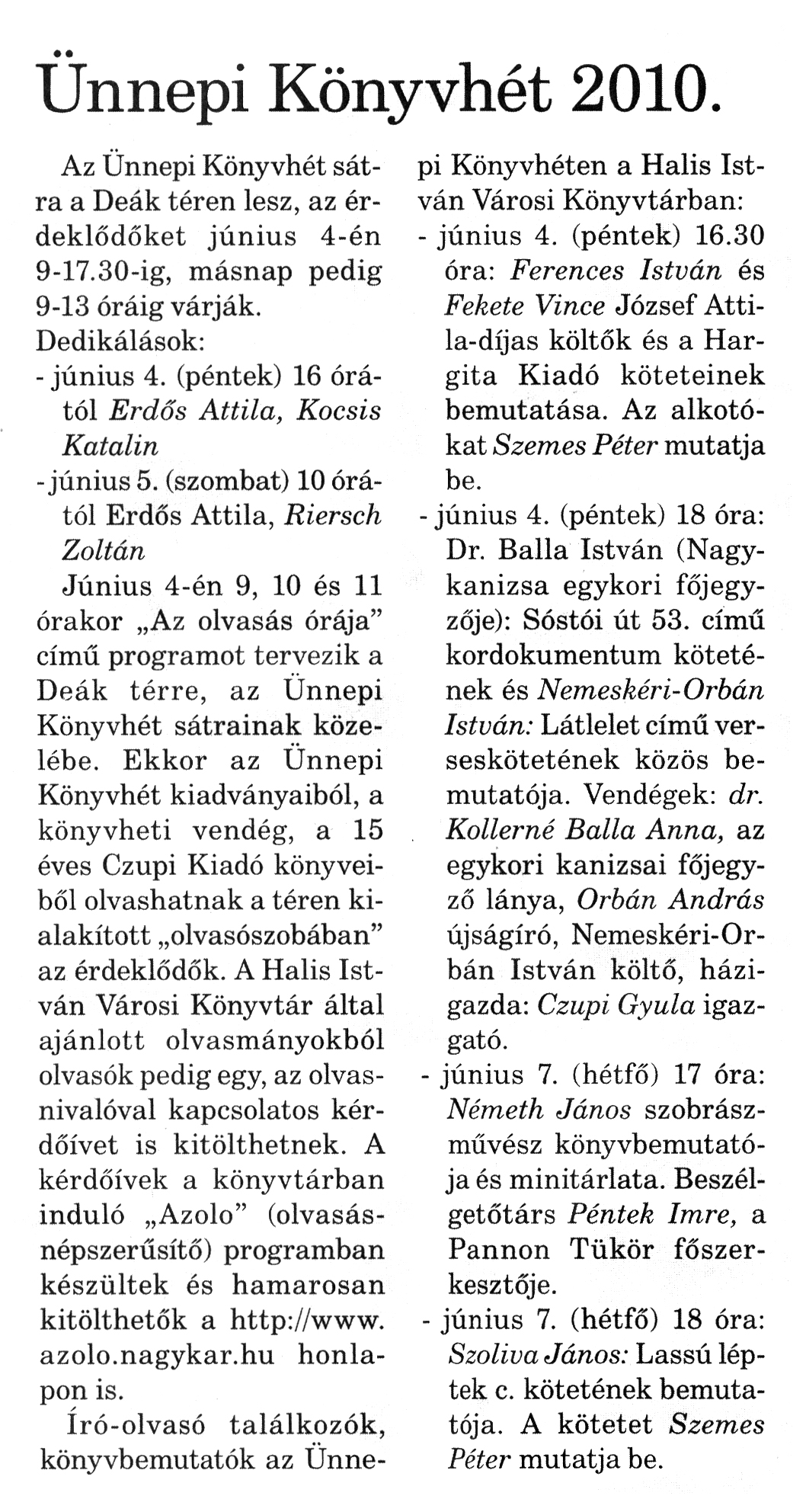 Nyilvános 956 | 1391 | Nagykanizsai Maraton 2010. június 4. 022. szám 2. oldal - Ünnepi Könyvhét 2010 | A cikk szövege: Ünnepi Könyvhét 2010. Az Ünnepi Könyvhét sátra a Deák téren lesz, az érdeklődőket június 4-én 9-17.30-ig, másnap pedig 9-13 óráig várják. Dedikálások: - június 4. (péntek) 16 órától Erdős Attila, Kocsis Katalin -június 5. (szombat) 10 órától Erdős Attila, Riersch Zoltán Június 4-én 9, 10 és 11 órakor „Az olvasás órája" című programot tervezik a Deák térre, az Ünnepi Könyvhét sátrainak közelébe. Ekkor az Ünnepi Könyvhét kiadványaiból, a könyvheti vendég, a 15 éves Czupi Kiadó könyveiből olvashatnak a téren kialakított „olvasószobában" az érdeklődők. A Halis István Városi Könyvtár által ajánlott olvasmányokból olvasók pedig egy, az olvasnivalóval kapcsolatos kérdőívet is kitölthetnek. A kérdőívek a könyvtárban induló „Azolo" (olvasásnépszerűsítő) programban készültek és hamarosan kitölthetők a http://www. azolo.nagykar.hu honlapon is. író-olvasó találkozók, könyvbemutatók az Ünne- pi Könyvhéten a Halis István Városi Könyvtárban: - június 4. (péntek) 16.30 óra: Ferences István és Fekete Vince József Attila-díjas költők és a Hargita Kiadó köteteinek bemutatása. Az alkotókat Szemes Péter mutatja be. - június 4. (péntek) 18 óra: Dr. Balla István (Nagykanizsa egykori főjegyzője): Sóstói út 53. című kordokumentum kötetének és Nemeskéri-Orbán István: Látlelet című verseskötetének közös bemutatója. Vendégek: dr. Kollerné Balla Anna, az egykori kanizsai főjegyző lánya, Orbán András újságíró, Nemeskéri-Orbán István költő, házigazda: Czupi Gyula igazgató. - június 7. (hétfő) 17 óra: Németh János szobrászművész könyvbemutatója és minitárlata. Beszélgetőtárs Péntek Imre, a Pannon Tükör főszerkesztője. - június 7. (hétfő) 18 óra: Szoliva János: Lassú léptek c. kötetének bemutatója. A kötetet Szemes Péter mutatja be. |