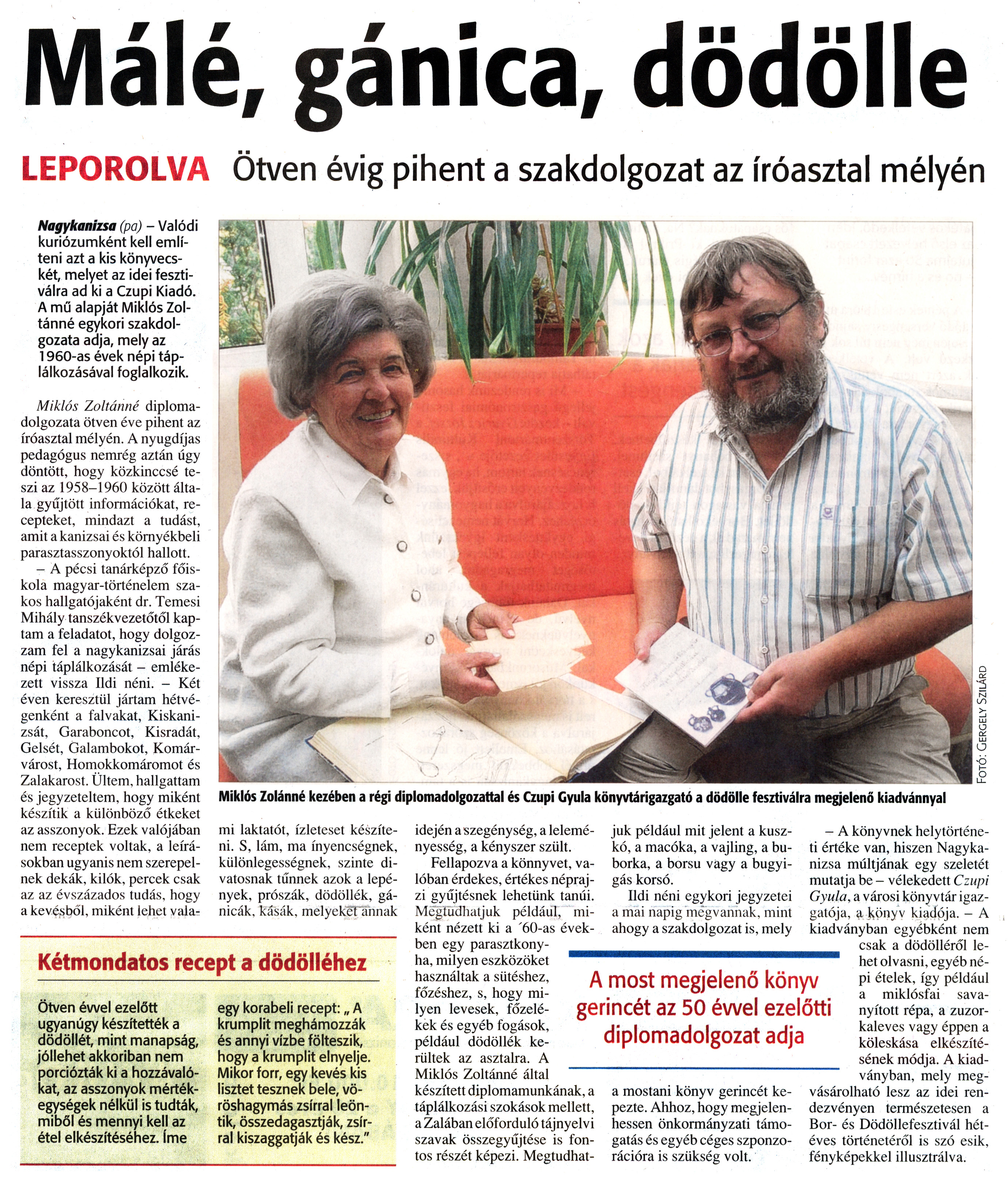 Nyilvános 1143 | 1539 | Zalai Hírlap 2010. szeptember 2. 204. szám 18. oldal - Málé, gánica, dödölle | A cikk szövege: Málé, gánica, dödölle LEPOROLVA Ötven évig pihent a szakdolgozat az íróasztal mélyén Nagykanizsa (pá) - Valódi kuriózumként kell említeni azt a kis könyvecskét, melyet az idei fesztiválra ad ki a Czupi Kiadó. A mű alapját Miklós Zoltánné egykori szakdolgozata adja, mely az 1960-as évek népi táplálkozásával foglalkozik. Miklós Zoltánné diplomadolgozata ötven éve pihent az íróasztal mélyén. A nyugdíjas pedagógus nemrég aztán úgy döntött, hogy közkinccsé teszi az 1958-1960 között általa gyűjtött információkat, recepteket, mindazt a tudást, amit a kanizsai és környékbeli parasztasszonyoktól hallott. - A pécsi tanárképző főiskola magyar-történelem szakos hallgatójaként dr. Temesi Mihály tanszékvezetőtől kaptam a feladatot, hogy dolgozzam fel a nagykanizsai járás népi táplálkozását - emlékezett vissza Ildi néni. - Két éven keresztül jártam hétvégenként a falvakat, Kiskanizsát, Garaboncot, Kisradát, Gelsét, Galambokot, Komár-várost, Homokkomáromot és Zalakarost. Ültem, hallgattam és jegyzeteltem, hogy miként készítik a különböző étkeket az asszonyok. Ezek valójában nem receptek voltak, a leírásokban ugyanis nem szerepelnek dekák, kilók, percek csak az az évszázados tudás, hogy a kevésből, miként lehet valami laktatót, ízletesét készíteni. S, lám, ma ínyencségnek, különlegességnek, szinte divatosnak tűnnek azok a lepények, prószák, dödöllék, gánicák, kásák, melyeket annak idején a szegénység, a leleményesség, a kényszer szült. Fellapozva a könyvet, valóban érdekes, értékes néprajzi gyűjtésnek lehetünk tanúi. Megtudhatjuk például, miként nézett ki a \'60-as években egy parasztkonyha, milyen eszközöket használtak a sütéshez, főzéshez, s, hogy milyen levesek, főzelékek és egyéb fogások, például dödöllék kerültek az asztalra. A Miklós Zoltánné által készített diplomamunkának, a táplálkozási szokások mellett, a Zalában előforduló tájnyelvi szavak összegyűjtése is fontos részét képezi. Megtudhat- juk például mit jelent a kuszkó, a macóka, a vajling, a buborka, a borsu vagy a bugyigás korsó. Ildi néni egykori jegyzetei a mai napig megvannak, mint ahogy a szakdolgozat is, mely a mostani könyv gerincét képezte. Ahhoz, hogy megjelenhessen önkormányzati támogatás és egyéb céges szponzorációra is szükség volt. - A könyvnek helytörténeti értéke van, hiszen Nagykanizsa múltjának egy szeletét mutatja be - vélekedett Czupi Gyula, a városi könyvtár igazgatója, a könyv kiadója. - A kiadványban egyébként nem csak a dödölléről lehet olvasni, egyéb népi ételek, így például a miklósfai savanyított répa, a zuzorkaleves vagy éppen a köleskása elkészítésének módja. A kiadványban, mely megvásárolható lesz az idei rendezvényen természetesen a Bor- és Dödöllefesztivál hétéves történetéről is szó esik, fényképekkel illusztrálva. Miklós Zolánné kezében a régi diplomadolgozattal és Czupi Gyula könyvtárigazgató a dödölle fesztiválra megjelenő kiadvánnyal Kétmondatos recept a dödölléhez Ötven évvel ezelőtt ugyanúgy készítették a dödöllét, mint manapság, jóllehet akkoriban nem porciózták ki a hozzávalókat, az asszonyok mértékegységek nélkül is tudták, miből és mennyi kell az étel elkészítéséhez. íme egy korabeli recept: „ A krumplit meghámozzák és annyi vízbe fölteszik, hogy a krumplit elnyelje. Mikor forr, egy kevés kis lisztet tesznek bele, vöröshagymás zsírral leöntik, összedagasztják, zsírral kiszaggatják és kész." A most megjelenő könyv gerincét az 50 évvel ezelőtti diplomadolgozat adja |