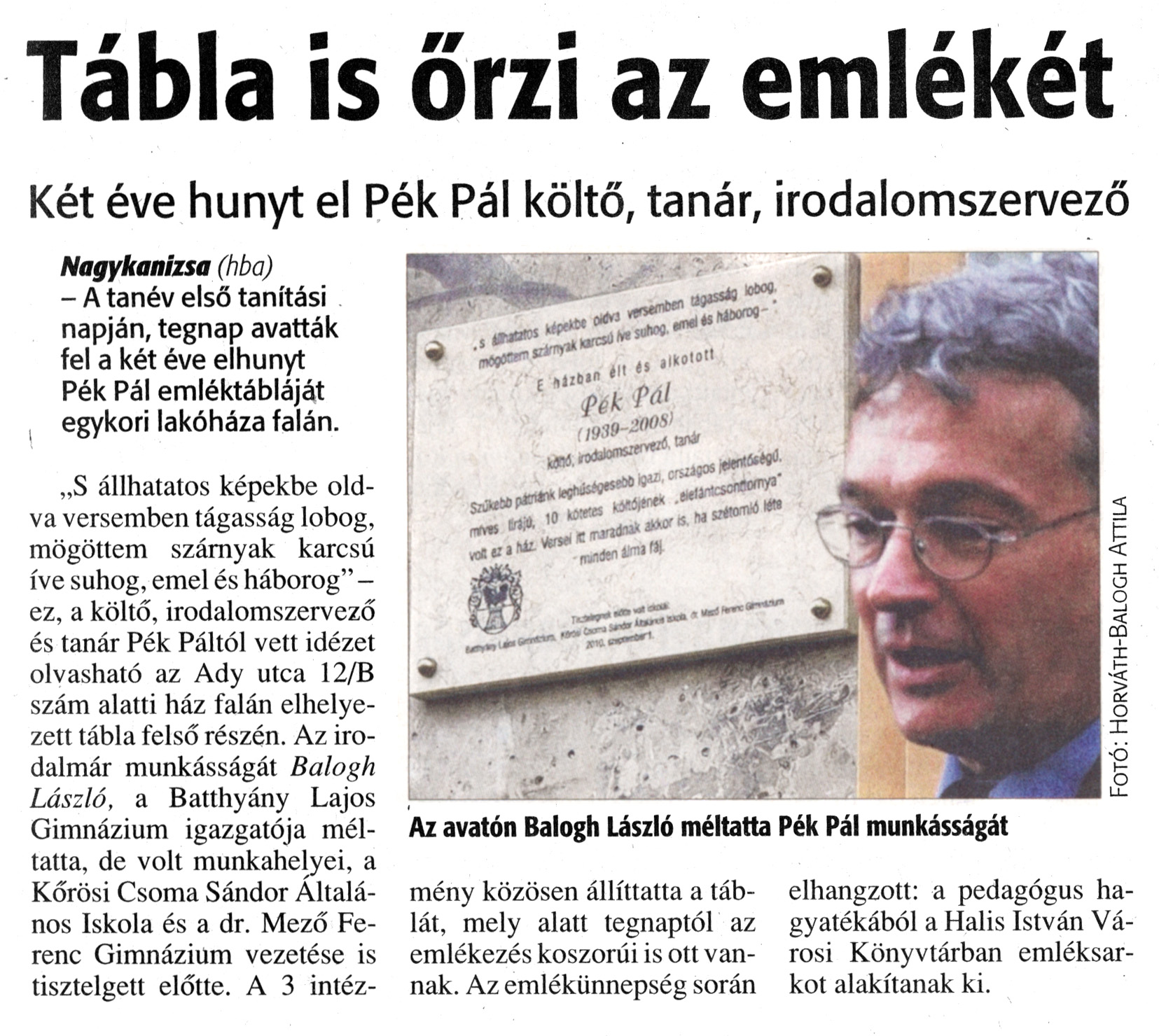 Nyilvános 1100 | 1266 | Zalai Hírlap 2010. szeptember 2. 204. szám 4. oldal - Tábla is őrzi emlékét | A cikk szövege: Tábla is őrzi az emlékét Két éve hunyt el Pék Pál költő, tanár, irodalomszervező Nagykanizsa (hba) - A tanév első tanítási napján, tegnap avatták fel a két éve elhunyt Pék Pál emléktábláját egykori lakóháza falán. „S állhatatos képekbe oldva versemben tágasság lobog, mögöttem szárnyak karcsú íve suhog, emel és háborog" -ez, a költő, irodalomszervező és tanár Pék Páltól vett idézet olvasható az Ady utca 12/B szám alatti ház falán elhelyezett tábla felső részén. Az irodalmár munkásságát Balogh László, a Batthyány Lajos Gimnázium igazgatója méltatta, de volt munkahelyei, a Kőrösi Csoma Sándor Általános Iskola és a dr. Mező Ferenc Gimnázium vezetése is tisztelgett előtte. A 3 intézmény közösen állíttatta a táblát, mely alatt tegnaptól az emlékezés koszorúi is ott vannak. Az emlékünnepség során elhangzott: a pedagógus hagyatékából a Halis István Városi Könyvtárban emléksarkot alakítanak ki. Az avatón Balogh László méltatta Pék Pál munkásságát Fotó: Horváth-Balogh Attila |