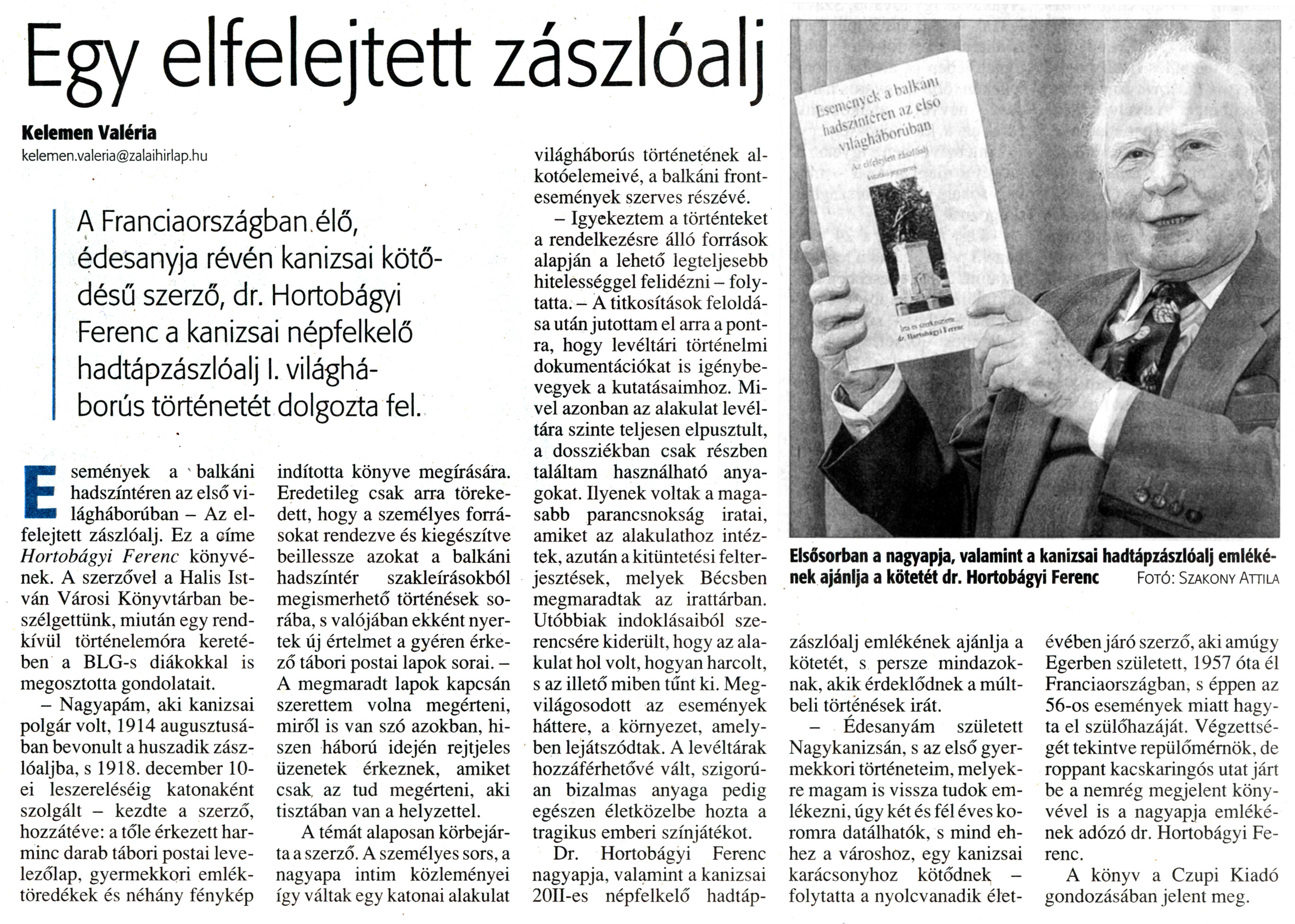 Nyilvános 1835 | 5111 | Zalai Hírlap 2011. június 4. 130. szám 18. oldal - Egy elfelejtett zászlóalj | A cikk szövege: Egy elfelejtett zászlóalj Kelemen Valéria kelemen.valeria@zalaihirlap.hu A Franciaországban élő, édesanyja révén kanizsai kötődésű szerző, dr. Hortobágyi Ferenc a kanizsai népfelkelő hadtápzászlóalj I. világháborús történetét dolgozta fel. Elsősorban a nagyapja, valamint a kanizsai hadtápzászlóalj emlékének ajánlja a kötetét dr. Hortobágyi Ferenc Fotó: Szakony Attila Események a balkáni hadszíntéren az első világháborúban - Az elfelejtett zászlóalj. Ez a címe Hortobágyi Ferenc könyvének. A szerzővel a Halis István Városi Könyvtárban beszélgettünk, miután egy rendkívüli történelemóra keretében a BLG-s diákokkal is megosztotta gondolatait. - Nagyapám, aki kanizsai polgár volt, 1914 augusztusában bevonult a huszadik zászlóaljba, s 1918. december 10-ei leszereléséig katonaként szolgált - kezdte a szerző, hozzátéve: a tőle érkezett harminc darab tábori postai levelezőlap, gyermekkori emléktöredékek és néhány fénykép indította könyve megírására. Eredetileg csak arra törekedett, hogy a személyes forrásokat rendezve és kiegészítve beillessze azokat a balkáni hadszíntér szakleírásokból megismerhető történések sorába, s valójában ekként nyertek új értelmet a gyéren érkező tábori postai lapok sorai. - A megmaradt lapok kapcsán szerettem volna megérteni, miről is van szó azokban, hiszen háború idején rejtjeles üzenetek érkeznek, amiket csak, az tud megérteni, aki tisztában van a helyzettel. A témát alaposan körbejárta a szerző. A személyes sors, a nagyapa intim közleményei így váltak egy katonai alakulat világháborús történetének alkotóelemeivé, a balkáni frontesemények szerves részévé. - Igyekeztem a történteket a rendelkezésre álló források alapján a lehető legteljesebb hitelességgel felidézni - folytatta. - A titkosítások feloldása után jutottam el arra a pontra, hogy levéltári történelmi dokumentációkat is igénybe vegyek a kutatásaimhoz. Mivel azonban az alakulat levéltára szinte teljesen elpusztult, a dossziékban csak részben találtam használható anyagokat. Ilyenek voltak a magasabb parancsnokság iratai, amiket az alakulathoz intéztek, azután a kitüntetési felterjesztések, melyek Bécsben megmaradtak az irattárban. Utóbbiak indoklásaiból szerencsére kiderült, hogy az alakulat hol volt, hogyan harcolt, s az illető miben tűnt ki. Megvilágosodott az események háttere, a környezet, amelyben lejátszódtak. A levéltárak hozzáférhetővé vált, szigorúan bizalmas anyaga pedig egészen életközelbe hozta a tragikus emberi színjátékot. Dr. Hortobágyi Ferenc nagyapja, valamint a kanizsai 20 II-es népfelkelő hadtápzászlóalj emlékének ajánlja a kötetét, s persze mindazoknak, akik érdeklődnek a múltbeli történések iránt. - Édesanyám született Nagykanizsán, s az első gyermekkori történeteim, melyekre magam is vissza tudok emlékezni, úgy két és fél éves koromra datálhatok, s mind ehhez a városhoz, egy kanizsai karácsonyhoz kötődnek -folytatta a nyolcvanadik élet- évében járó szerző, aki amúgy Egerben született, 1957 óta él Franciaországban, s éppen az 56-os események miatt hagyta el szülőhazáját. Végzettségét tekintve repülőmérnök, de roppant kacskaringós utat járt be a nemrég megjelent könyvével is a nagyapja emlékének adózó dr. Hortobágyi Ferenc. A könyv a Czupi Kiadó gondozásában jelent meg. |