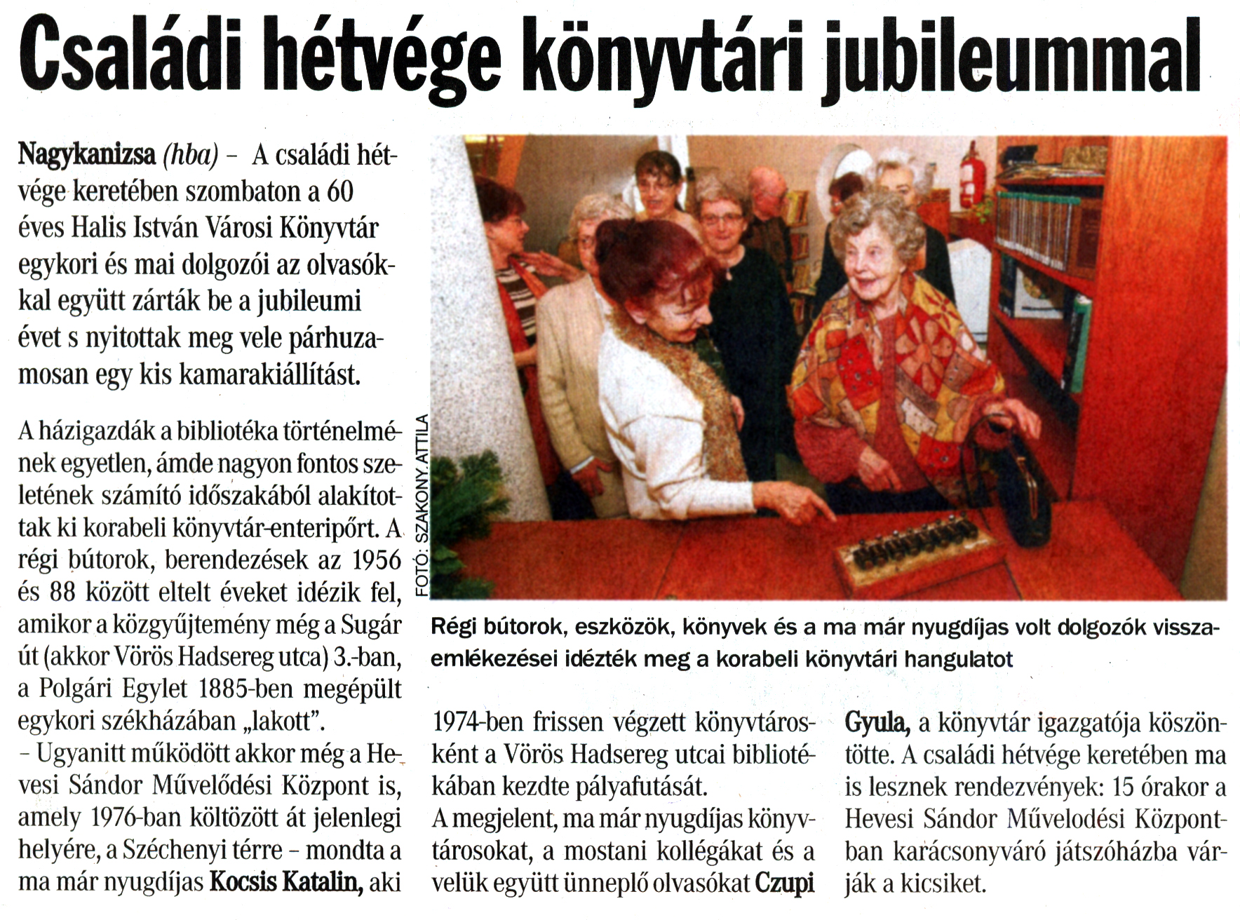 Nyilvános 1816 | 5915 | Vasárnapi Zalai Hírlap 2011. december 11. 48. szám 1. oldal - Családi hétvége könyvtári jubileummal | Családi hétvége könyvtári jubileummal Nagykanizsa (hba) - A családi hétvége keretében szombaton a 60 éves Halis István Városi Könyvtár egykori és mai dolgozói az olvasókkal együtt zárták be a jubileumi évet s nyitottak meg vele párhuzamosan egy kis kamarakiállítást. A házigazdák a bibliotéka történelmének egyetlen, ámde nagyon fontos szeletének számító időszakából alakítottak ki korabeli könyvtár-enteripőrt. A régi bútorok, berendezések az 1956 és 88 között eltelt éveket idézik fel, amikor a közgyűjtemény még a Sugár út (akkor Vörös Hadsereg utca) 3.-ban, a Polgári Egylet 1885-ben megépült egykori székházában „lakott". - Ugyanitt működött akkor még a Hevesi Sándor Művelődési Központ is, amely 1976-ban költözött át jelenlegi helyére, a Széchenyi térre - mondta a ma már nyugdíjas Kocsis Katalin, aki 1974-ben frissen végzett könyvtárosként a Vörös Hadsereg utcai bibliotékában kezdte pályafutását. A megjelent, ma már nyugdíjas könyvtárosokat, a mostani kollégákat és a velük együtt ünneplő olvasókat Czupi Gyula, a könyvtár igazgatója köszöntötte. A családi hétvége keretében ma is lesznek rendezvények: 15 órakor a Hevesi Sándor Művelődési Központban karácsonyváró játszóházba várják a kicsiket. Régi bútorok, eszközök, könyvek és a ma már nyugdíjas volt dolgozók visszaemlékezései idézték meg a korabeli könyvtári hangulatot |