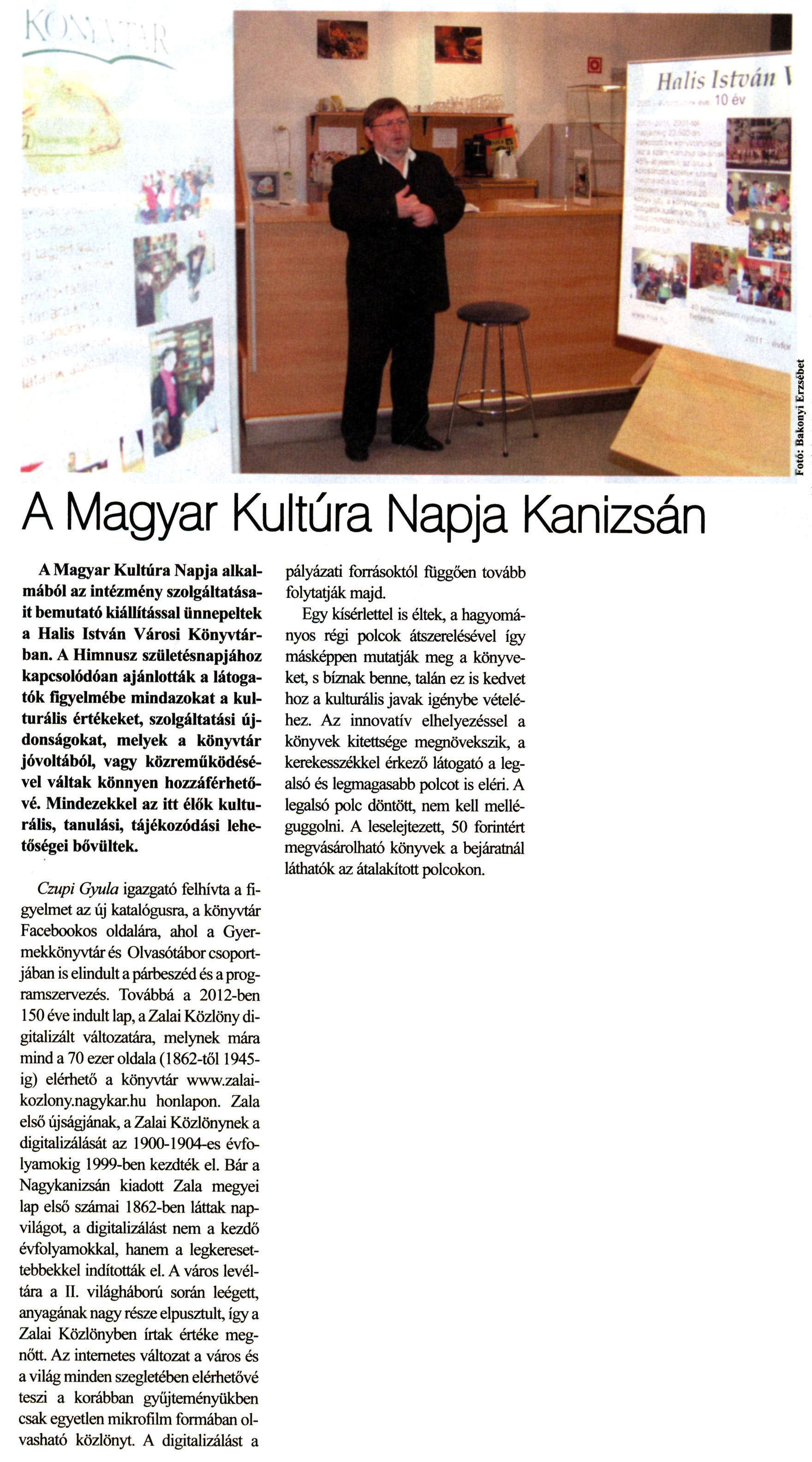 Nyilvános 2185 | 7310 | Kanizsa 2012. január 26. 3. szám 2. oldal - A Magyar Kultúra Napja Kanizsán | A Magyar Kultúra Napja Kanizsán A Magyar Kultúra Napja alkalmából az intézmény szolgáltatásait bemutató kiállítással ünnepeltek a Halis István Városi Könyvtárban. A Himnusz születésnapjához kapcsolódóan ajánlották a látogatók figyelmébe mindazokat a kulturális értékeket, szolgáltatási újdonságokat, melyek a könyvtár jóvoltából, vagy közreműködésével váltak könnyen hozzáférhetővé. Mindezekkel az itt élők kulturális, tanulási, tájékozódási lehetőségei bővültek. Czupi Gyula igazgató felhívta a figyelmet az új katalógusra, a könyvtár Facebookos oldalára, ahol a Gyermekkönyvtár és Olvasótábor csoportjában is elindult a párbeszéd és a programszervezés. Továbbá a 2012-ben 150 éve indult lap, a Zalai Közlöny digitalizált változatára, melynek mára mind a 70 ezer oldala (1862-től 1945-ig) elérhető a könyvtár www.zalai-kozlony.nagykar.hu honlapon. Zala első újságjának, a Zalai Közlönynek a digitalizálását az 1900-1904-es évfolyamokig 1999-ben kezdték el. Bár a Nagykanizsán kiadott Zala megyei lap első számai 1862-ben láttak napvilágot, a digitalizálást nem a kezdő évfolyamokkal, hanem a legkeresettebbekkel indították el. A város levéltára a II. világháború során leégett, anyagának nagy része elpusztult, így a Zalai Közlönyben írtak értéke megnőtt. Az internetes változat a város és a világ minden szegletében elérhetővé teszi a korábban gyűjteményükben csak egyetlen mikrofilm formában olvasható közlönyt. A digitalizálást a pályázati forrásoktól függően tovább folytatják majd. Egy kísérlettel is éltek, a hagyományos régi polcok átszerelésével így másképpen mutatják meg a könyveket, s bíznak benne, talán ez is kedvet hoz a kulturális javak igénybe vételéhez. Az innovatív elhelyezéssel a könyvek kitettsége megnövekszik, a kerekesszékkel érkező látogató a legalsó és legmagasabb polcot is eléri. A legalsó polc döntött, nem kell melléguggolni. A leselejtezett, 50 forintért megvásárolható könyvek a bejáratnál láthatók az átalakított polcokon. |