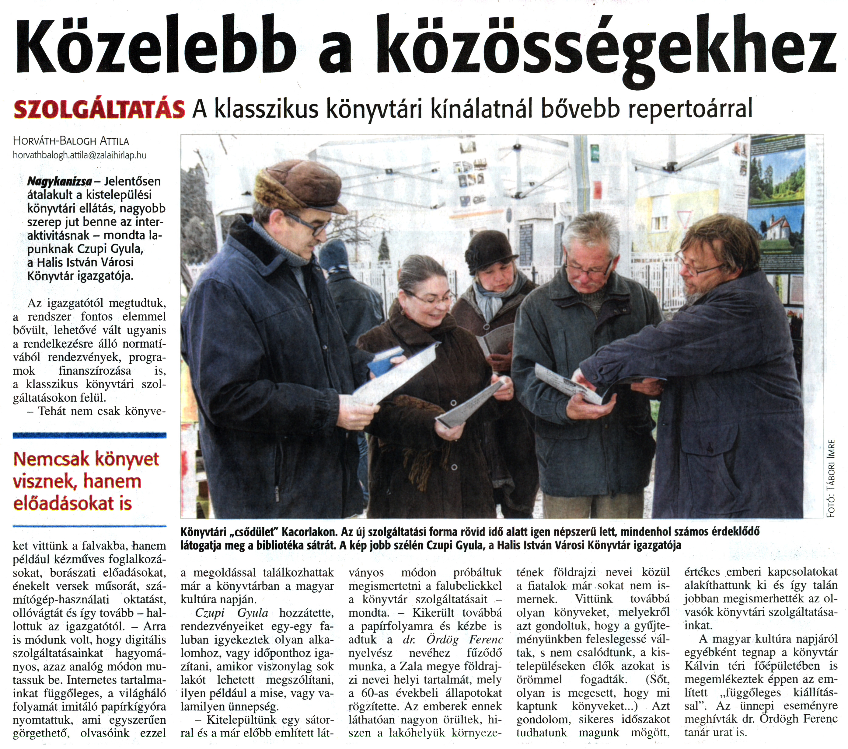 Nyilvános 2111 | 5146 | Zalai Hírlap 2014. január 23. 19. szám 11. oldal - Közelebb a közösségekhez | Közelebb a közösségekhez SZOLGÁLTATÁSA klasszikus könyvtári kínálatnál bővebb repertoárral Nemcsak könyvet visznek, hanem előadásokat is Horváth-Balogh Attila horvathbalogh.attila@zalaihirlap.hu Nagykanizsa - Jelentősen átalakult a kistelepülési könyvtári ellátás, nagyobb szerep jut benne az interaktivitásnak - mondta lapunknak Czupi Gyula, a Halis István Városi Könyvtár igazgatója. Az igazgatótól megtudtuk, a rendszer fontos elemmel bővült, lehetővé vált ugyanis a rendelkezésre álló normatívából rendezvények, programok finanszírozása is, a klasszikus könyvtári szolgáltatásokon felül. - Tehát nem csak könyveket vittünk a falvakba, hanem például kézműves foglalkozásokat, borászati előadásokat, énekelt versek műsorát, számítógép-használati oktatást, ollóvágtát és így tovább - hallottuk az igazgatótól. - Arra is módunk volt, hogy digitális szolgáltatásainkat hagyományos, azaz analóg módon mutassuk be. Internetes tartalmainkat függőleges, a világháló folyamát imitáló papírkígyóra nyomtattuk, ami egyszerűen görgethető, olvasóink ezzel a megoldással találkozhattak már a könyvtárban a magyar kultúra napján. Czupi Gyula hozzátette, rendezvényeiket egy-egy faluban igyekeztek olyan alkalomhoz, vagy időponthoz igazítani, amikor viszonylag sok lakót lehetett megszólítani, ilyen például a mise, vagy valamilyen ünnepség. - Kitelepültünk egy sátorral és a már előbb említett lát- ványos módon próbáltuk megismertetni a falubeliekkel a könyvtár szolgáltatásait -mondta. - Kikerült továbbá a papírfolyamra és kézbe is adtuk a dr. Ördög Ferenc nyelvész nevéhez fűződő munka, a Zala megye földrajzi nevei helyi tartalmát, mely a 60-as évekbeli állapotokat rögzítette. Az emberek ennek láthatóan nagyon örültek, hiszen a lakóhelyük környezetének földrajzi nevei közül a fiatalok már sokat nem ismernek. Vittünk továbbá olyan könyveket, melyekről azt gondoltuk, hogy a gyűjteményünkben feleslegessé váltak, s nem csalódtunk, a kistelepüléseken élők azokat is örömmel fogadták. (Sőt, olyan is megesett, hogy mi kaptunk könyveket...) Azt gondolom, sikeres időszakot tudhatunk magunk mögött. értékes emberi kapcsolatokat alakíthattunk ki és így talán jobban megismerhették az olvasók könyvtári szolgáltatásainkat. A magyar kultúra napjáról egyébként tegnap a könyvtár Kálvin téri főépületében is megemlékeztek éppen az említett „függőleges kiállítással". Az ünnepi eseményre meghívták dr. Ördög Ferenc tanár urat is. Könyvtári „csődület" Kacorlakon. Az új szolgáltatási forma rövid idő alatt igen népszerű lett, mindenhol számos érdeklődő látogatja meg a bibliotéka sátrát. A kép jobb szélén Czupi Gyula, a Halis István Városi Könyvtár igazgatója Fotó: Tábori Imre |