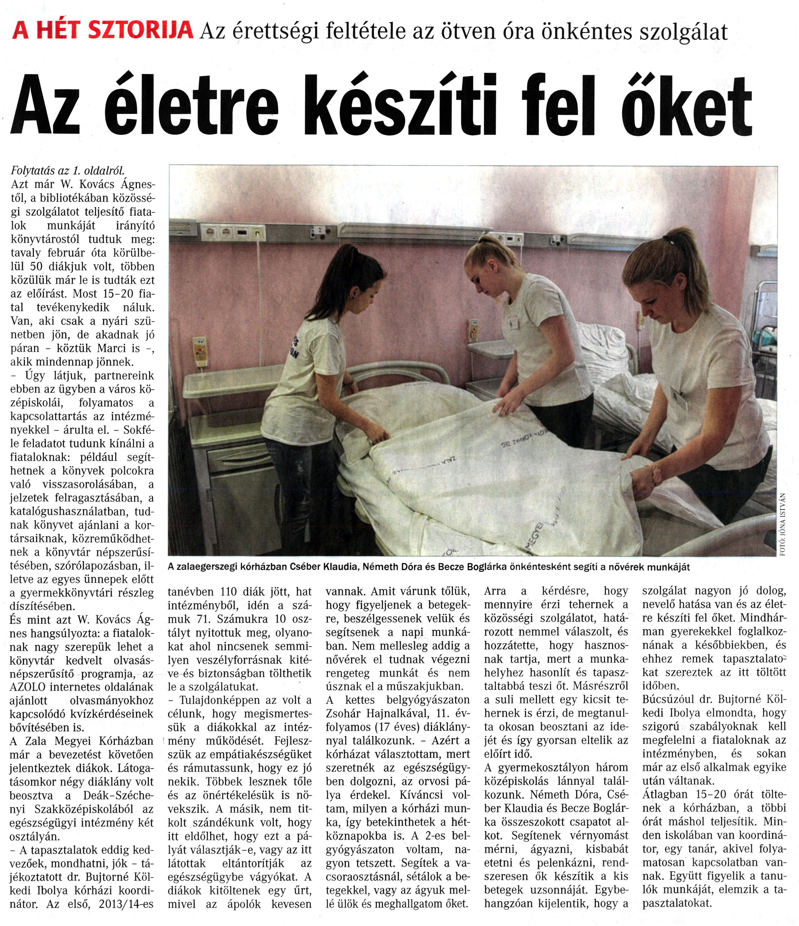 Nyilvános 1885 | 4514 | Vasárnapi Zalai Hírlap 2015. február 1. 5. szám 3. oldal - Az életre készíti fel őket | A cikk előzménye: http://www.nagykar.hu/keptar/7307/60358.html m' A HET SZTORIJA Az érettségi feltétele az ötven óra önkéntes szolgálat Az életre készíti fel őket A zalaegerszegi kórházban Cséber Klaudia, Németh Dóra és Becze Boglárka önkéntesként segíti a nővérek munkáját Folytatás az 1. oldalról. Azt már W. Kovács Ágnestől, a bibliotékában közösségi szolgálatot teljesítő fiatalok munkáját irányító könyvtárostól tudtuk meg: tavaly február óta körülbelül 50 diákjuk volt, többen közülük már le is tudták ezt az előírást. Most 15-20 fiatal tevékenykedik náluk. Van, aki csak a nyári szünetben jön, de akadnak jó páran - köztük Marci is -, akik mindennap jönnek. - Úgy látjuk, partnereink ebben az ügyben a város középiskolái, folyamatos a kapcsolattartás az intézményekkel - árulta el. - Sokféle feladatot tudunk kínálni a fiataloknak: például segíthetnek a könyvek polcokra való visszasorolásában, a jelzetek felragasztásában, a katalógushasználatban, tudnak könyvet ajánlani a kortársaiknak, közreműködhetnek a könyvtár népszerűsítésében, szórólapozásban, illetve az egyes ünnepek előtt a gyermekkönyvtári részleg díszítésében. És mint azt W. Kovács Ágnes hangsúlyozta: a fiataloknak nagy szerepük lehet a könyvtár kedvelt olvasásnépszerűsítő programja, az AZOLO internetes oldalának ajánlott olvasmányokhoz kapcsolódó kvízkérdéseinek bővítésében is. A Zala Megyei Kórházban már a bevezetést követően jelentkeztek diákok. Látogatásomkor négy diáklány volt beosztva a Deák-Széchenyi Szakközépiskolából az egészségügyi intézmény két osztályán. - A tapasztalatok eddig kedvezőek, mondhatni, jók - tájékoztatott dr. Bujtorné Köl-kedi Ibolya kórházi koordinátor. Az első, 2013/14-es tanévben 110 diák jött, hat intézményből, idén a számuk 71. Számukra 10 osztályt nyitottuk meg, olyanokat ahol nincsenek semmilyen veszélyforrásnak kitéve és biztonságban tölthetik le a szolgálatukat. - Tulajdonképpen az volt a célunk, hogy megismertessük a diákokkal az intézmény működését. Fejlesz-szük az empátiakészségüket és rámutassunk, hogy ez jó nekik. Többek lesznek tőle és az önértékelésük is növekszik. A másik, nem titkolt szándékunk volt, hogy itt eldőlhet, hogy ezt a pályát választják-e, vagy az itt látottak eltántorítják az egészségügybe vágyókat. A diákok kitöltenek egy űrt, mivel az ápolók kevesen vannak. Amit várunk tőlük, hogy figyeljenek a betegekre, beszélgessenek velük és segítsenek a napi munkában. Nem mellesleg addig a nővérek el tudnak végezni rengeteg munkát és nem úsznak el a műszakjukban. A kettes belgyógyászaton Zsohár Hajnalkával, 11. évfolyamos (17 éves) diáklánynyal találkozunk. - Azért a kórházat választottam, mert szeretnék az egészségügyben dolgozni, az orvosi pálya érdekel. Kíváncsi voltam, milyen a kórházi munka, így betekinthetek a hétköznapokba is. A 2-es belgyógyászaton voltam, nagyon tetszett. Segítek a vacsoraosztásnál, sétálok a betegekkel, vagy az ágyuk mellé ülök és meghallgatom őket. Arra a kérdésre, hogy mennyire érzi tehernek a közösségi szolgálatot, határozott nemmel válaszolt, és hozzátette, hogy hasznosnak tartja, mert a munkahelyhez hasonlít és tapasztaltabbá teszi őt. Másrészről a suli mellett egy kicsit tehernek is érzi, de megtanulta okosan beosztani az idejét és így gyorsan eltelik az előírt idő. A gyermekosztályon három középiskolás lánnyal találkozunk. Németh Dóra, Cséber Klaudia és Becze Boglárka összeszokott csapatot alkot. Segítenek vérnyomást mérni, ágyazni, kisbabát etetni és pelenkázni, rendszeresen ők készítik a kis betegek uzsonnáját. Egybehangzóan kijelentik, hogy a > szolgálat nagyon jó dolog, nevelő hatása van és az életre készíti fel őket. Mindhárman gyerekekkel foglalkoznának a későbbiekben, és ehhez remek tapasztalatokat szereztek az itt töltött időben. Búcsúzóul dr. Bujtorné Köl-kedi Ibolya elmondta, hogy szigorú szabályoknak kell megfelelni a fiataloknak az intézményben, és sokan már az első alkalmak egyike után váltanak. Átlagban 15-20 órát töltenek a kórházban, a többi órát máshol teljesítik. Minden iskolában van koordinátor, egy tanár, akivel folyamatosan kapcsolatban vannak. Együtt figyelik a tanulók munkáját, elemzik a tapasztalatokat. |