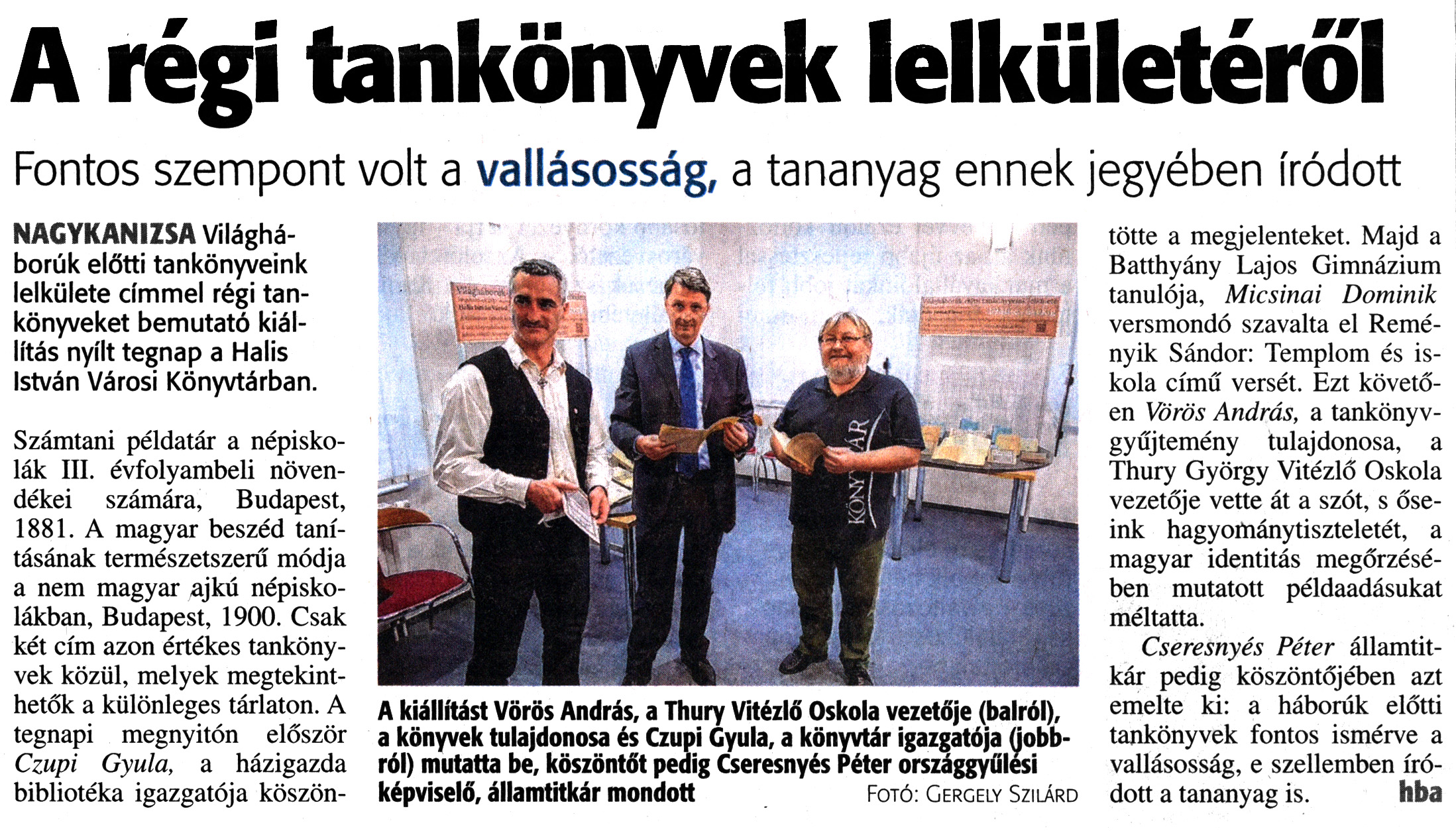 Nyilvános 1623 | 3013 | Zalai Hírlap 2017. október 28. 252. szám 3. oldal | A régi tankönyvek lelkületéről Fontos szempont volt a vallásosság, a tananyag ennek jegyében íródott NAGYKANIZSA Világháborúk előtti tankönyveink lelkülete címmel régi tankönyveket bemutató kiállítás nyílt tegnap a Halis István Városi Könyvtárban. Számtani példatár a népiskolák III. évfolyambeli növendékei számára, Budapest, 1881. A magyar beszéd tanításának természetszerű módja a nem magyar ajkú népiskolákban, Budapest, 1900. Csak két cím azon értékes tankönyvek közül, melyek megtekinthetők a különleges tárlaton. A tegnapi megnyitón először Czupi Gyula, a házigazda bibliotéka igazgatója köszöntötte a megjelenteket. Majd a Batthyány Lajos Gimnázium tanulója, Micsinai Dominik versmondó szavalta el Reményik Sándor: Templom és iskola című versét. Ezt követően Vörös András, a tankönyvgyűjtemény tulajdonosa, a Thury György Vitézlő Oskola vezetője vette át a szót, s őseink hagyománytiszteletét, a magyar identitás megőrzésében mutatott példaadásukat méltatta. Cseresnyés Péter államtitkár pedig köszöntőjében azt emelte ki: a háborúk előtti tankönyvek fontos ismérve a vallásosság, e szellemben íródott a tananyag is. hba A kiállítást Vörös András, a Thury Vitézlő Oskola vezetője (balról), a könyvek tulajdonosa és Czupi Gyula, a könyvtár igazgatója (jobbról) mutatta be, köszöntőt pedig Cseresnyés Péter országgyűlési képviselő, államtitkár mondott Fotó: Gergely Szilárd |