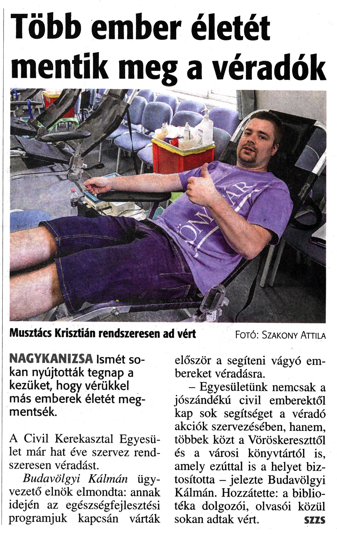 Nyilvános 1684 | 2947 | Zalai Hírlap 2018. május 12. 109. szám 3. oldal | Több ember életét mentik meg a véradók Musztács Krisztián rendszeresen ad vért Fotó: Szakony Attila NAGYKANIZSA Ismét sokan nyújtották tegnap a kezüket, hogy vérükkel más emberek életét megmentsék. A Civil Kerekasztal Egyesület már hat éve szervez rendszeresen véradást. Budavölgyi Kálmán ügyvezető elnök elmondta: annak idején az egészségfejlesztési programjuk kapcsán várták először a segíteni vágyó embereket véradásra. - Egyesületünk nemcsak a jószándékú civil emberektől kap sok segítséget a véradó akciók szervezésében, hanem, többek közt a Vöröskereszttől és a városi könyvtártól is, amely ezúttal is a helyet biztosította - jelezte Budavölgyi Kálmán. Hozzátette: a bibliotéka dolgozói, olvasói közül sokan adtak vért. SZZS |
