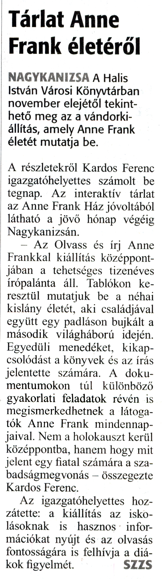Nyilvános 1574 | 2583 | Zalai Hírlap 2018. október 31. 253. szám 1. oldal | Tárlat Anne Frank életéről NAGYKANIZSA A Halis István Városi Könyvtárban november elejétől tekinthető meg az a vándorkiállítás, amely Anne Frank életét mutatja be. A részletekről Kardos Ferenc igazgatóhelyettes számolt be tegnap. Az interaktív tárlat az Anne Frank Ház jóvoltából látható a jövő hónap végéig Nagykanizsán. - Az Olvass és írj Anne Frankkal kiállítás középpontjában a tehetséges tizenéves írópalánta áll. Tablókon keresztül mutatjuk be a néhai kislány életét, aki családjával együtt egy padláson bujkált a második világháború idején. Egyedüli menedéket, kikapcsolódást a könyvek és az írás jelentette számára. A dokumentumokon túl különböző gyakorlati feladatok révén is megismerkedhetnek a látogatók Anne Frank mindennapjaival. Nem a holokauszt kerül középpontba, hanem hogy mit jelent egy fiatal számára a szabadságmegvonás - összegezte Kardos Ferenc. Az igazgatóhelyettes hozzátette: a kiállítás az iskolásoknak is hasznos információkat nyújt és az olvasás fontosságára is felhívja a diákok figyelmét. SZZS |