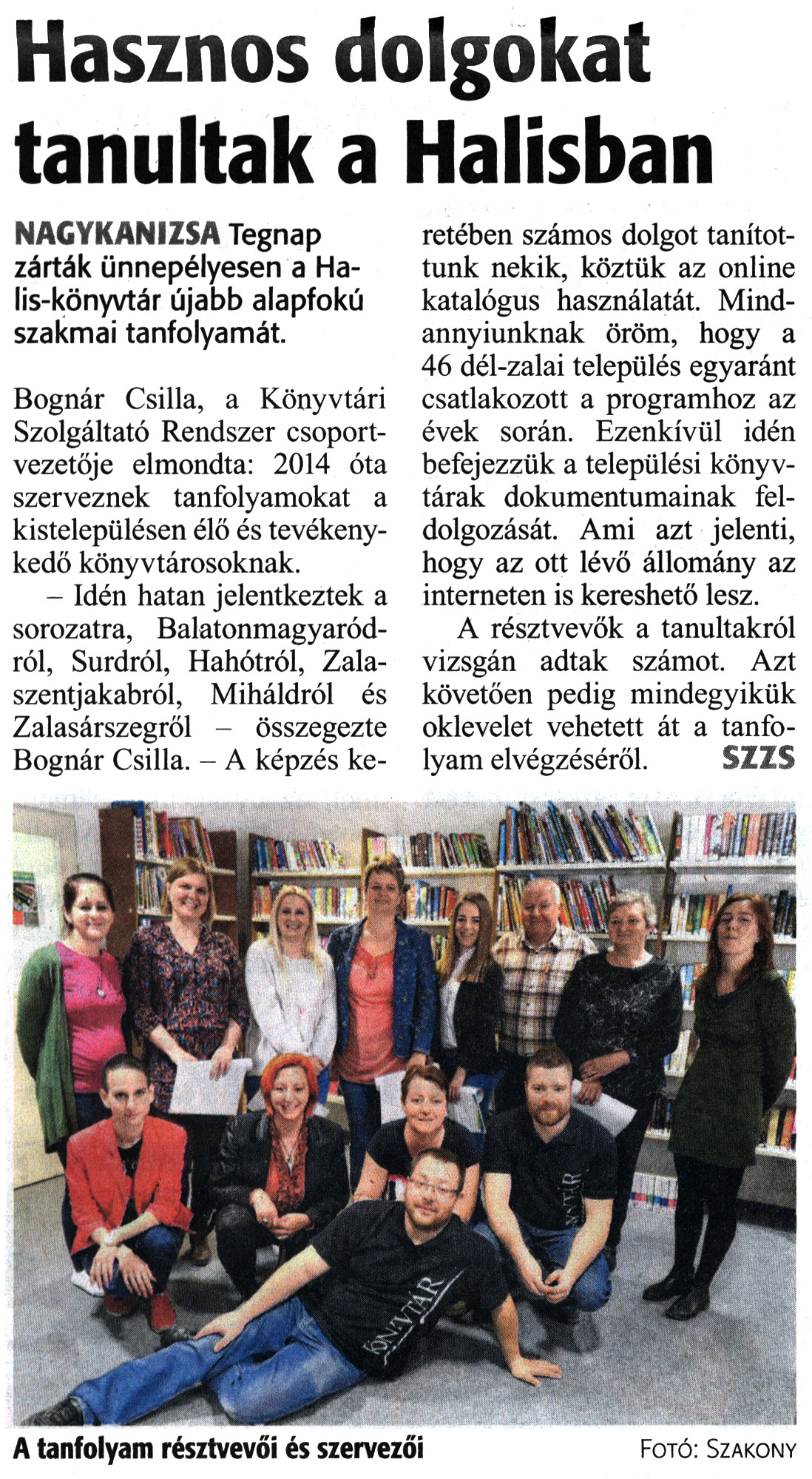 Nyilvános 1522 | 2791 | Zalai Hírlap 2019. április 10. 84. szám 3. oldal | Hasznos dolgokat tanultak a Halisban NAGYKANIZSA Tegnap zárták ünnepélyesen a Halis-könyvtár újabb alapfokú szakmai tanfolyamát. Bognár Csilla, a Könyvtári Szolgáltató Rendszer csoportvezetője elmondta: 2014 óta szerveznek tanfolyamokat a kistelepülésen élő és tevékenykedő könyvtárosoknak. - Idén hatan jelentkeztek a sorozatra, Balatonmagyaródról, Surdról, Hahótról, Zalaszentjakabról, Miháldról és Zalasárszegről - összegezte Bognár Csilla. - A képzés keretében számos dolgot tanítottunk nekik, köztük az online katalógus használatát. Mindannyiunknak öröm, hogy a 46 dél-zalai település egyaránt csatlakozott a programhoz az évek során. Ezenkívül idén befejezzük a települési könyvtárak dokumentumainak feldolgozását. Ami azt jelenti, hogy az ott lévő állomány az interneten is kereshető lesz. A résztvevők a tanultakról vizsgán adtak számot. Azt követően pedig mindegyikük oklevelet vehetett át a tanfolyam elvégzéséről. SZZS |