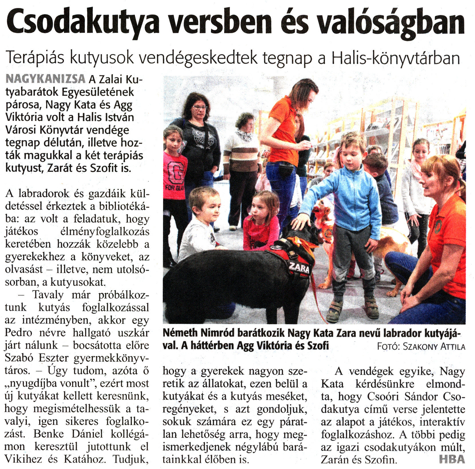 Nyilvános 1328 | 2011 | Zalai Hírlap 2020. február 29. 51. szám 3. oldal | Csodakutya versben és valóságban Terápiás kutyusok vendégeskedtek tegnap a Halis-könyvtárban Németh Nimród barátkozik Nagy Kata Zara nevű labrador kutyájával. A háttérben Agg Viktória és Szofi Fotó: Szakony Attila NAGYKANIZSA A Zalai Kutyabarátok Egyesületének párosa, Nagy Kata és Agg Viktória volt a Halis István Városi Könyvtár vendége tegnap délután, illetve hozták magukkal a két terápiás kutyust, Zarát és Szofit is. A labradorok és gazdáik küldetéssel érkeztek a bibliotékába: az volt a feladatuk, hogy játékos élményfoglalkozás keretében hozzák közelebb a gyerekekhez a könyveket, az olvasást - illetve, nem utolsósorban, a kutyusokat. - Tavaly már próbálkoztunk kutyás foglalkozással az intézményben, akkor egy Pedro névre hallgató uszkár járt nálunk - bocsátotta előre Szabó Eszter gyermekkönyvtáros. - Úgy tudom, azóta ő „nyugdíjba vonult", ezért most új kutyákat kellett keresnünk, hogy megismételhessük a tavalyi, igen sikeres foglalkozást. Benke Dániel kollégámon keresztül jutottunk el Vikihez és Katához. Tudjuk, hogy a gyerekek nagyon szeretik az állatokat, ezen belül a kutyákat és a kutyás meséket, regényeket, s azt gondoljuk, sokuk számára ez egy páratlan lehetőség arra, hogy megismerkedjenek négylábú barátainkkal élőben is. A vendégek egyike, Nagy Kata kérdésünkre elmondta, hogy Csoóri Sándor Csodakutya című verse jelentette az alapot a játékos, interaktív foglalkozáshoz. A többi pedig az igazi csodakutyákon múlt, Zarán és Szofin. HBA |