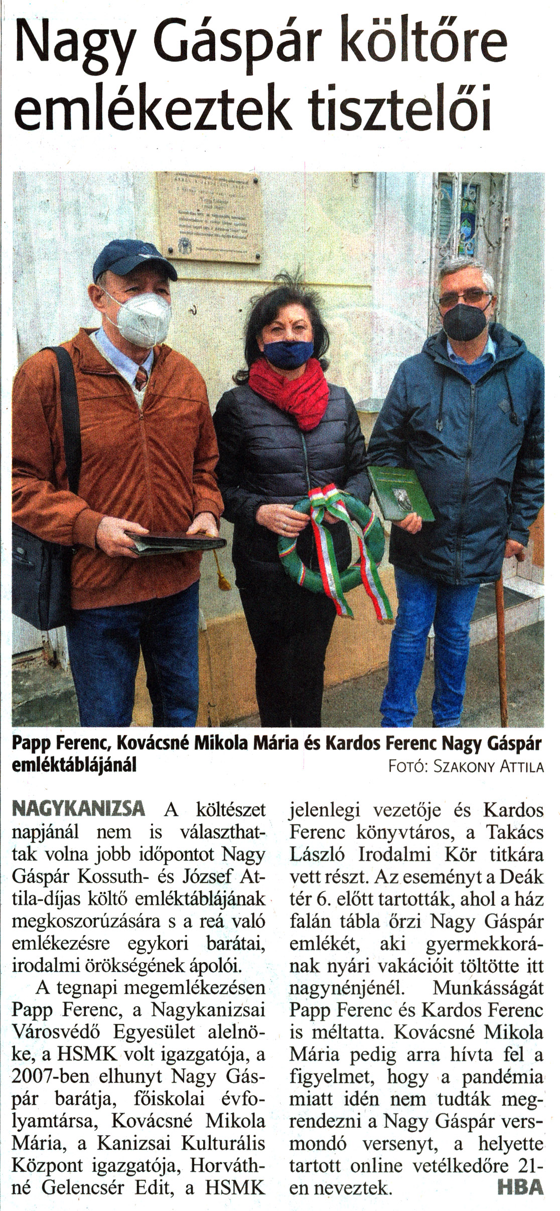 Nyilvános 1280 | 1702 | Zalai Hírlap 2021. április 12. 83. szám 3. oldal | Nagy Gáspár költőre emlékeztek tisztelői Papp Ferenc, Kovácsné Mikola Mária és Kardos Ferenc Nagy Gáspár emléktáblájánál Fotó: Szakony Attila NAGYKANIZSA A költészet napjánál nem is választhattak volna jobb időpontot Nagy Gáspár Kossuth- és József Attila-díjas költő emléktáblájának megkoszorúzására s a reá való emlékezésre egykori barátai, irodalmi örökségének ápolói. A tegnapi megemlékezésen Papp Ferenc, a Nagykanizsai Városvédő Egyesület alelnöke, a HSMK volt igazgatója, a 2007-ben elhunyt Nagy Gáspár barátja, főiskolai évfolyamtársa, Kovácsné Mikola Mária, a Kanizsai Kulturális Központ igazgatója, Horváthné Gelencsér Edit, a HSMK jelenlegi vezetője és Kardos Ferenc könyvtáros, a Takács László Irodalmi Kör titkára vett részt. Az eseményt a Deák tér 6. előtt tartották, ahol a ház falán tábla őrzi Nagy Gáspár emlékét, aki gyermekkorának nyári vakációit töltötte itt nagynénjénél. Munkásságát Papp Ferenc és Kardos Ferenc is méltatta. Kovácsné Mikola Mária pedig arra hívta fel a figyelmet, hogy a pandémia miatt idén nem tudták megrendezni a Nagy Gáspár versmondó versenyt, a helyette tartott online vetélkedőre 21-en neveztek. HBA |
