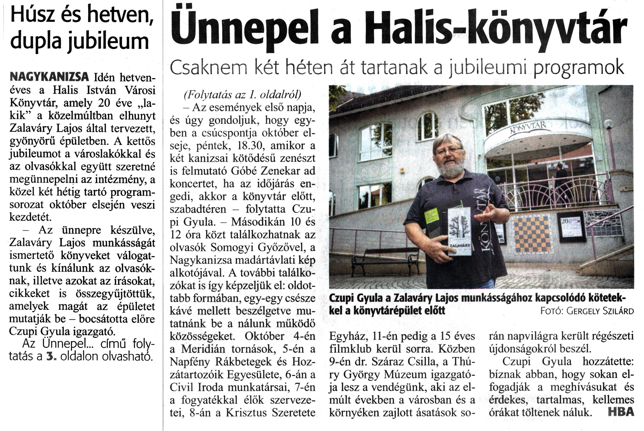 Nyilvános 1129 | 1471 | Zalai Hírlap 2021. szeptember 24. 222. szám, 1, 3. oldal | Húsz és hetven, dupla jubileum NAGYKANIZSA Idén hetvenéves a Halis István Városi Könyvtár, amely 20 éve „lakik" a közelmúltban elhunyt Zalaváry Lajos által tervezett, gyönyörű épületben. A kettős jubileumot a városlakókkal és az olvasókkal együtt szeretné megünnepelni az intézmény, a közel két hétig tartó programsorozat október elsején veszi kezdetét. - Az ünnepre készülve, Zalaváry Lajos munkásságát ismertető könyveket válogattunk és kínálunk az olvasóknak, illetve azokat az írásokat, cikkeket is összegyűjtöttük, amelyek magát az épületet mutatják be - bocsátotta előre Czupi Gyula igazgató. Az Ünnepel... című folytatás a 3. oldalon olvasható. Ünnepel a Halis-könyvtár Csaknem két héten át tartanak a jubileumi programok (Folytatás az 1. oldalról) - Az események első napja, és úgy gondoljuk, hogy egyben a csúcspontja október elseje, péntek, 18.30, amikor a két kanizsai kötődésű zenészt is felmutató Góbé Zenekar ad koncertet, ha az időjárás engedi, akkor a könyvtár előtt, szabadtéren - folytatta Czupi Gyula. - Másodikán 10 és 12 óra közt találkozhatnak az olvasók Somogyi Győzővel, a Nagykanizsa madártávlati kép alkotójával. A további találkozókat is így képzeljük el: oldottabb formában, egy-egy csésze kávé mellett beszélgetve mutatnánk be a nálunk működő közösségeket. Október 4-én a Meridián tornások, 5-én a Napfény Rákbetegek és Hozzátartozóik Egyesülete, 6-án a Civil Iroda munkatársai, 7-én a fogyatékkal élők szervezetei, 8-án a Krisztus Szeretete Egyház, 11-én pedig a 15 éves filmklub kerül sorra. Közben 9-én dr. Száraz Csilla, a Thú-ry György Múzeum igazgatója lesz a vendégünk, aki az elmúlt években a városban és a környéken zajlott ásatások során napvilágra került régészeti újdonságokról beszél. Czupi Gyula hozzátette: bíznak abban, hogy sokan elfogadják a meghívásukat és érdekes, tartalmas, kellemes órákat töltenek náluk. HBA Czupi Gyula a Zalaváry Lajos munkásságához kapcsolódó kötetekkel a könyvtárépület előtt Fotó: Gergely Szilárd |
