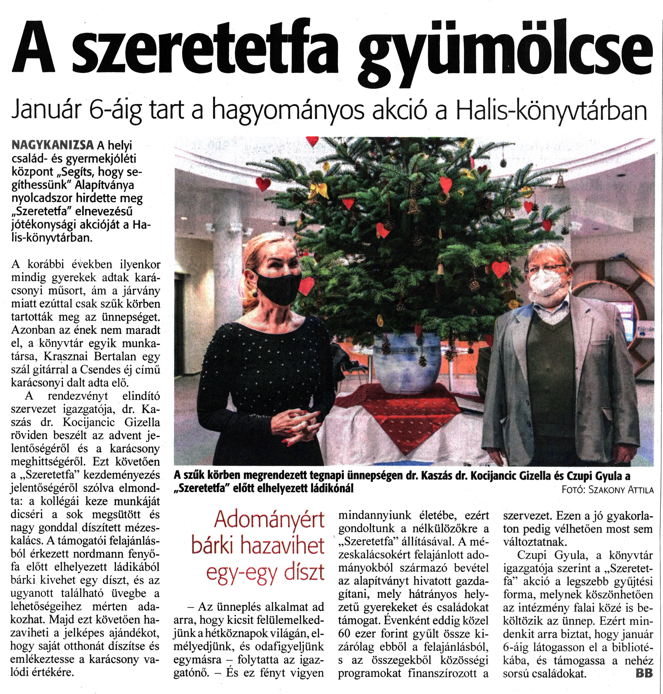 Nyilvános 1194 | 1753 | Zalai Hírlap 2021. december 2. 279. szám 2. oldal | A szeretetfa gyümölcse Január 6-áig tart a hagyományos akció a Halis-könyvtárban NAGYKANIZSA A helyi család- és gyermekjóléti központ „Segíts, hogy segíthessünk" Alapítványa nyolcadszor hirdette meg „Szeretetfa" elnevezésű jótékonysági akcióját a Halis-könyvtárban. A korábbi években ilyenkor mindig gyerekek adtak karácsonyi műsort, ám a járvány miatt ezúttal csak szűk körben tartották meg az ünnepséget. Azonban az ének nem maradt el, a könyvtár egyik munkatársa, Krasznai Bertalan egy szál gitárral a Csendes éj című karácsonyi dalt adta elő. A rendezvényt elindító szervezet igazgatója, dr. Kaszás dr. Kocijancic Gizella röviden beszélt az advent jelentőségéről és a karácsony meghittségéről. Ezt követően a „Szeretetfa" kezdeményezés jelentőségéről szólva elmondta: a kollégái keze munkáját dicséri a sok megsütött és nagy gonddal díszített mézeskalács. A támogatói felajánlásból érkezett nordmann fenyőfa előtt elhelyezett ládikából bárki kivehet egy díszt, és az ugyanott található üvegbe a lehetőségeihez mérten adakozhat. Majd ezt követően hazaviheti a jelképes ajándékot, hogy saját otthonát díszítse és emlékeztesse a karácsony valódi értékére. - Az ünneplés alkalmat ad arra, hogy kicsit felülemelkedjünk a hétköznapok világán, elmélyedjünk, és odafigyeljünk egymásra - folytatta az igazgatónő. - És ez fényt vigyen mindannyiunk életébe, ezért gondoltunk a nélkülözőkre a „Szeretetfa" állításával. A mézeskalácsokért felajánlott adományokból származó bevétel az alapítványt hivatott gazdagítani, mely hátrányos helyzetű gyerekeket és családokat támogat. Évenként eddig közel 60 ezer forint gyűlt össze kizárólag ebből a felajánlásból, s az összegekből közösségi programokat finanszírozott a szervezet. Ezen a jó gyakorlaton pedig vélhetően most sem változtatnak. Czupi Gyula, a könyvtár igazgatója szerint a „Szeretetfa" akció a legszebb gyűjtési forma, melynek köszönhetően az intézmény falai közé is beköltözik az ünnep. Ezért mindenkit arra biztat, hogy január 6-áig látogasson el a bibliotékába, és támogassa a nehéz sorsú családokat. BB A szűk körben megrendezett tegnapi ünnepségen dr. Kaszás dr. Kocijancic Gizella és Czupi Gyula a „Szeretetfa" előtt elhelyezett ládikónál Fotó: Szakony Attila |