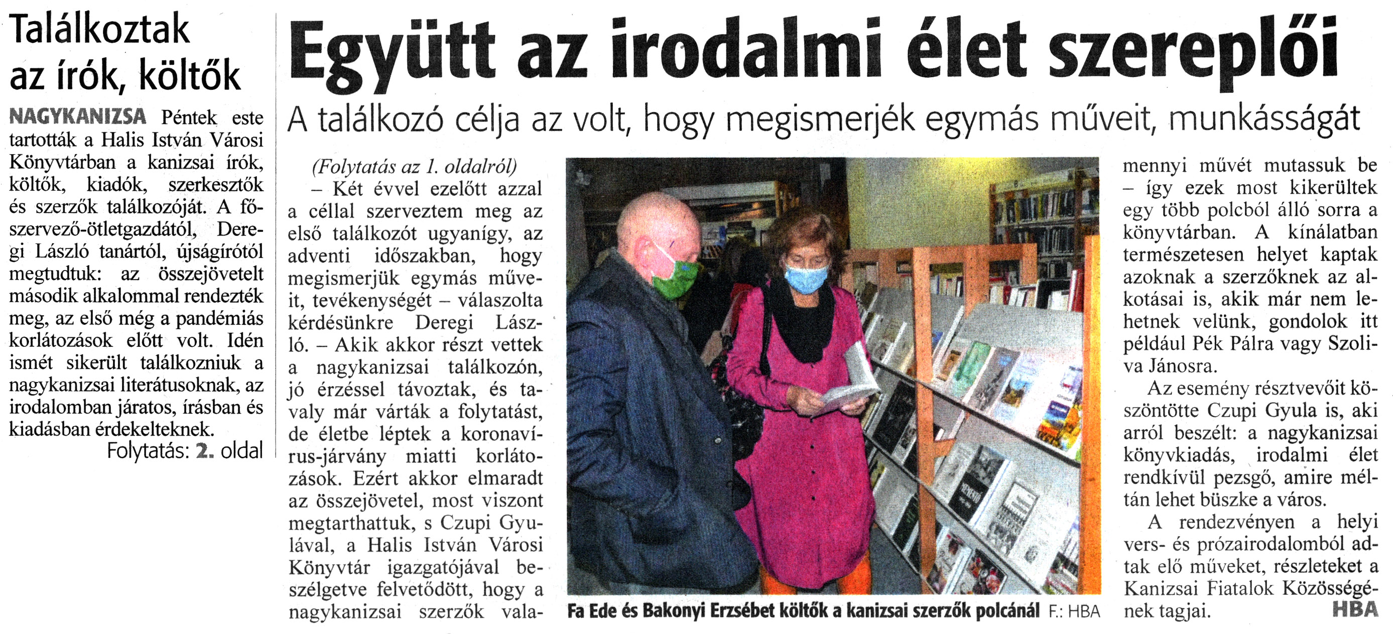 Nyilvános 954 | 1452 | Zalai Hírlap 2021. december 13. 288. szám 1, 2. oldal | Találkoztak az írók, költők NAGYKANIZSA Péntek este tartották a Halis István Városi Könyvtárban a kanizsai írók, költők, kiadók, szerkesztők és szerzők találkozóját. A főszervező-ötletgazdától, Deregi László tanártól, újságírótól megtudtuk: az összejövetelt második alkalommal rendezték meg, az első még a pandémiás korlátozások előtt volt. Idén ismét sikerült találkozniuk a nagykanizsai literátusoknak, az irodalomban járatos, írásban és kiadásban érdekelteknek. Folytatás: 2. oldal Együtt az irodalmi élet szereplői A találkozó célja az volt, hogy megismerjék egymás műveit, munkásságát (Folytatás az 1. oldalról) - Két évvel ezelőtt azzal a céllal szerveztem meg az első találkozót ugyanígy, az adventi időszakban, hogy megismerjük egymás müveit, tevékenységét - válaszolta kérdésünkre Deregi László. - Akik akkor részt vettek a nagykanizsai találkozón, jó érzéssel távoztak, és tavaly már várták a folytatást, de életbe léptek a koronavírus-járvány miatti korlátozások. Ezért akkor elmaradt az összejövetel, most viszont megtarthattuk, s Czupi Gyulával, a Halis István Városi Könyvtár igazgatójával beszélgetve felvetődött, hogy a nagykanizsai szerzők valamennyi müvét mutassuk be - így ezek most kikerültek egy több polcból álló sorra a könyvtárban. A kínálatban természetesen helyet kaptak azoknak a szerzőknek az alkotásai is, akik már nem lehetnek velünk, gondolok itt például Pék Pálra vagy Szoliva Jánosra. Az esemény résztvevőit köszöntötte Czupi Gyula is, aki arról beszélt: a nagykanizsai könyvkiadás, irodalmi élet rendkívül pezsgő, amire méltán lehet büszke a város. A rendezvényen a helyi vers- és prózairodalomból adtak elő műveket, részleteket a Kanizsai Fiatalok Közösségének tagjai. HBA Fa Ede és Bakonyi Erzsébet költők a kanizsai szerzők polcánál F : HBA |