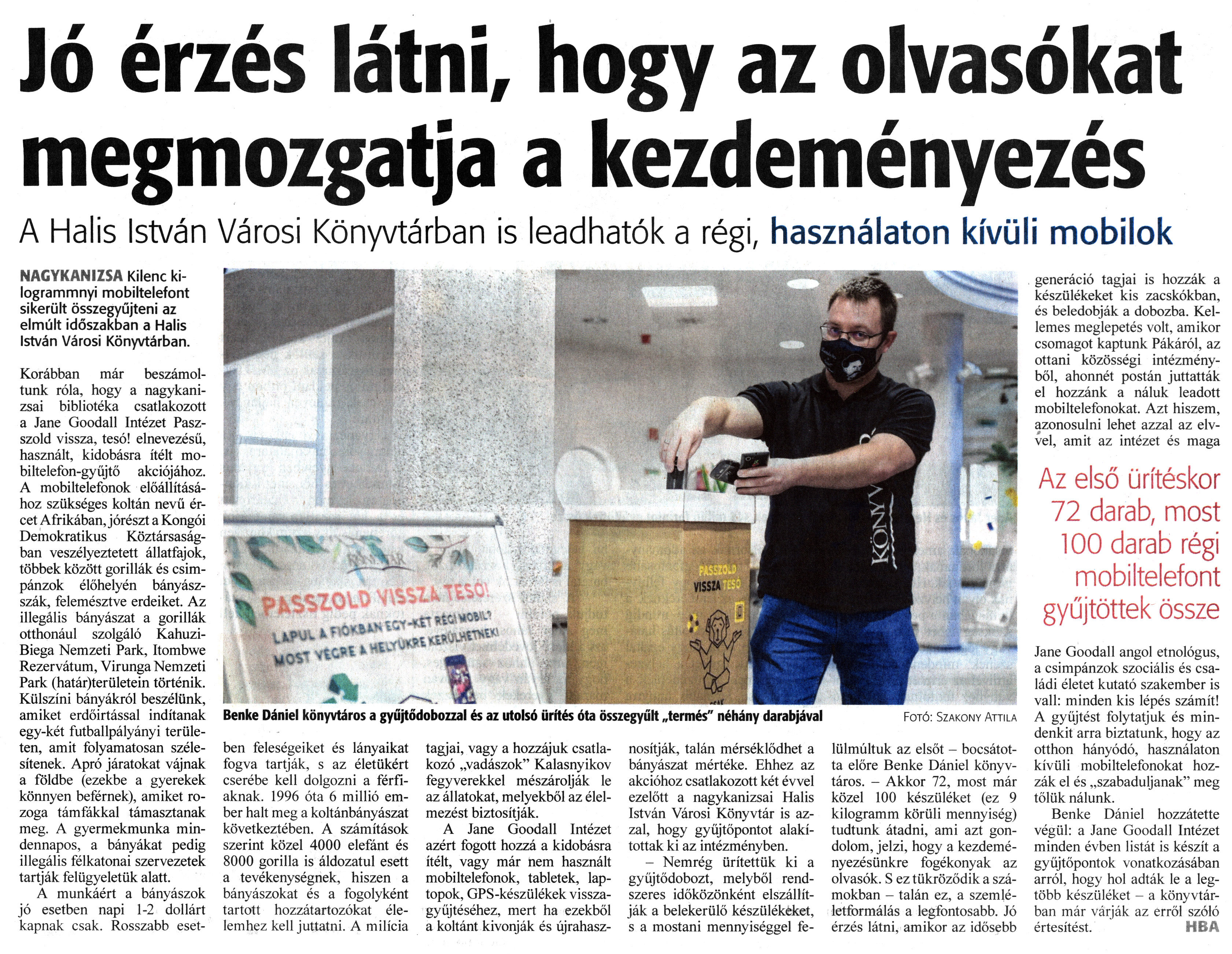 Nyilvános 1160 | 2211 | Zalai Hírlap 2021. december 21. 295. szám 5. oldal | Jó érzés látni, hogy az olvasókat megmozgatja a kezdeményezés A Halis István Városi Könyvtárban is leadhatók a régi, használaton kívüli mobilok NAGYKANIZSA Kilenc kilogrammnyi mobiltelefont sikerült összegyűjteni az elmúlt időszakban a Halis István Városi Könyvtárban. Korábban már beszámoltunk róla, hogy a nagykanizsai bibliotéka csatlakozott a Jane Goodall Intézet Passzold vissza, tesó! elnevezésű, használt, kidobásra ítélt mobiltelefon-gyűjtő akciójához. A mobiltelefonok előállításához szükséges koltán nevű ércet Afrikában, jórészt a Kongói Demokratikus Köztársaságban veszélyeztetett állatfajok, többek között gorillák és csimpánzok élőhelyén bányászszák, felemésztve erdeiket. Az illegális bányászat a gorillák otthonául szolgáló Kahuzi-Biega Nemzeti Park, Itombwe Rezervátum, Virunga Nemzeti Park határterületein történik. Külszíni bányákról beszélünk, amiket erdőirtással indítanak egy-két futballpályányi területen, amit folyamatosan szélesítenek. Apró járatokat vájnak a földbe (ezekbe a gyerekek könnyen beférnek), amiket rozoga támfákkal támasztanak meg. A gyermekmunka mindennapos, a bányákat pedig illegális félkatonai szervezetek tartják felügyeletük alatt. A munkáért a bányászok jó esetben napi 1-2 dollárt kapnak csak. Rosszabb esetben feleségeiket és lányaikat fogva tartják, s az életükért cserébe kell dolgozni a férfiaknak. 1996 óta 6 millió ember halt meg a koltánbányászat következtében. A számítások szerint közel 4000 elefánt és 8000 gorilla is áldozatul esett a tevékenységnek, hiszen a bányászokat és a fogolyként tartott hozzátartozókat élelemhez kell juttatni. A milícia tagjai, vagy a hozzájuk csatlakozó „vadászok" Kalasnyikov fegyverekkel mészárolják le az állatokat, melyekből az élelmezést biztosítják. A Jane Goodall Intézet azért fogott hozzá a kidobásra ítélt, vagy már nem használt mobiltelefonok, tabletek, laptopok, GPS-készülékek visszagyűjtéséhez, mert ha ezekből a koltánt kivonják és újrahasznosítják, talán mérséklődhet a bányászat mértéke. Ehhez az akcióhoz csatlakozott két évvel ezelőtt a nagykanizsai Halis István Városi Könyvtár is azzal, hogy gyűjtőpontot alakítottak ki az intézményben. - Nemrég ürítettük ki a gyűjtődobozt, melyből rendszeres időközönként elszállítják a belekerülő készülékeket, s a mostani mennyiséggel felülmúltuk az elsőt - bocsátotta előre Benke Dániel könyvtáros. - Akkor 72, most már közel 100 készüléket (ez 9 kilogramm körüli mennyiség) tudtunk átadni, ami azt gondolom, jelzi, hogy a kezdeményezésünkre fogékonyak az olvasók. S ez tükröződik a számokban - talán ez, a szemléletformálás a legfontosabb. Jó érzés látni, amikor az idősebb generáció tagjai is hozzák a készülékeket kis zacskókban, és beledobják a dobozba. Kellemes meglepetés volt, amikor csomagot kaptunk Pákáról, az ottani közösségi intézményből, ahonnét postán juttatták el hozzánk a náluk leadott mobiltelefonokat. Azt hiszem, azonosulni lehet azzal az elvvel, amit az intézet és maga Jane Goodall angol etnológus, a csimpánzok szociális és családi életet kutató szakember is vall: minden kis lépés számít! A gyűjtést folytatjuk és mindenkit arra biztatunk, hogy az otthon hányódó, használaton kívüli mobiltelefonokat hozzák el és „szabaduljanak" meg tőlük nálunk. Benke Dániel hozzátette végül: a Jane Goodall Intézet minden évben listát is készít a gyűjtőpontok vonatkozásában arról, hogy hol adták le a legtöbb készüléket - a könyvtárban már várják az erről szóló értesítést. HBA Benke Dániel könyvtáros a gyűjtődobozzal és az utolsó ürítés óta összegyűlt „termés" néhány darabjával Fotó: Szakony Attila |