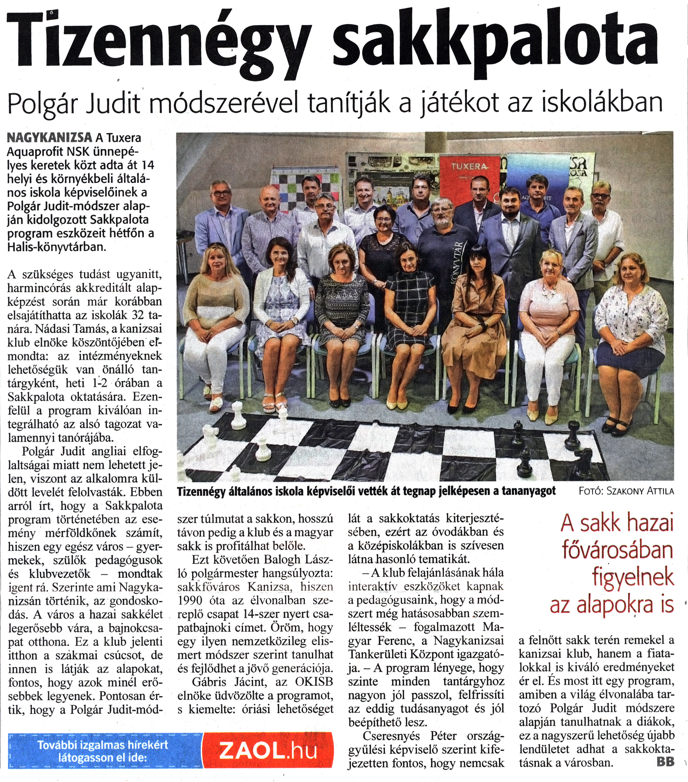 Nyilvános 1124 | 1428 | Zalai Hírlap 2022 szeptember 6. 207. szám 13. oldal | Tizennégy sakkpalota Polgár Judit módszerével tanítják a játékot az iskolákban NAGYKANIZSA A Tuxera Aquaprofit NSK ünnepélyes keretek közt adta át 14 helyi és környékbeli általános iskola képviselőinek a Polgár Judit-módszer alapján kidolgozott Sakkpalota program eszközeit hétfőn a Halis-könyvtárban. A szükséges tudást ugyanitt, harmincórás akkreditált alapképzést során már korábban elsajátíthatta az iskolák 32 tanára. Nádasi Tamás, a kanizsai klub elnöke köszöntőjében elmondta: az intézményeknek lehetőségük van önálló tantárgyként, heti 1-2 órában a Sakkpalota oktatására. Ezenfelül a program kiválóan integrálható az alsó tagozat valamennyi tanórájába. Polgár Judit angliai elfoglaltságai miatt nem lehetett jelen, viszont az alkalomra küldött levelét felolvasták. Ebben arról írt, hogy a Sakkpalota program történetében az esemény mérföldkőnek számít, hiszen egy egész város - gyermekek, szülők pedagógusok és klubvezetők - mondtak igent rá. Szerinte ami Nagykanizsán történik, az gondoskodás. A város a hazai sakkélet legerősebb vára, a bajnokcsapat otthona. Ez a klub jelenti itthon a szákmai csúcsot, de innen is látják az alapokat, fontos, hogy azok minél erősebbek legyenek. Pontosan értik, hogy a Polgár Judit-módszer túlmutat a sakkon, hosszú távon pedig a klub és a magyar sakk is profitálhat belőle. Ezt követően Balogh László polgármester hangsúlyozta: sakkfőváros Kanizsa, hiszen 1990 óta az élvonalban szereplő csapat 14-szer nyert csapatbajnoki címet. Öröm, hogy egy ilyen nemzetközileg elismert módszer szerint tanulhat és fejlődhet a jövő generációja. Gábris Jácint, az OKISB elnöke üdvözölte a programot, s kiemelte: óriási lehetőséget lát a sakkoktatás kiterjesztésében, ezért az óvodákban és a középiskolákban is szívesen látna hasonló tematikát. - A klub felajánlásának hála interaktív eszközöket kapnak a pedagógusaink, hogy a módszert még hatásosabban szemléltessék - fogalmazott Magyar Ferenc, a Nagykanizsai Tankerületi Központ igazgatója. - A program lényege, hogy szinte minden tantárgyhoz nagyon jól passzol, felfrissíti az eddig tudásanyagot és jól beépíthető lesz. Cseresnyés Péter országgyűlési képviselő szerint kifejezetten fontos, hogy nemcsak a felnőtt sakk terén remekel a kanizsai klub, hanem a fiatalokkal is kiváló eredményeket ér el. És most itt egy program, amiben a világ élvonalába tartozó Polgár Judit módszere alapján tanulhatnak a diákok, ez a nagyszerű lehetőség újabb lendületet adhat a sakkoktatásnak a városban. BB Tizennégy általános iskola képviselői vették át tegnap jelképesen a tananyagot Fotó: Szakony Attila |