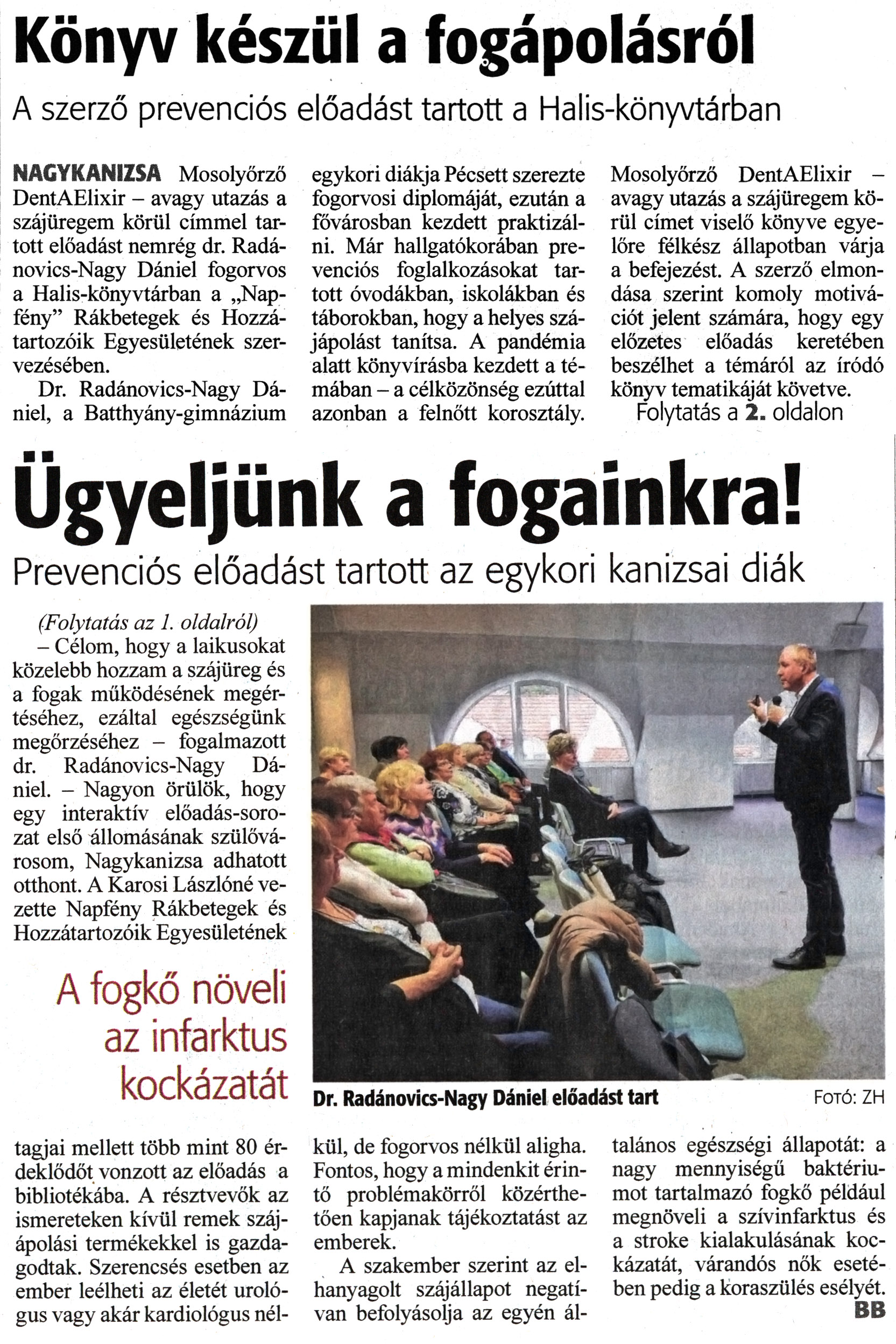 Nyilvános 1117 | 1533 | Zalai Hírlap 2022. november 30. 279. szám 1, 2. oldal | Könyv készül a fogápolásról A szerző prevenciós előadást tartott a Halis-könyvtárban NAGYKANIZSA Mosolyőrző DentAElixir - avagy utazás a szájüregem körül címmel tartott előadást nemrég dr. Radánovics-Nagy Dániel fogorvos a Halis-könyvtárban a „Napfény" Rákbetegek és Hozzátartozóik Egyesületének szervezésében. Dr. Radánovics-Nagy Dániel, a Batthyány-gimnázium egykori diákja Pécsett szerezte fogorvosi diplomáját, ezután a fővárosban kezdett praktizálni. Már hallgatókorában prevenciós foglalkozásokat tartott óvodákban, iskolákban és táborokban, hogy a helyes szájápolást tanítsa. A pandémia alatt könyvírásba kezdett a témában - a célközönség ezúttal azonban a felnőtt korosztály. Mosolyőrző DentAElixir - avagy utazás a szájüregem körül címet viselő könyve egyelőre félkész állapotban várja a befejezést. A szerző elmondása szerint komoly motivációt jelent számára, hogy egy előzetes előadás keretében beszélhet a témáról az íródó könyv tematikáját követve. Folytatás a 2. oldalon Ügyeljünk a fogainkra! Prevenciós előadást tartott az egykori kanizsai diák (Folytatás az 1. oldalról) - Célom, hogy a laikusokat közelebb hozzam a szájüreg és a fogak működésének megértéséhez, ezáltal egészségünk megőrzéséhez - fogalmazott dr. Radánovics-Nagy Dániel. - Nagyon örülök, hogy egy interaktív előadás-sorozat első állomásának szülővárosom, Nagykanizsa adhatott otthont. A Karosi Lászlóné vezette Napfény Rákbetegek és Hozzátartozóik Egyesületének tagjai mellett több mint 80 érdeklődőt vonzott az előadás a bibliotékába. A résztvevők az ismereteken kívül remek szájápolási termékekkel is gazdagodtak. Szerencsés esetben az ember leélheti az életét urológus vagy akár kardiológus nélkül, de fogorvos nélkül aligha. Fontos, hogy a mindenkit érintő problémakörről közérthetően kapjanak tájékoztatást az emberek. A szakember szerint az elhanyagolt szájállapot negatívan befolyásolja az egyén általános egészségi állapotát: a nagy mennyiségű baktériumot tartalmazó fogkő például megnöveli a szívinfarktus és a stroke kialakulásának kockázatát, várandós nők esetében pedig a koraszülés esélyét. BB Dr. Radánovics-Nagy Dániel előadást tart Fotó: ZH |