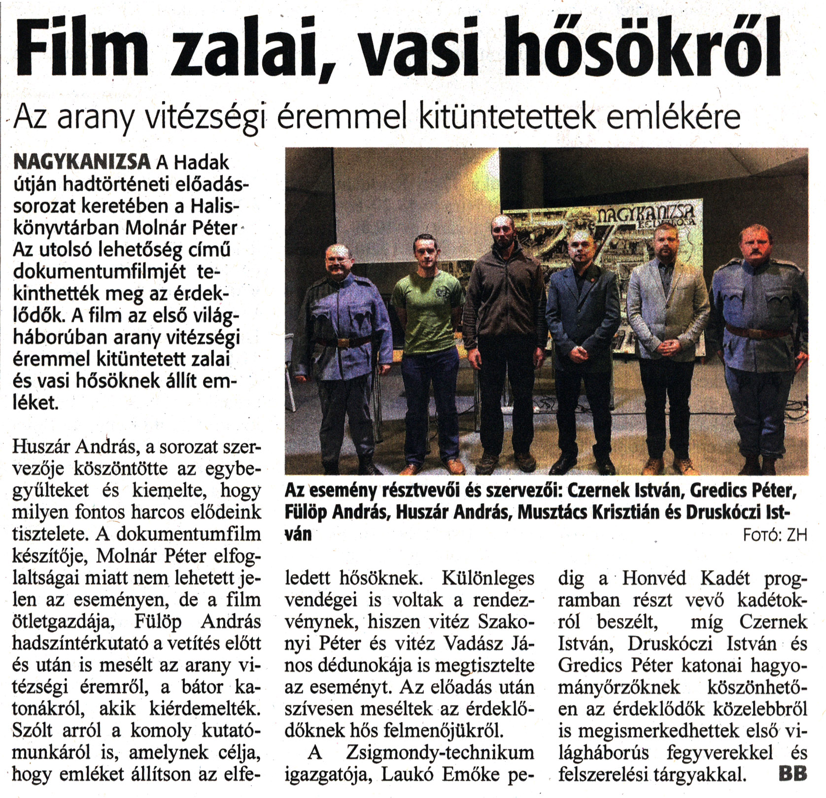 Nyilvános 1068 | 3320 | Zalai Hírlap 2022. december 14. 291. szám 5. oldal | Film zalai, vasi hősökről Az arany vitézségi éremmel kitüntetettek emlékére NAGYKANIZSA A Hadak útján hadtörténeti előadássorozat keretében a Halis-könyvtárban Molnár Péter Az utolsó lehetőség című dokumentumfilmjét tekinthették meg az érdeklődők. A film az első világháborúban arany vitézségi éremmel kitüntetett zalai és vasi hősöknek állít emléket. Huszár András, a sorozat szervezője köszöntötte az egybegyűlteket és kiemelte, hogy milyen fontos harcos elődeink tisztelete. A dokumentumfilm készítője, Molnár Péter elfoglaltságai miatt nem lehetett jelen az eseményen, de a film ötletgazdája, Fülöp András hadszíntérkutató a vetítés előtt és után is mesélt az arany vitézségi éremről, a bátor katonákról, akik kiérdemelték. Szólt arról a komoly kutatómunkáról is, amelynek célja, hogy emléket állítson az elfe- ledett hősöknek. Különleges vendégei is voltak a rendezvénynek, hiszen vitéz Szakonyi Péter és vitéz Vadász János dédunokája is megtisztelte az eseményt. Az előadás után szívesen meséltek az érdeklődőknek hős felmenőjükről. A Zsigmondy-technikum igazgatója, Laukó Emőke pedig a Honvéd Kadét programban részt vevő kadétokról beszélt, míg Czernek István, Druskóczi István és Gredics Péter katonai hagyományőrzőknek köszönhetően az érdeklődők közelebbről is megismerkedhettek első világháborús fegyverekkel és felszerelési tárgyakkal. BB Az esemény résztvevői és szervezői: Czernek István, Gredics Péter, Fülöp András, Huszár András, Musztács Krisztián és Druskóczi István Fotó: ZH |