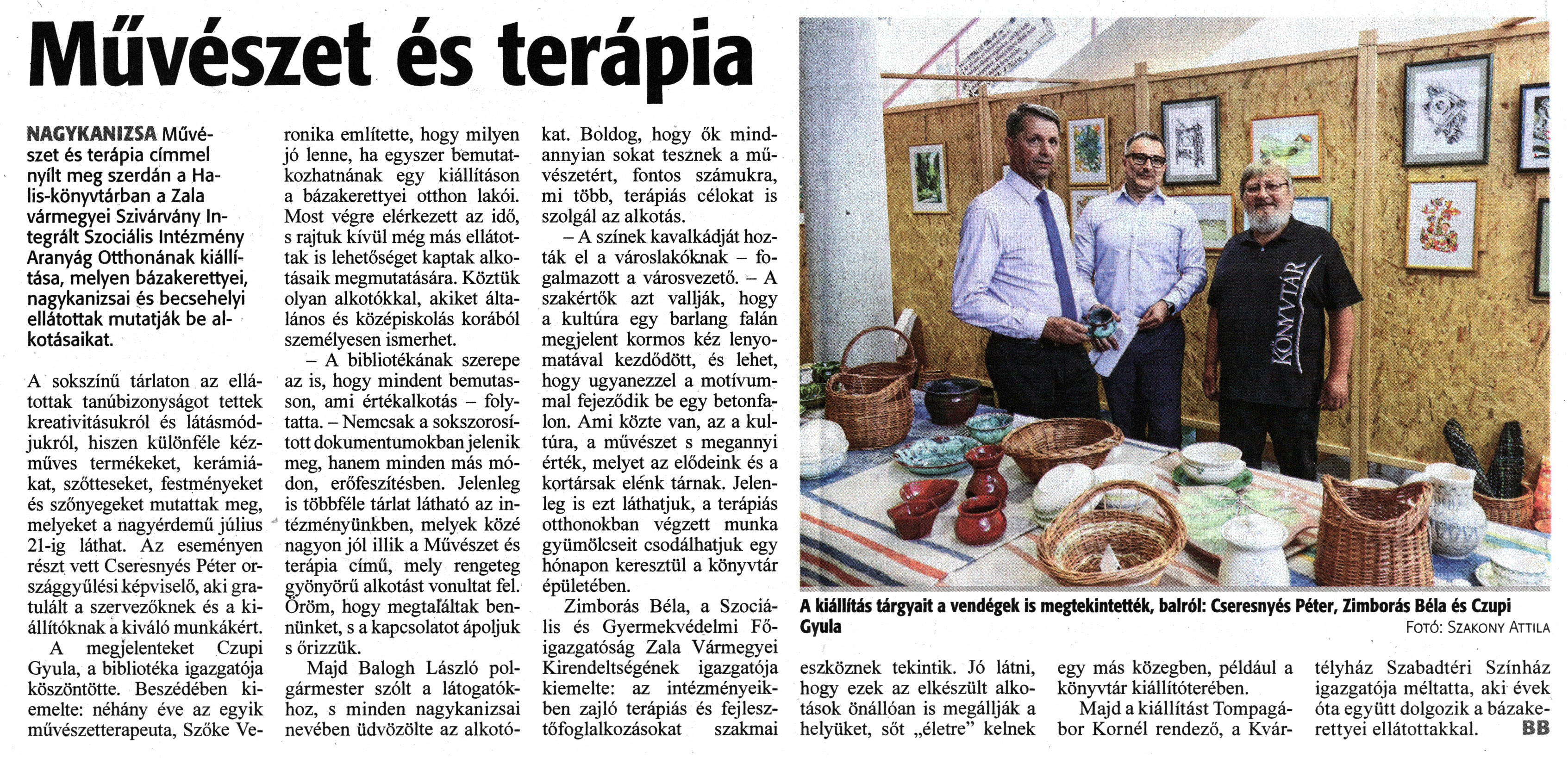 Nyilvános 1076 | 1583 | Zalai Hírlap 2023. június 22. 143. szám 5. oldal | Művészet és terápia NAGYKANIZSA Művészet és terápia címmel nyílt meg szerdán a Halis-könyvtárban a Zala vármegyei Szivárvány Integrált Szociális Intézmény Aranyág Otthonának kiállítása, melyen bázakerettyei, nagykanizsai és becsehelyi ellátottak mutatják be alkotásaikat. A sokszínű tárlaton az ellátottak tanúbizonyságot tettek kreativitásukról és látásmódjukról, hiszen különféle kézműves termékeket, kerámiákat, szőtteseket, festményeket és szőnyegeket mutattak meg, melyeket a nagyérdemű július 21-ig láthat. Az eseményen részt vett Cseresnyés Péter országgyűlési képviselő, aki gratulált a szervezőknek és a kiállítóknak a kiváló munkákért. A megjelenteket Czupi Gyula, a bibliotéka igazgatója köszöntötte. Beszédében kiemelte: néhány éve az egyik művészetterapeuta, Szőke Veronika említette, hogy milyen jó lenne, ha egyszer bemutatkozhatnának egy kiállításon a bázakerettyei otthon lakói. Most végre elérkezett az idő, s rajtuk kívül még más ellátottak is lehetőséget kaptak alkotásaik megmutatására. Köztük olyan alkotókkal, akiket általános és középiskolás korából személyesen ismerhet. - A bibliotékának szerepe az is, hogy mindent bemutasson, ami értékalkotás - folytatta. - Nemcsak a sokszorosított dokumentumokban jelenik meg, hanem minden más módon, erőfeszítésben. Jelenleg is többféle tárlat látható az intézményünkben, melyek közé nagyon jól illik a Művészet és terápia című, mely rengeteg gyönyörű alkotást vonultat fel. Öröm, hogy megtaláltak bennünket, s a kapcsolatot ápoljuk s őrizzük. Majd Balogh László polgármester szólt a látogatókhoz, s minden nagykanizsai nevében üdvözölte az alkotókat. Boldog, hogy ők mindannyian sokat tesznek a művészetért, fontos számukra, mi több, terápiás célokat is szolgál az alkotás. - A színek kavalkádját hozták el a városlakóknak - fogalmazott a városvezető. - A szakértők azt vallják, hogy a kultúra egy barlang falán megjelent kormos kéz lenyomatával kezdődött, és lehet, hogy ugyanezzel a motívummal fejeződik be egy betonfalon. Ami közte van, az a kultúra, a művészet s megannyi érték, melyet az elődeink és a kortársak elénk tárnak. Jelenleg is ezt láthatjuk, a terápiás otthonokban végzett munka gyümölcseit csodálhatjuk egy hónapon keresztül a könyvtár épületében. Zimborás Béla, a Szociális és Gyermekvédelmi Főigazgatóság Zala Vármegyei Kirendeltségének igazgatója kiemelte: az intézményeikben zajló terápiás és fejlesztőfoglalkozásokat szakmai eszköznek tekintik. Jó látni, hogy ezek az elkészült alkotások önállóan is megállják a helyüket, sőt „életre" kelnek egy más közegben, például a könyvtár kiállítóterében. Majd a kiállítást Tompagábor Kornél rendező, a Kvártélyház Szabadtéri Színház igazgatója méltatta, aki évek óta együtt dolgozik a bázakerettyei ellátottakkal. BB A kiállítás tárgyait a vendégek is megtekintették, balról: Cseresnyés Péter, Zimborás Béla és Czupi Gyula Fotó: Szakony Attila |