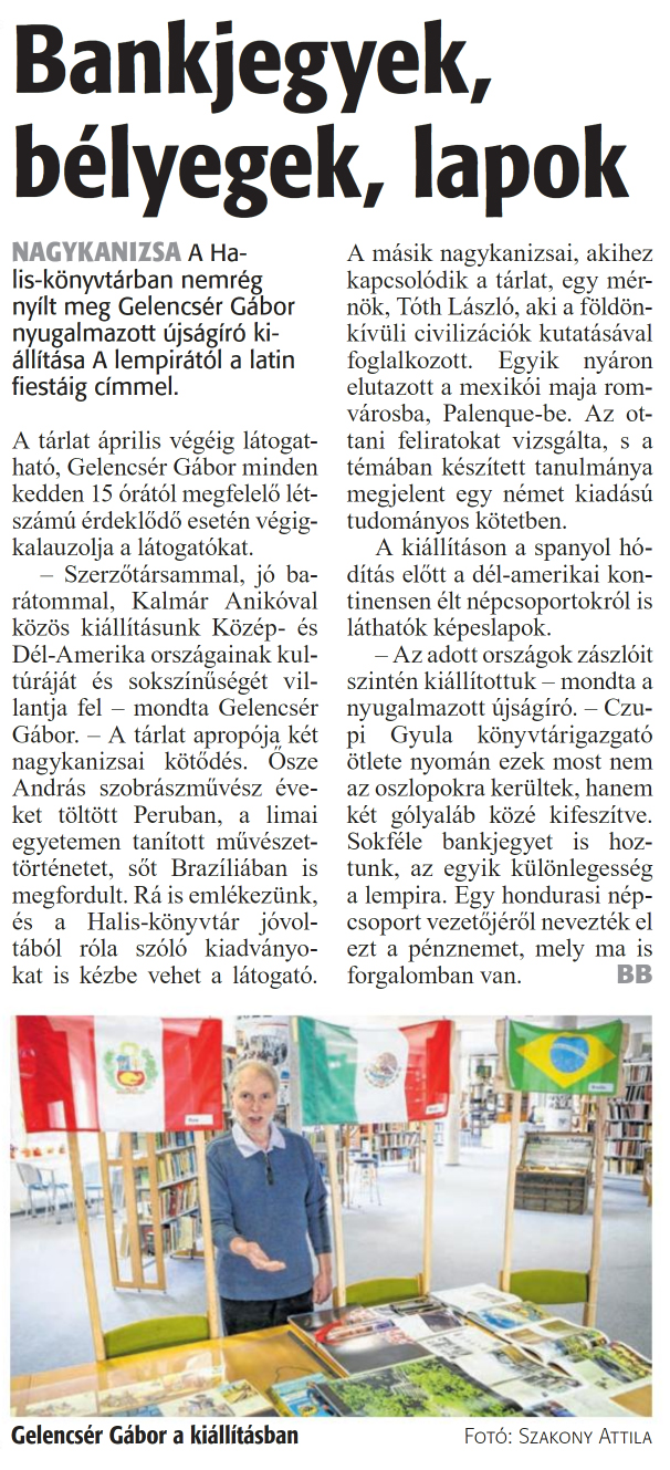 Nyilvános 978 | 1582 | Zalai Hírlap 2024. április 4. 78. szám 6. oldal | Bankjegyek, bélyegek, lapok NAGYKANIZSA A Halis-könyvtárban nemrég nyílt meg Gelencsér Gábor nyugalmazott újságíró kiállítása A lempirától a latin fiestáig címmel. A tárlat április végéig látogatható, Gelencsér Gábor minden kedden 15 órától megfelelő létszámú érdeklődő esetén végigkalauzolja a látogatókat. - Szerzőtársammal, jó barátommal, Kalmár Anikóval közös kiállításunk Közép- és Dél-Amerika országainak kultúráját és sokszínűségét villantja fel - mondta Gelencsér Gábor. - A tárlat apropója két nagykanizsai kötődés. Ősze András szobrászművész éveket töltött Peruban, a limai egyetemen tanított művészettörténetet, sőt Brazíliában is megfordult. Rá is emlékezünk, és a Halis-könyvtár jóvoltából róla szóló kiadványokat is kézbe vehet a látogató. A másik nagykanizsai, akihez kapcsolódik a tárlat, egy mérnök, Tóth László, aki a földönkívüli civilizációk kutatásával foglalkozott. Egyik nyáron elutazott a mexikói maja romvárosba, Palenque-be. Az ottani feliratokat vizsgálta, s a témában készített tanulmánya megjelent egy német kiadású tudományos kötetben. A kiállításon a spanyol hódítás előtt a dél-amerikai kontinensen élt népcsoportokról is láthatók képeslapok. - Az adott országok zászlóit szintén kiállítottuk - mondta a nyugalmazott újságíró. - Czupi Gyula könyvtárigazgató ötlete nyomán ezek most nem az oszlopokra kerültek, hanem két gólyaláb közé kifeszítve. Sokféle bankjegyet is hoztunk, az egyik különlegesség a lempira. Egy hondurasi népcsoport vezetőjéről nevezték el ezt a pénznemet, mely ma is forgalomban van. BB Gelencsér Gábor a kiállításban Fotó: Szakony Attila |