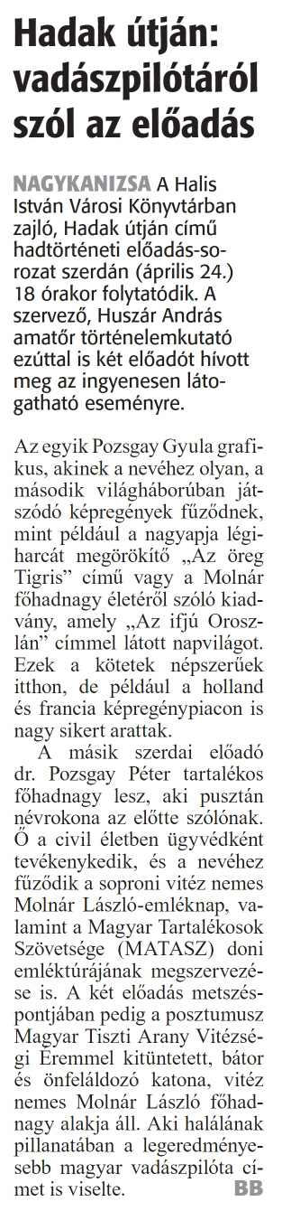 Nyilvános 947 | 1465 | Zalai Hírlap 2024 április 24. 94. szám 2. oldal | Hadak útján: vadászpilótáról szól az előadás NAGYKANIZSA A Halis István Városi Könyvtárban zajló, Hadak útján című hadtörténeti előadás-sorozat szerdán (április 24.) 18 órakor folytatódik. A szervező, Huszár András amatőr történelemkutató ezúttal is két előadót hívott meg az ingyenesen látogatható eseményre. Az egyik Pozsgay Gyula grafikus, akinek a nevéhez olyan, a második világháborúban játszódó képregények fűződnek, mint például a nagyapja légiharcát megörökítő „Az öreg Tigris" című vagy a Molnár főhadnagy életéről szóló kiadvány, amely „Az ifjú Oroszlán" címmel látott napvilágot. Ezek a kötetek népszerűek itthon, de például a holland és francia képregénypiacon is nagy sikert arattak. A másik szerdai előadó dr. Pozsgay Péter tartalékos főhadnagy lesz, aki pusztán névrokona az előtte szólónak. Ő a civil életben ügyvédként tevékenykedik, és a nevéhez fűződik a soproni vitéz nemes Molnár László-emléknap, valamint a Magyar Tartalékosok Szövetsége (MATASZ) doni emléktúrájának megszervezése is. A két előadás metszéspontjában pedig a posztumusz Magyar Tiszti Arany Vitézségi Eremmel kitüntetett, bátor és önfeláldozó katona, vitéz nemes Molnár László főhadnagy alakja áll. Aki halálának pillanatában a legeredményesebb magyar vadászpilóta címet is viselte. BB |